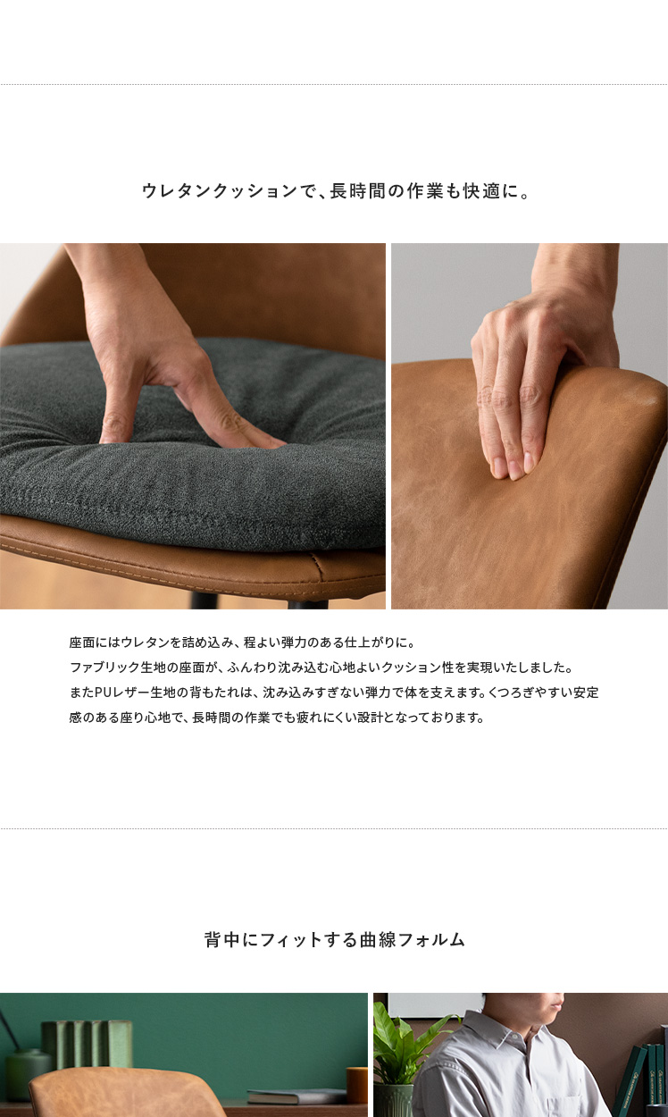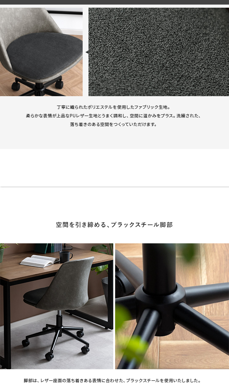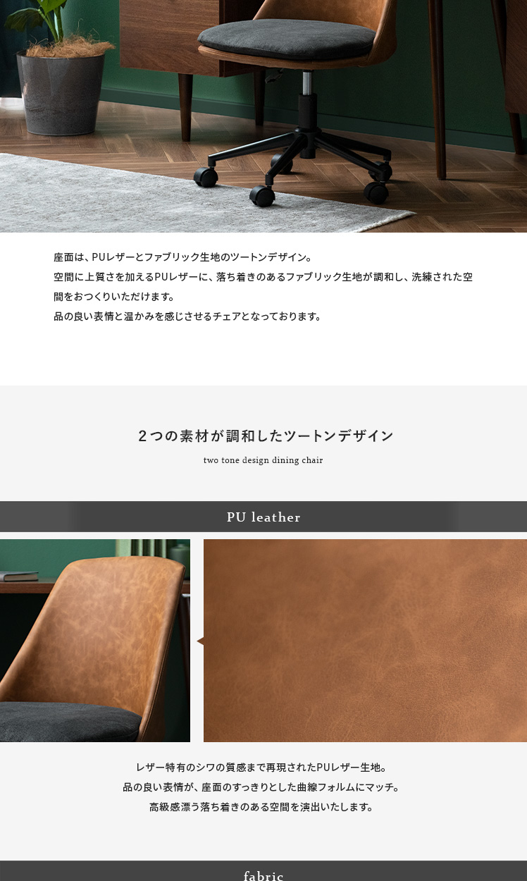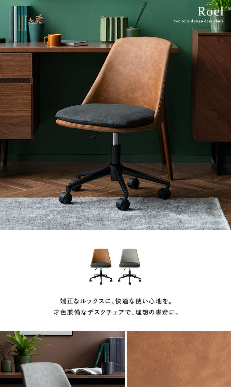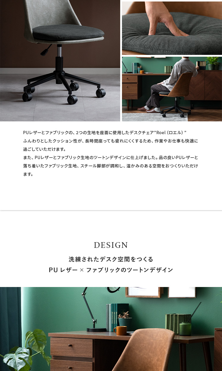 デスクチェア Roel〔ロエル〕 /PUレザーとファブリックの、2つの生地を座面に使用したデスクチェア”Roel(ロエル)”ふんわりとしたクッション性が、長時間座っても疲れにくくするため、作業やお仕事も快適に過ごしていただけます。また、PUレザーとファブリック生地のツートンデザインに仕上げました。品の良いPUレザーと落ち着いたファブリック生地、スチール脚部が調和し、温かみのある空間をおつくりいただけます。