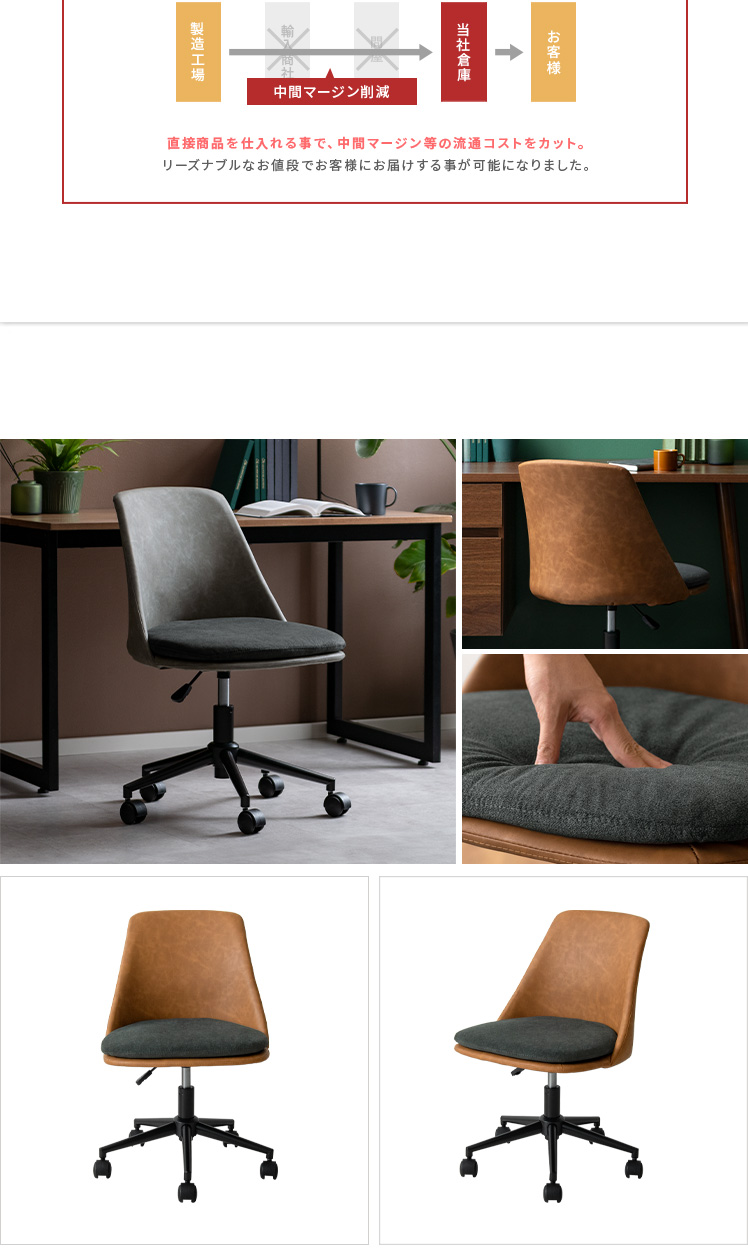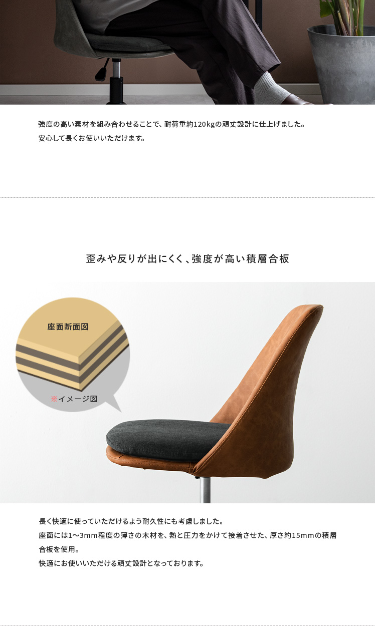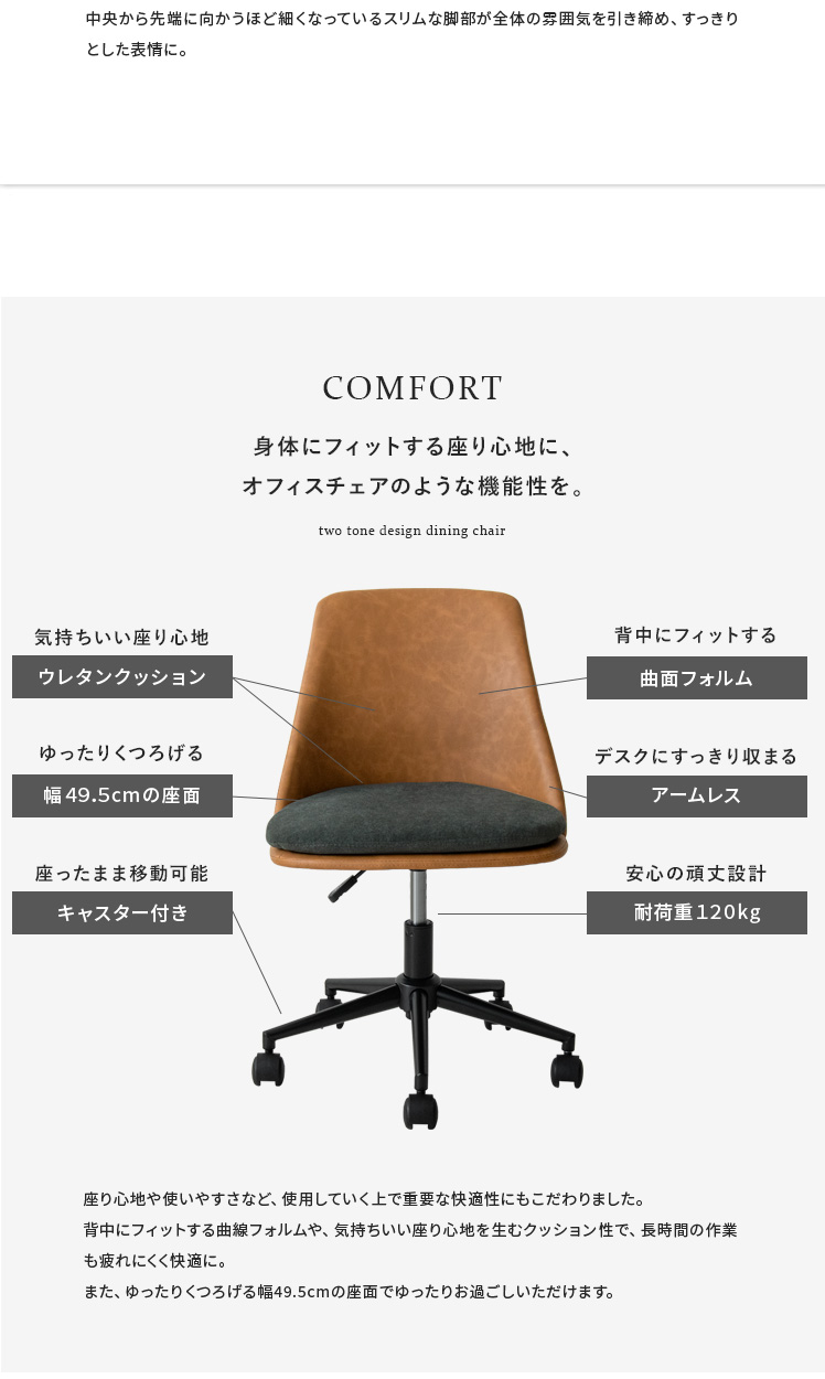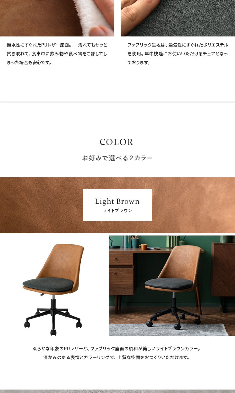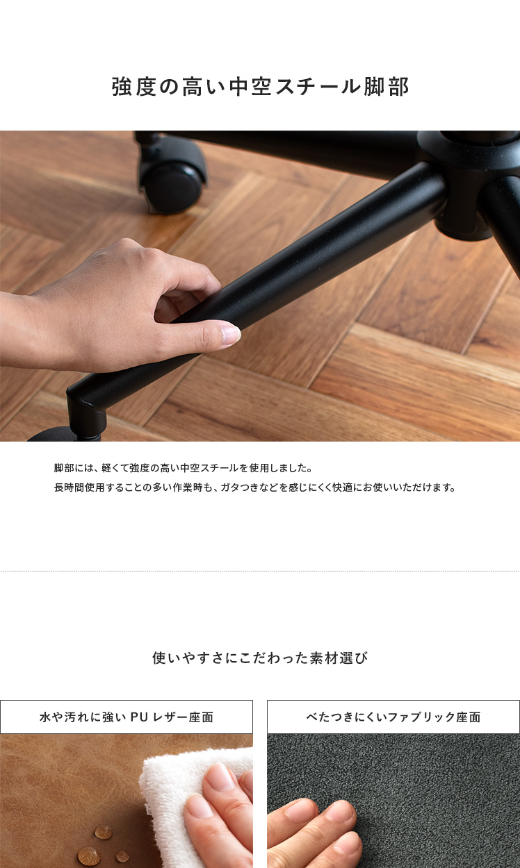 デスクチェア Roel〔ロエル〕 /PUレザーとファブリックの、2つの生地を座面に使用したデスクチェア”Roel(ロエル)”ふんわりとしたクッション性が、長時間座っても疲れにくくするため、作業やお仕事も快適に過ごしていただけます。また、PUレザーとファブリック生地のツートンデザインに仕上げました。品の良いPUレザーと落ち着いたファブリック生地、スチール脚部が調和し、温かみのある空間をおつくりいただけます。