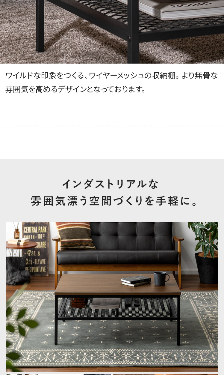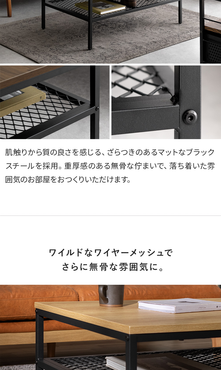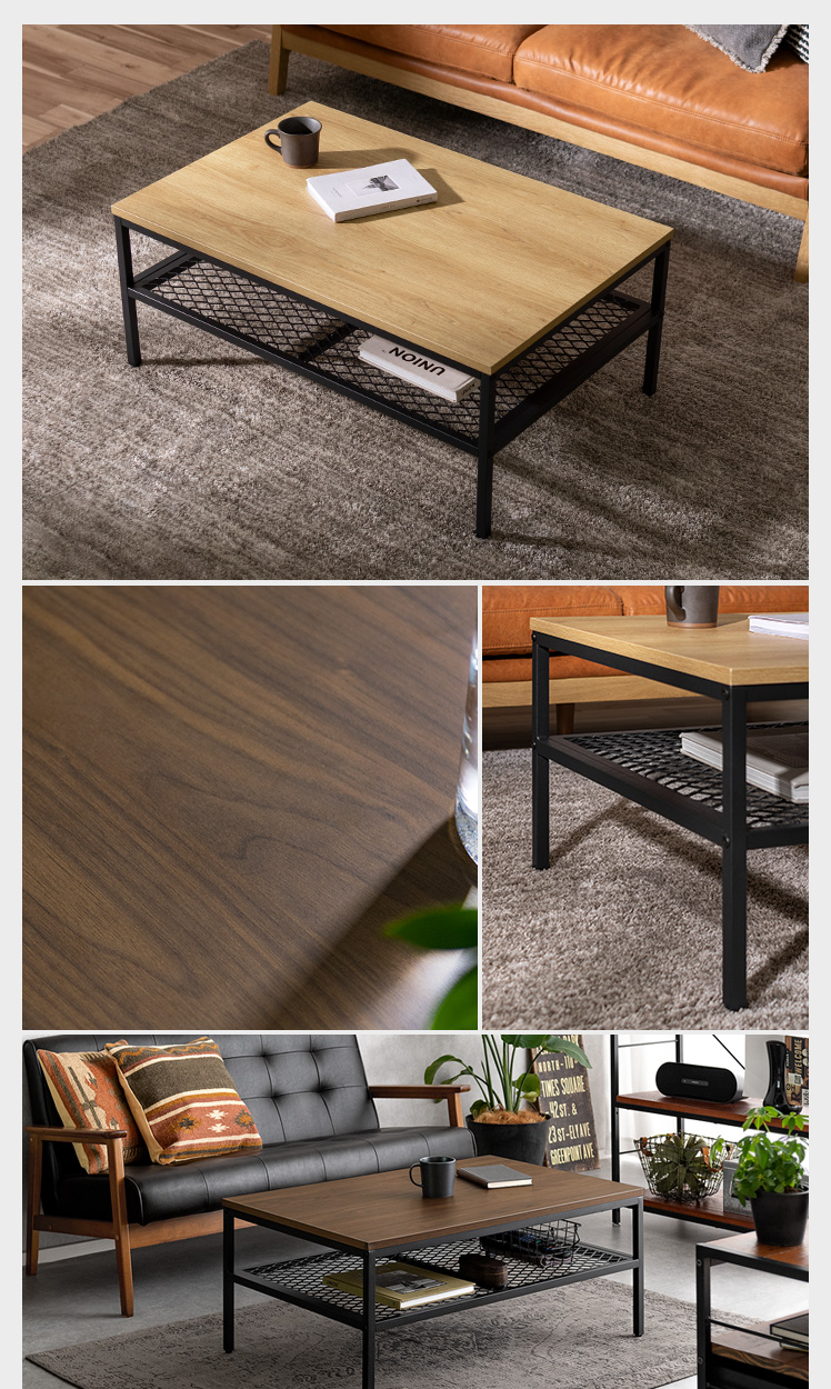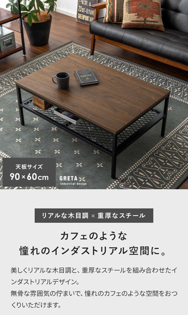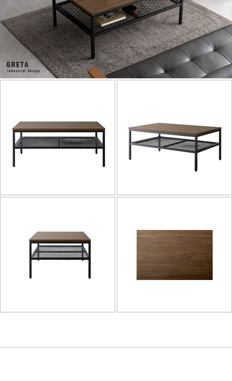 メッシュ棚付きリビングテーブルGRETA〔グレタ〕/美しくリアルな木目調と、重厚なスチールを組み合わせたインダストリアルデザイン。無骨な雰囲気の佇まいで、憧れのカフェのような空間をおつくりいただけます。
