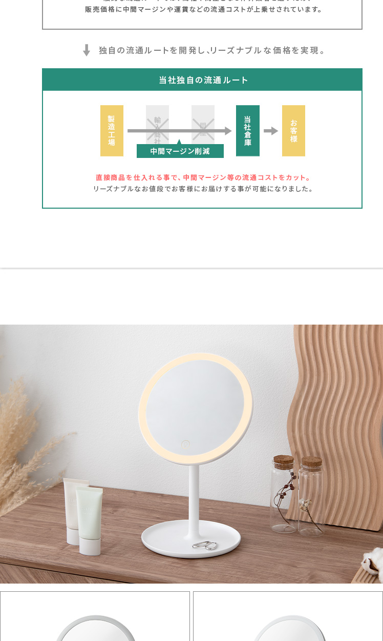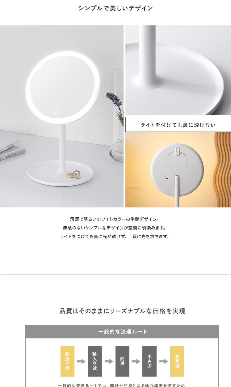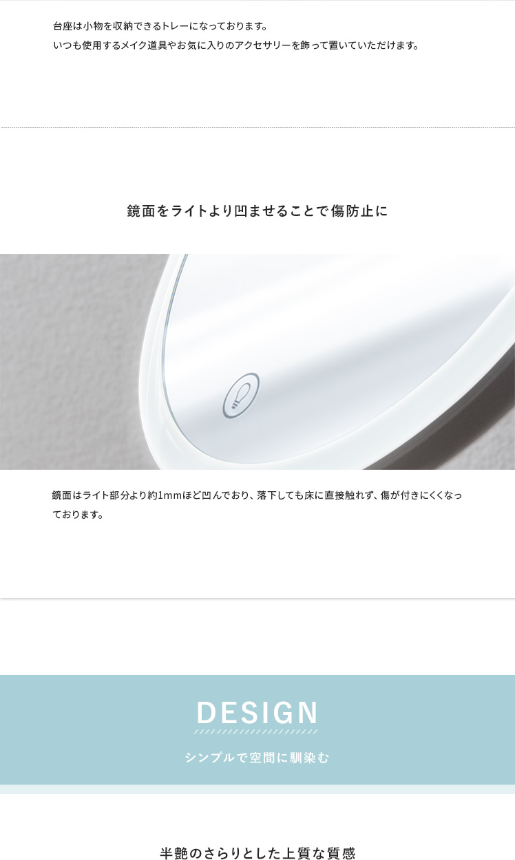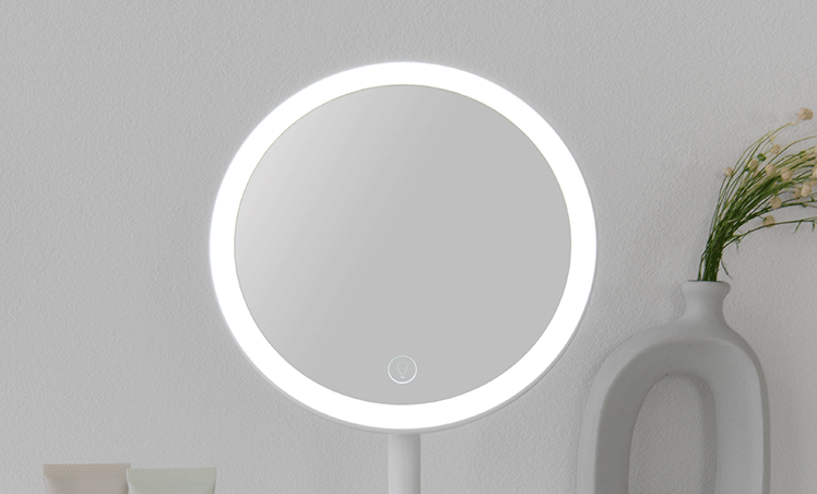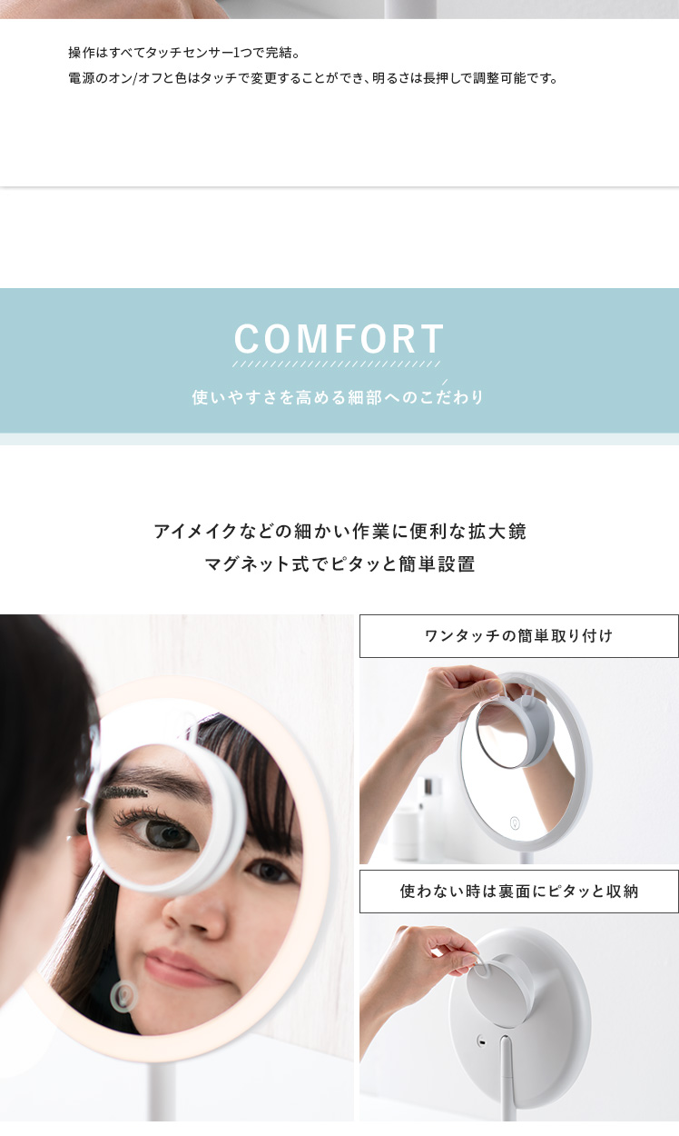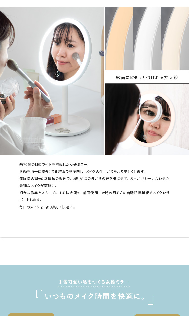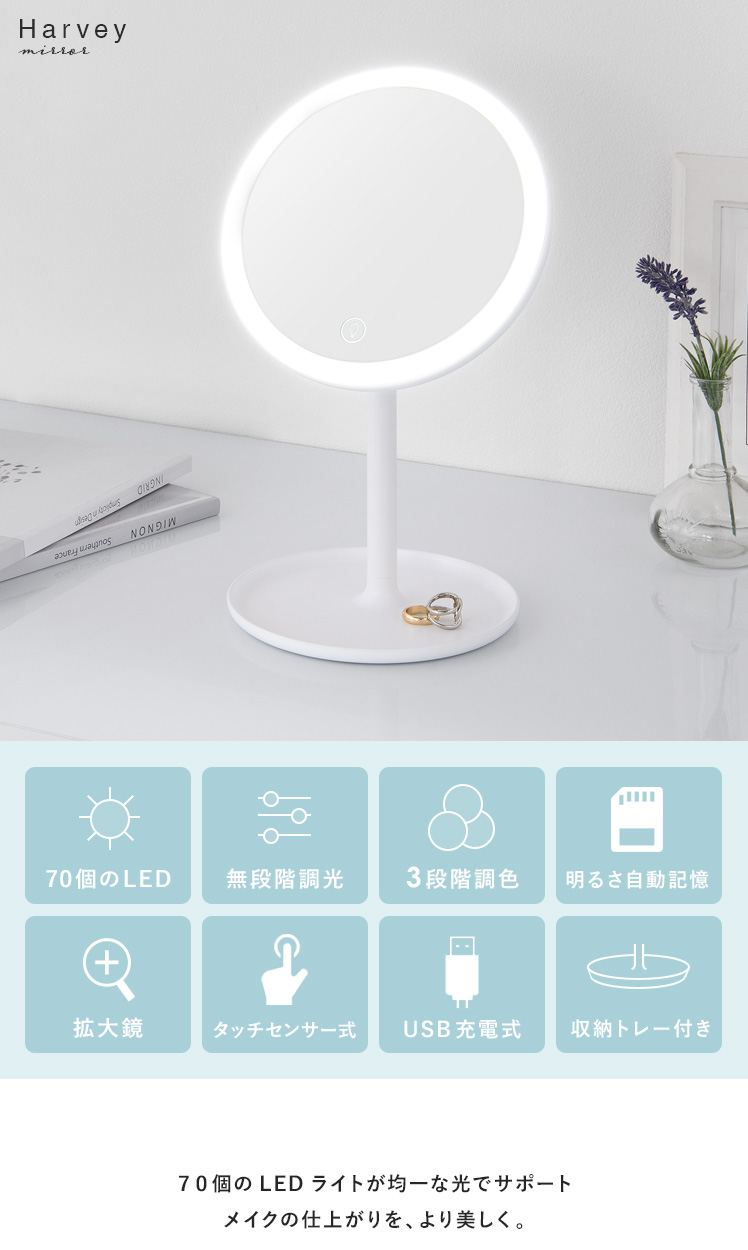 女優ミラー Harvey〔ハーヴィ〕円形タイプ/約70個のLEDライトを搭載した女優ミラー。お顔を均一に照らして化粧ムラを予防し、メイクの仕上がりをより美しくします。無段階の調光と3種類の調色で、照明や窓の外からの光を気にせず、お出かけシーン合わせた最適なメイクが可能に。細かな作業をスムーズにする拡大鏡や、前回使用した時の明るさの自動記憶機能でメイクをサポートします。毎日のメイクを、より美しく快適に。