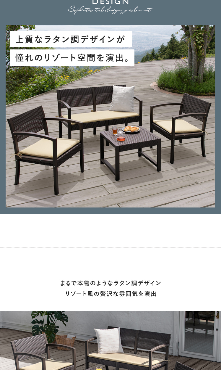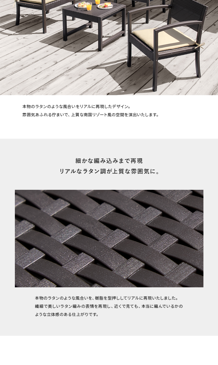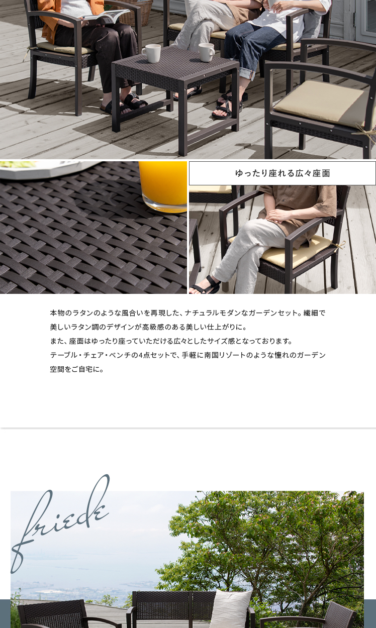 ガーデンリビング4点セット Friede〔フリーデ〕/本物のラタンのような風合いを再現した、ナチュラルモダンなガーデンセット。繊細で美しいラタン調のデザインが高級感のある美しい仕上がりに。また、座面はゆったり座っていただける広々としたサイズ感となっております。テーブル・チェア・ベンチの4点セットで、手軽に南国リゾートのような憧れのガーデン空間をご自宅に。