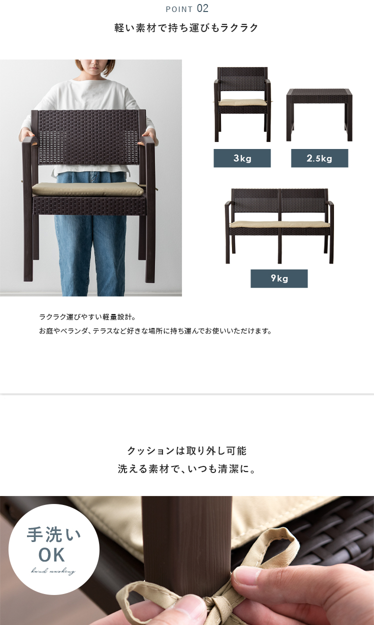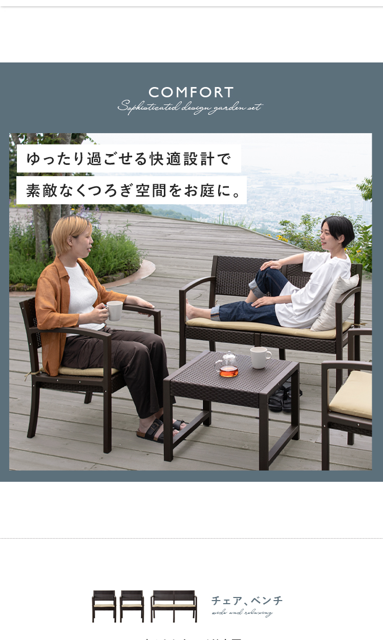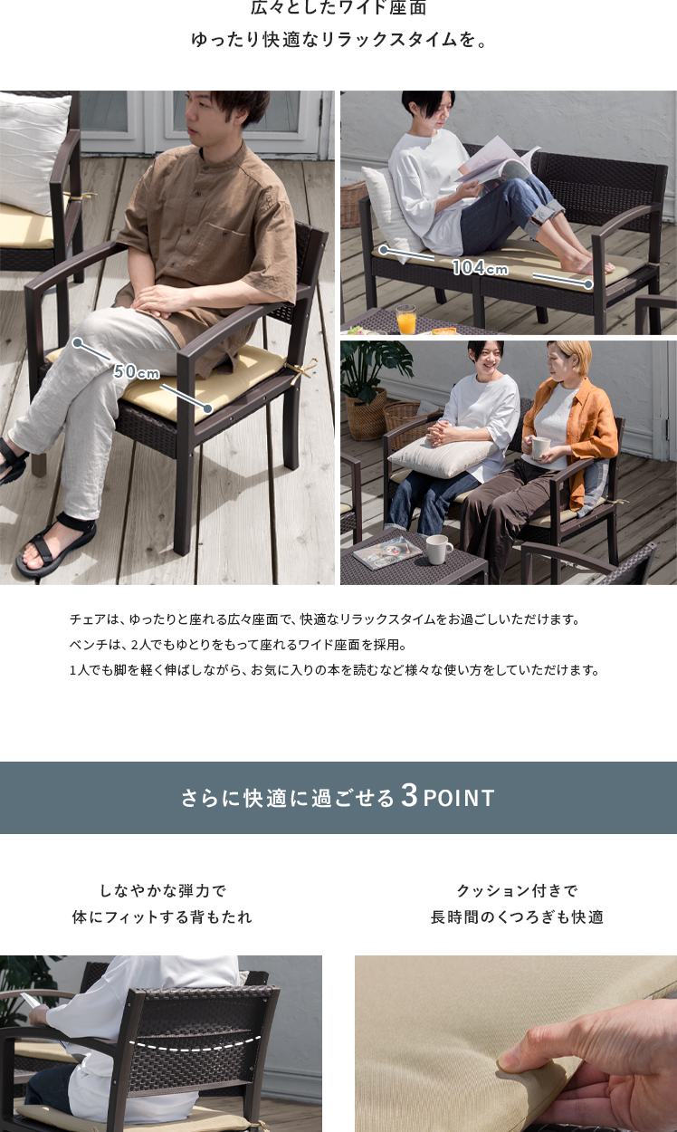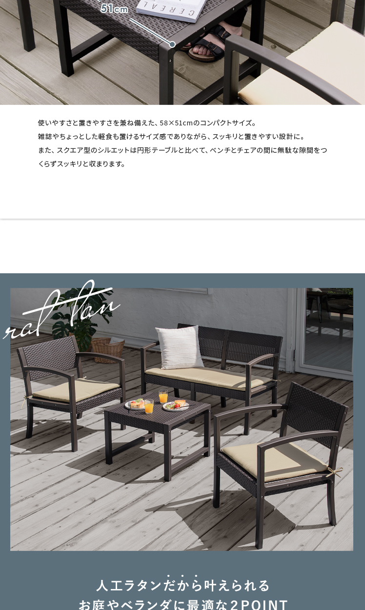 ガーデンリビング4点セット Friede〔フリーデ〕/本物のラタンのような風合いを再現した、ナチュラルモダンなガーデンセット。繊細で美しいラタン調のデザインが高級感のある美しい仕上がりに。また、座面はゆったり座っていただける広々としたサイズ感となっております。テーブル・チェア・ベンチの4点セットで、手軽に南国リゾートのような憧れのガーデン空間をご自宅に。