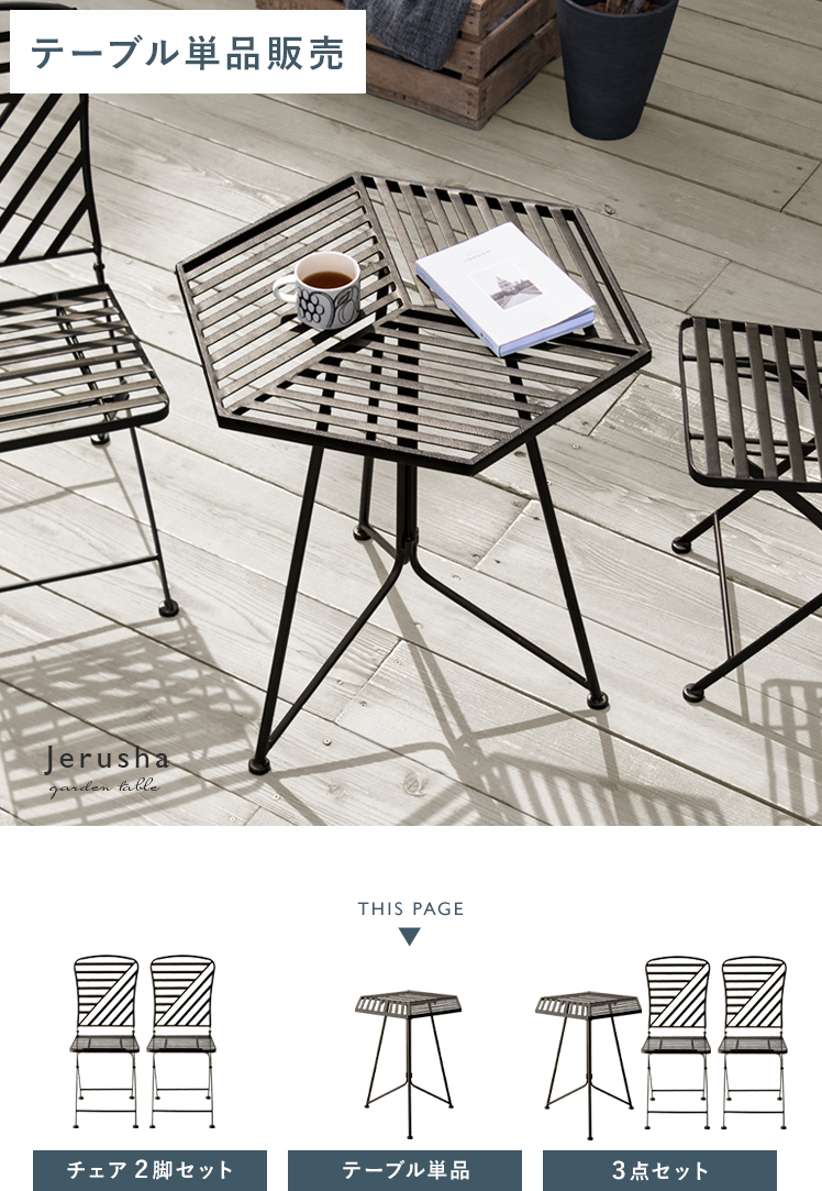 ヘキサガーデンテーブル単体販売 Jerusha〔ジルーシャ〕/カフェのような空間を演出する、オブジェのように美しいデザイン。テーブルは、スマートな六角形の天板で洗練された印象を生み出します。チェアは、直線と緩やかな曲線を組み合わせ、スッキリと軽やかなデザインに仕上げました。