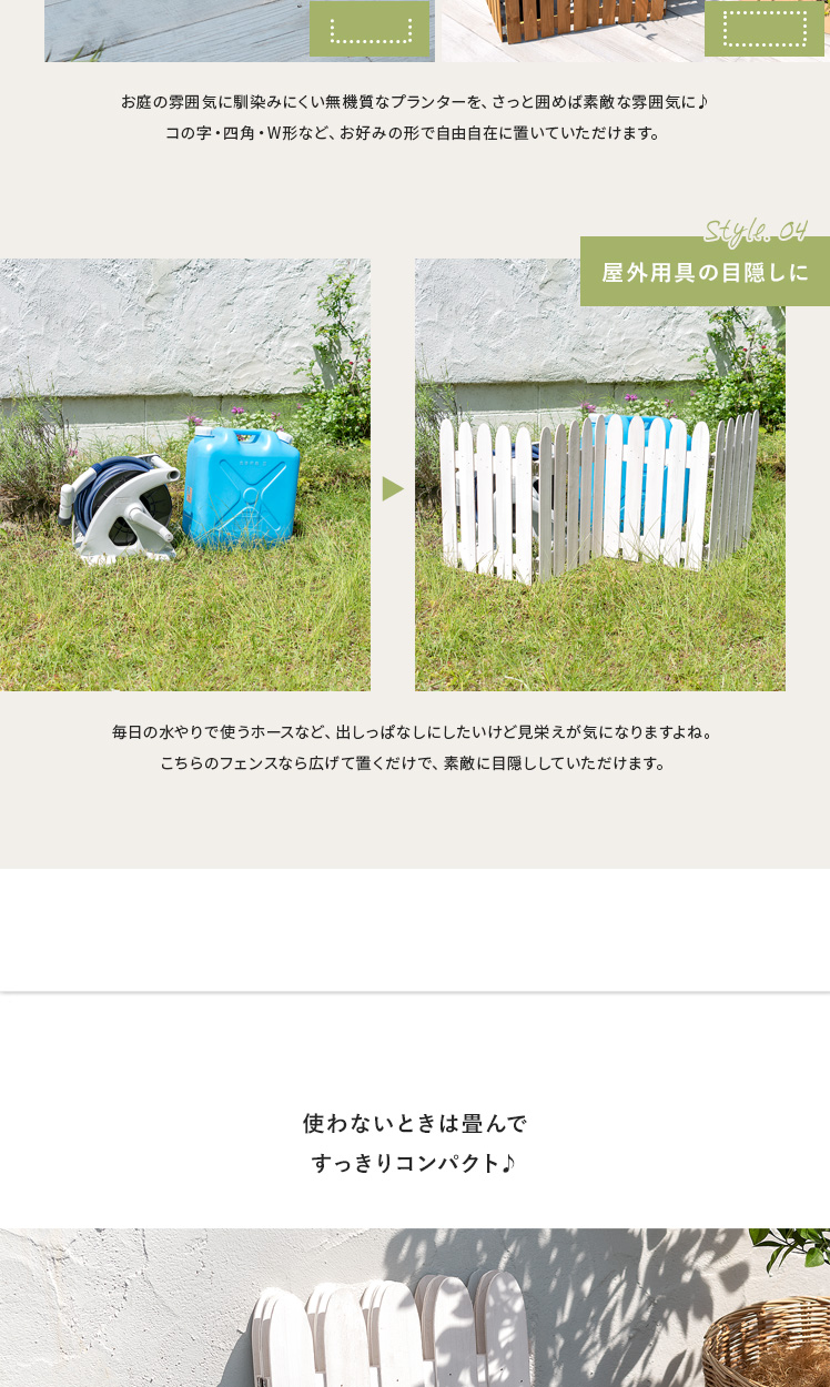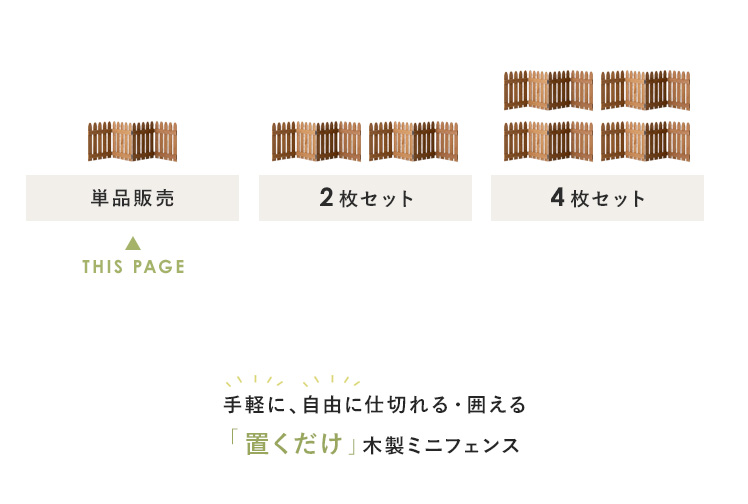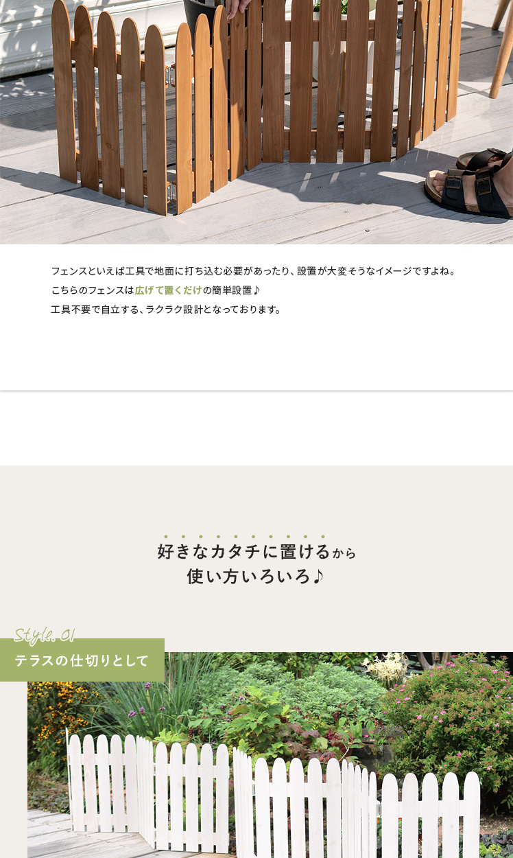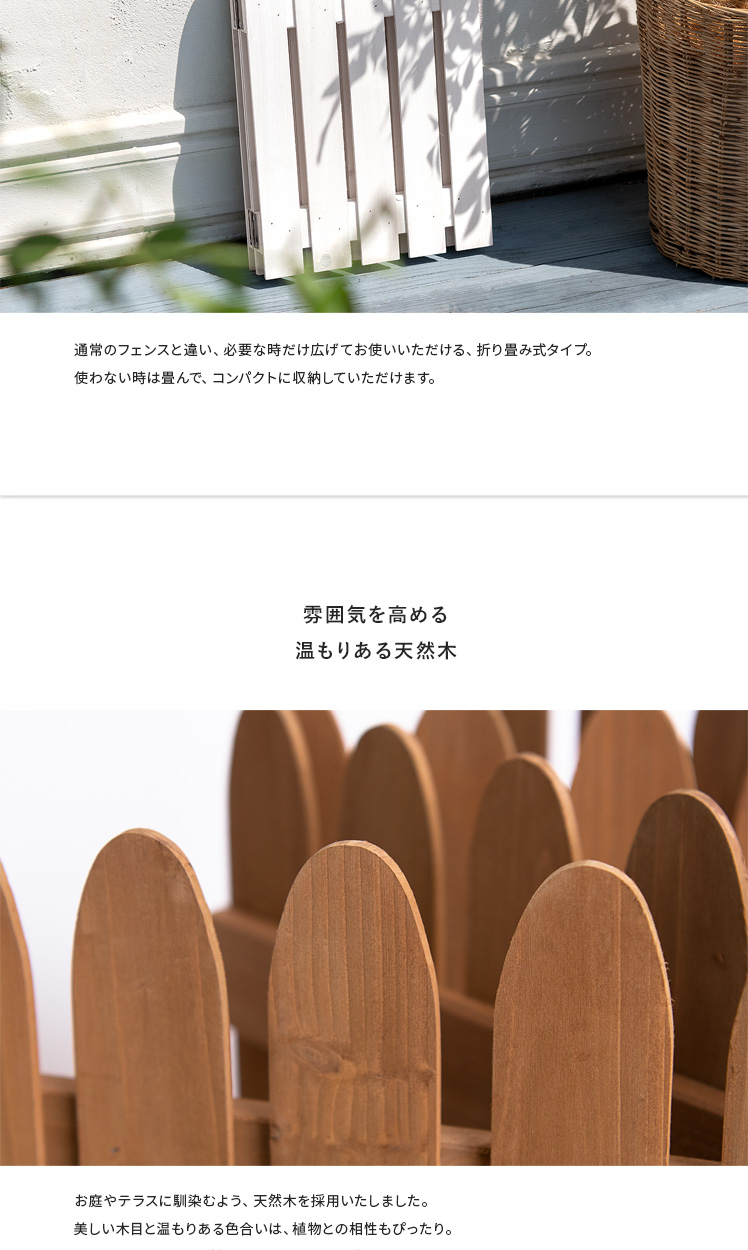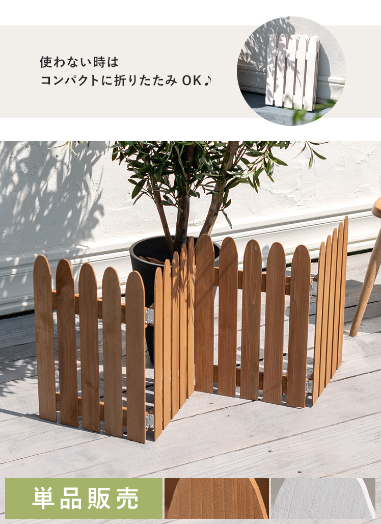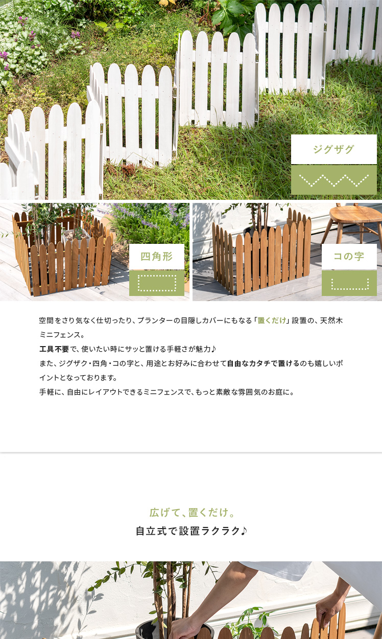 折り畳めるウッドミニフェンス 単品販売/空間をさり気なく仕切ったり、プランターの目隠しカバーにもなる「置くだけ」設置の、天然木ミニフェンス。工具不要で、使いたい時にサッと置ける手軽さが魅力♪また、ジグザク・四角・コの字と、用途とお好みに合わせて自由なカタチで置けるのも嬉しいポイントとなっております。手軽に、自由にレイアウトできるミニフェンスで、もっと素敵な雰囲気のお庭に。