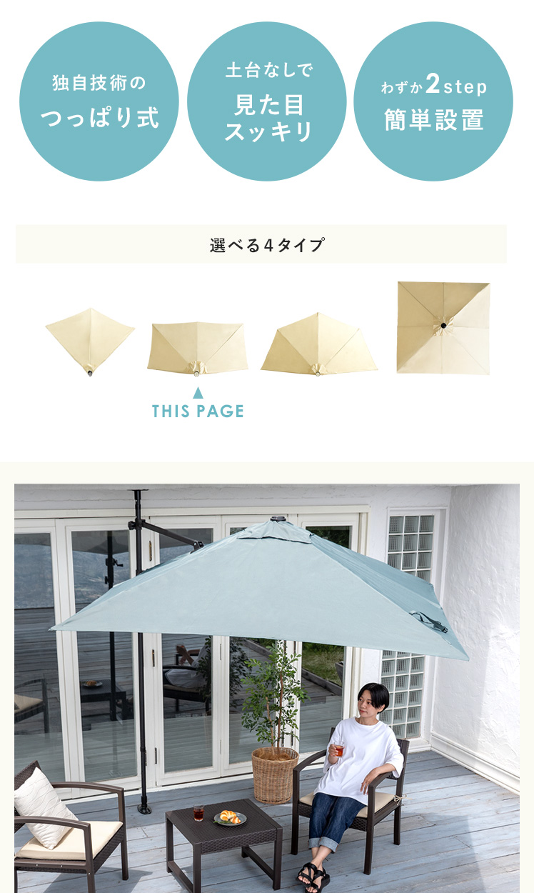 突っ張り式パラソル PARASHADE〔パラシェード〕レクタングルタイプ/日差しを気にせず、テラスでの時間を快適にお過ごしいただける、つっぱり式パラソル。独自技術のつっぱり式を採用し、スペースをとる土台がない仕様に。通常のパラソルよりもすっきりと、手軽に設置可能。見た目もスマートなお庭をおつくりいただけます。