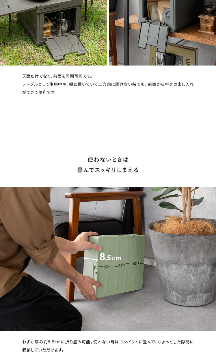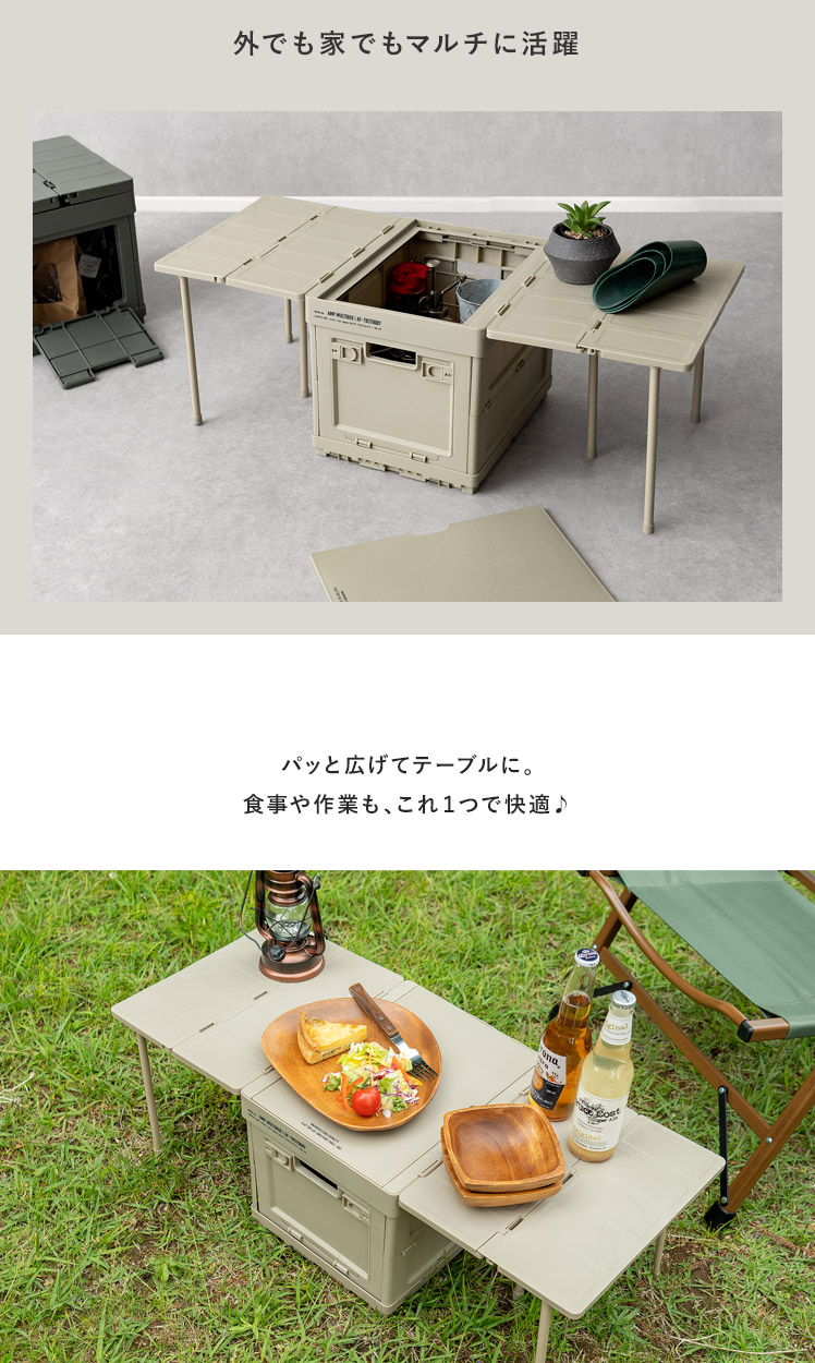 テーブルになる折り畳みコンテナ AMP MULTIBOX/天板を広げれば、コンパクトなコンテナから、食事や作業もしやすいテーブルに早変わり♪天面だけでなく前面も開閉できるので、テーブルで作業しながら中身の出し入れができて便利です。また、使わない時はコンパクトに折り畳めるところも嬉しいポイントです♪1台2役で余計な荷物を減らし、アウトドアをより快適に。