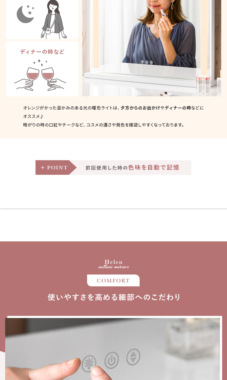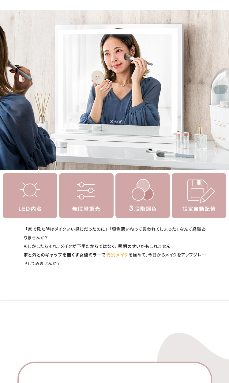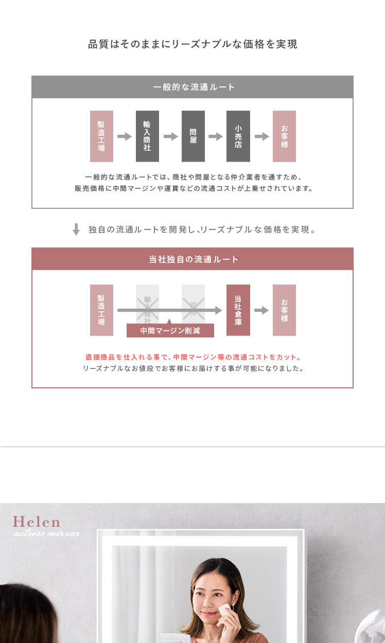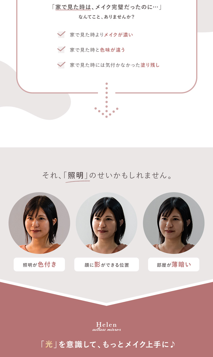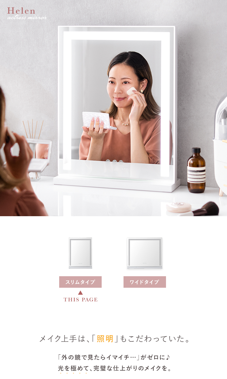 女優ミラー Helen〔ヘレン〕スリムタイプ/「家で見た時はメイクいい感じだったのに」「顔色悪いねって言われてしまった」なんて経験ありませんか?もしかしたらそれ、メイクが下手だからではなく、照明のせいかもしれません。家と外とのギャップを無くす女優ミラーで光別メイクを極めて、今日からメイクをアップグレードしてみませんか?