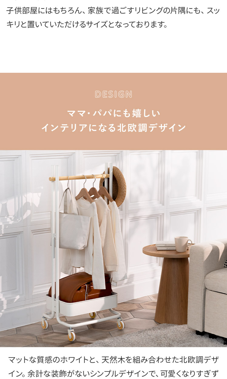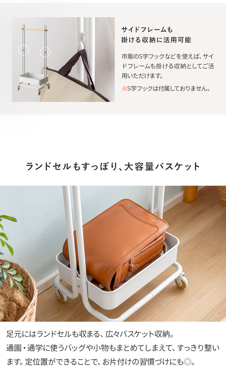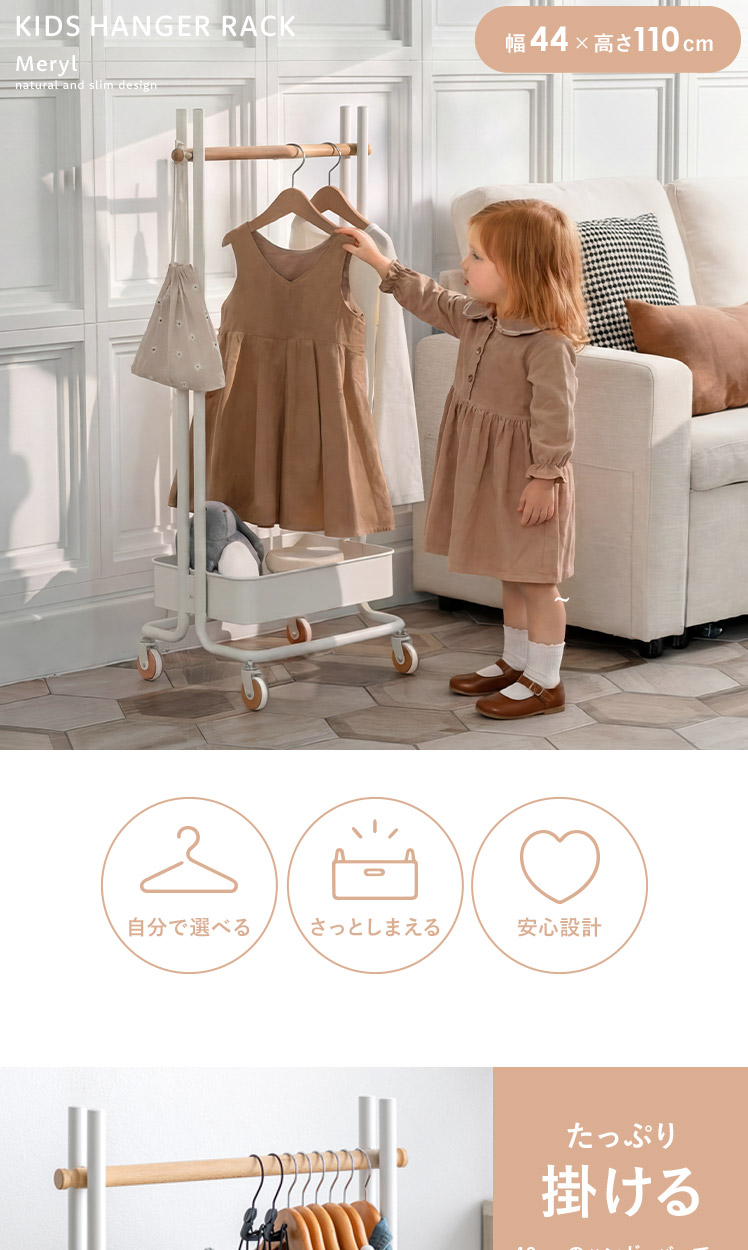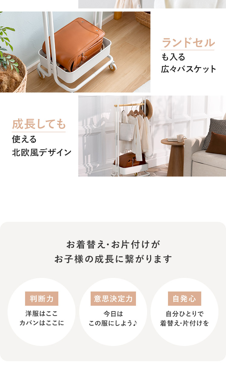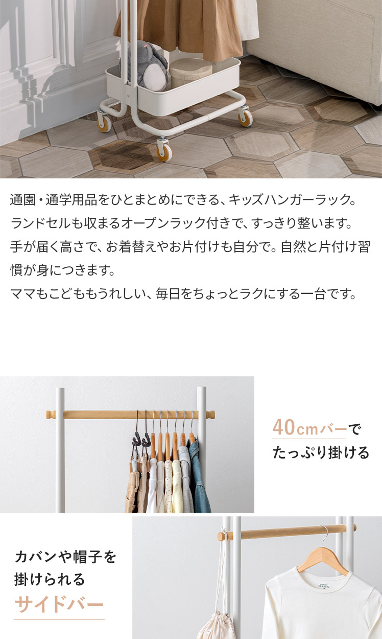キッズハンガーラック Meryl〔メリル〕/通園・通学用品をまとめてしまえる北欧調デザインのキッズハンガーラック。洋服の収納はもちろん、カバンや帽子も掛けてしまえ、ランドセルも入る広々なバスケット収納も付いております。洋服やカバンの定位置ができることで、お着替え・お片付けの練習になり、お子さまの「自分でできる」を育みます。また、マットな質感のホワイトと天然木を組み合わせた北欧調デザインで、インテリアとしてもお部屋に溶け込みます。