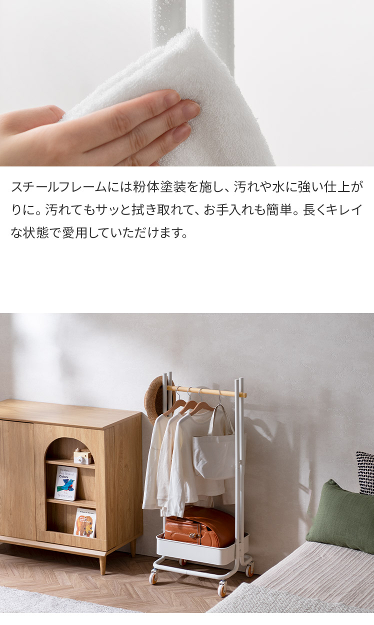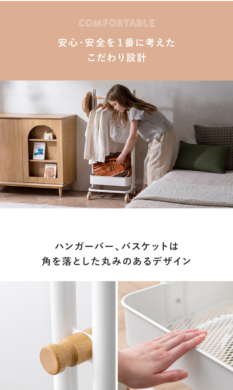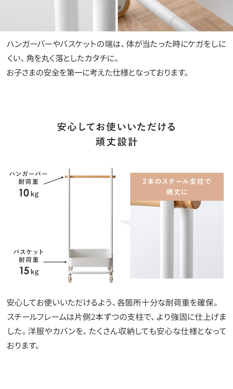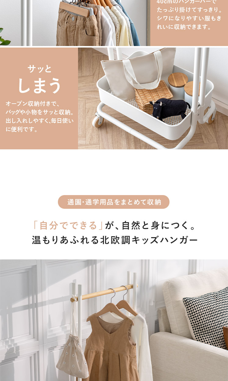 キッズハンガーラック Meryl〔メリル〕/通園・通学用品をまとめてしまえる北欧調デザインのキッズハンガーラック。洋服の収納はもちろん、カバンや帽子も掛けてしまえ、ランドセルも入る広々なバスケット収納も付いております。洋服やカバンの定位置ができることで、お着替え・お片付けの練習になり、お子さまの「自分でできる」を育みます。また、マットな質感のホワイトと天然木を組み合わせた北欧調デザインで、インテリアとしてもお部屋に溶け込みます。