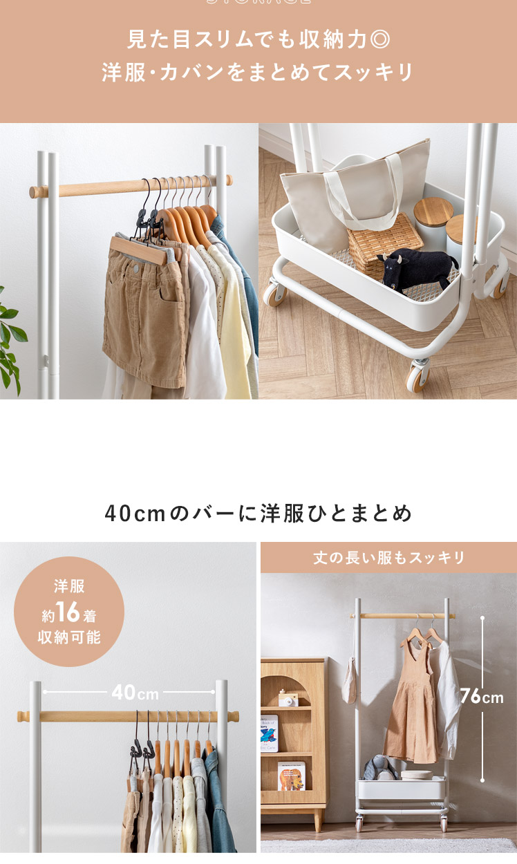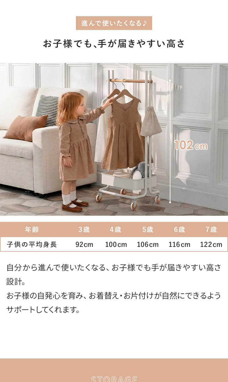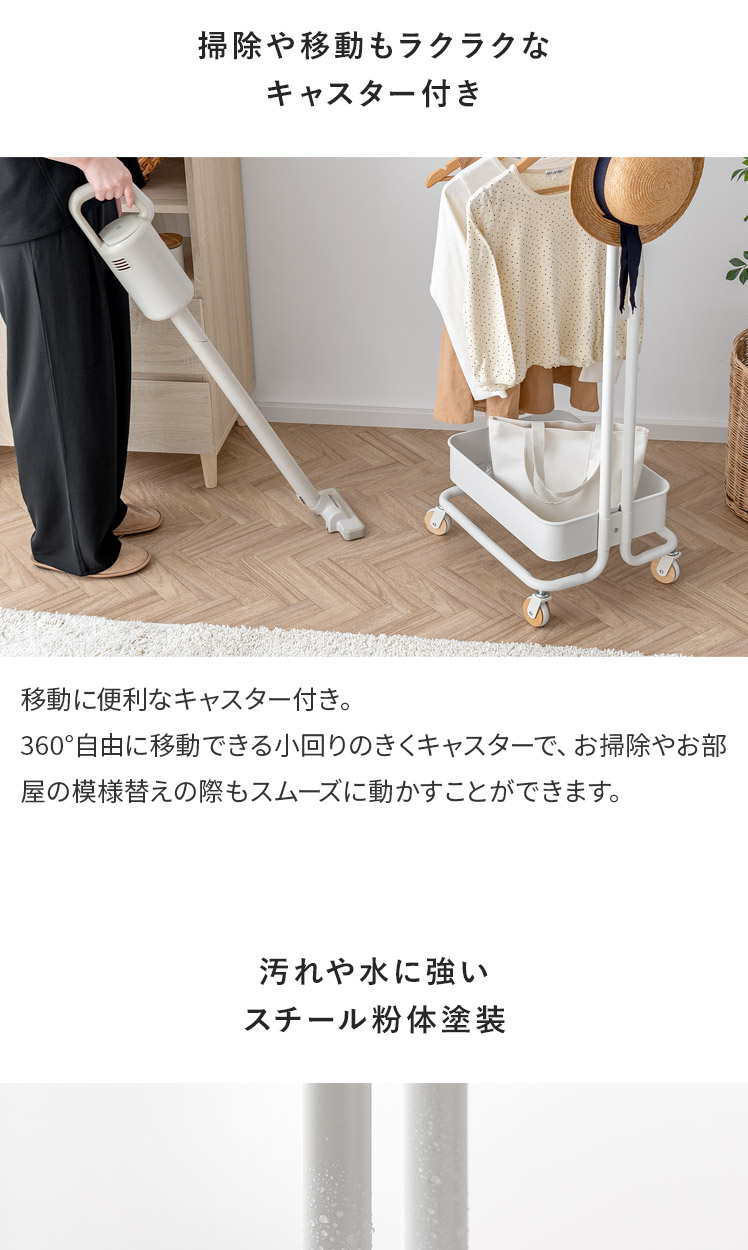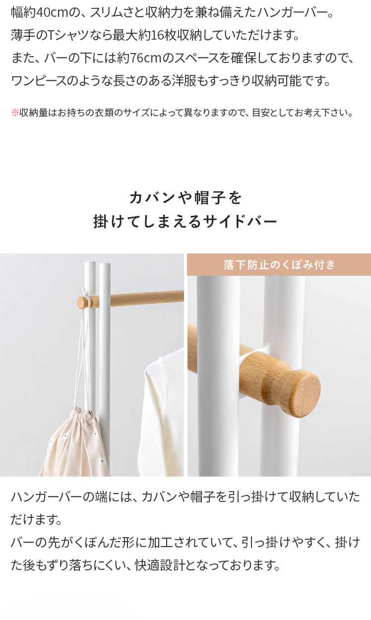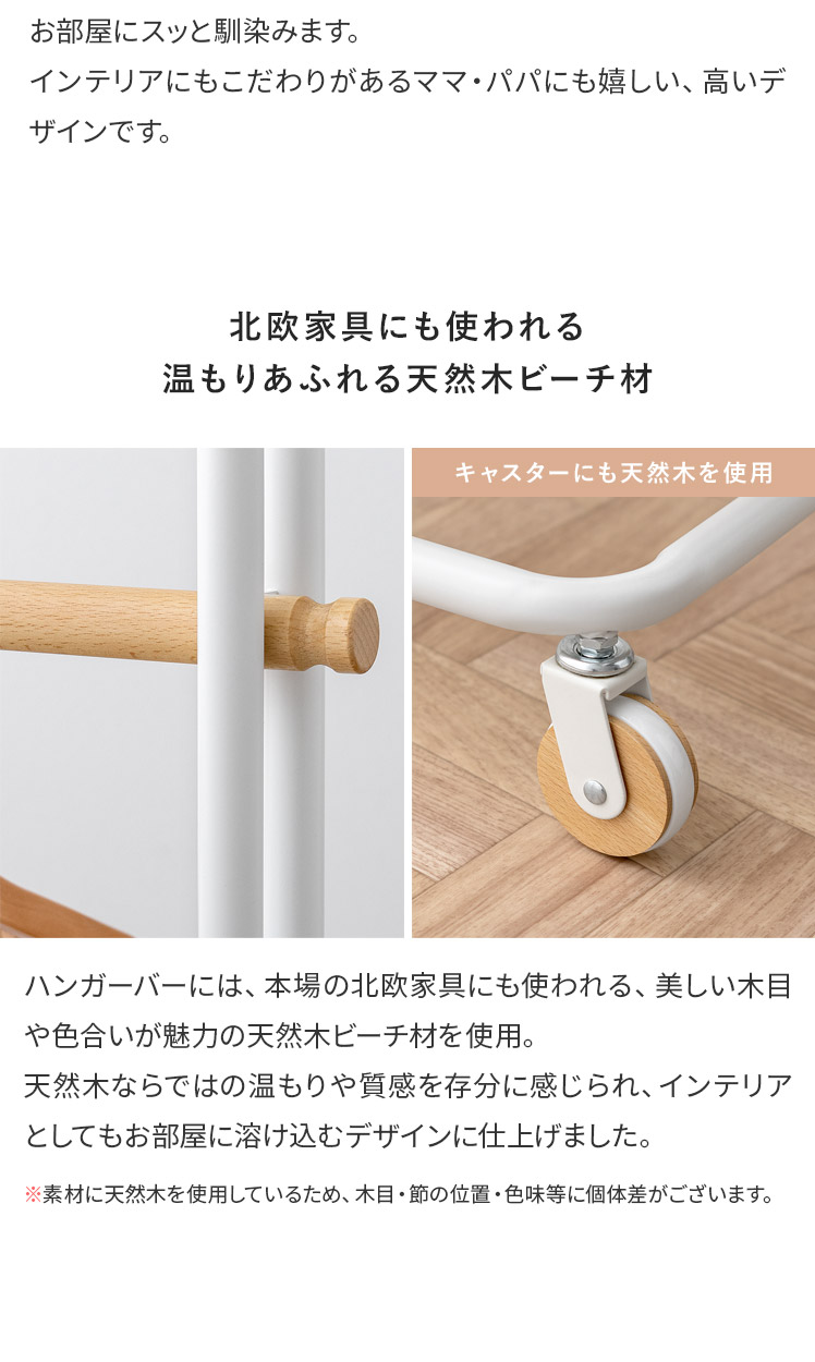 キッズハンガーラック Meryl〔メリル〕/通園・通学用品をまとめてしまえる北欧調デザインのキッズハンガーラック。洋服の収納はもちろん、カバンや帽子も掛けてしまえ、ランドセルも入る広々なバスケット収納も付いております。洋服やカバンの定位置ができることで、お着替え・お片付けの練習になり、お子さまの「自分でできる」を育みます。また、マットな質感のホワイトと天然木を組み合わせた北欧調デザインで、インテリアとしてもお部屋に溶け込みます。