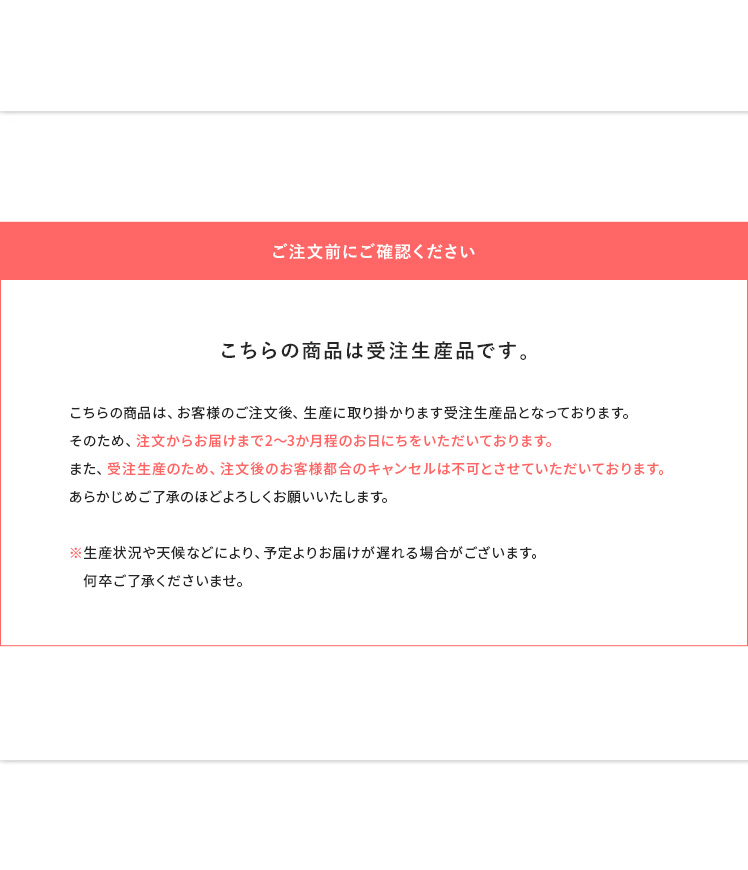また受注生産のため、注文後のお客様都合のキャンセルは不可とさせていただいております。