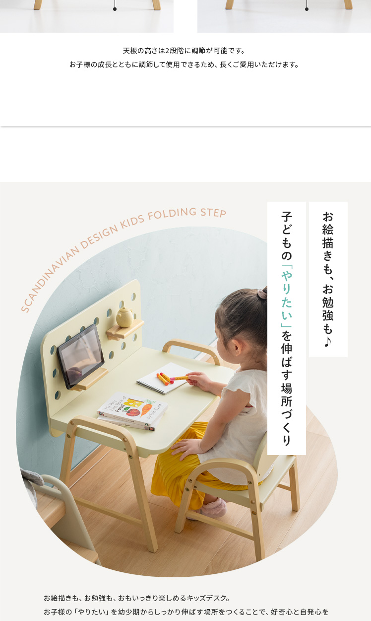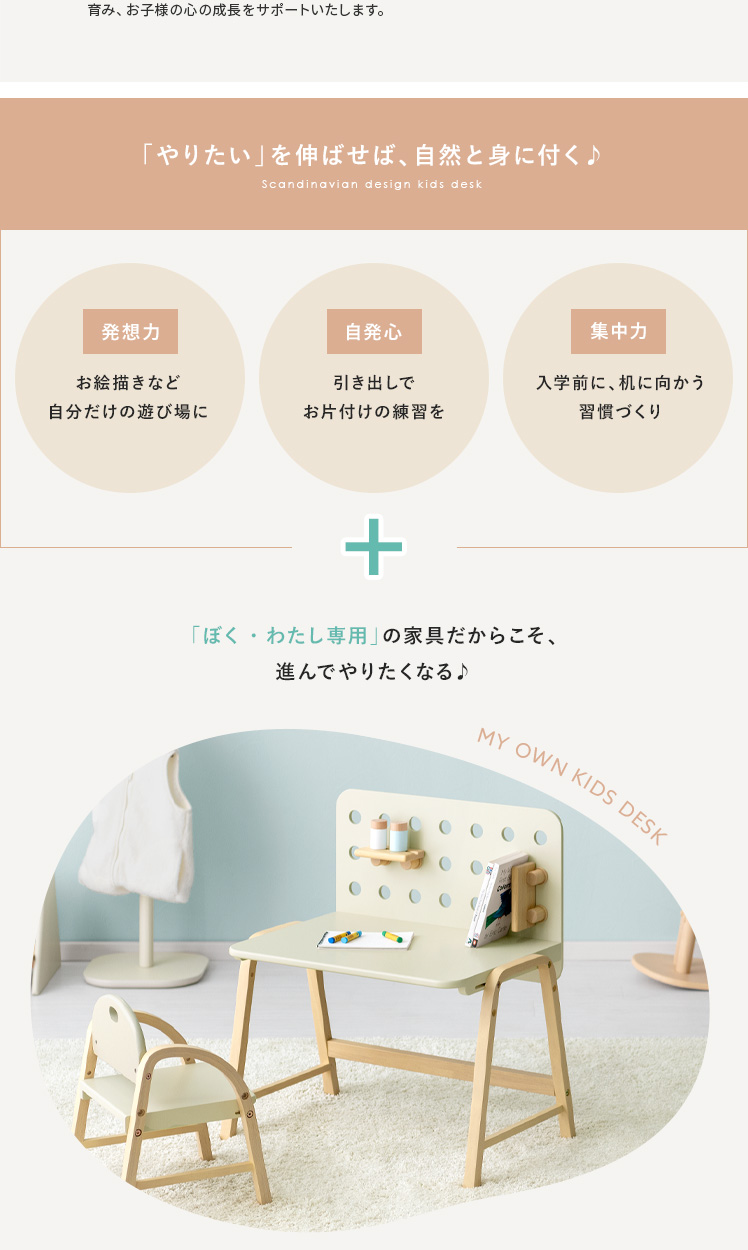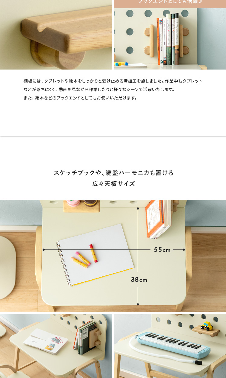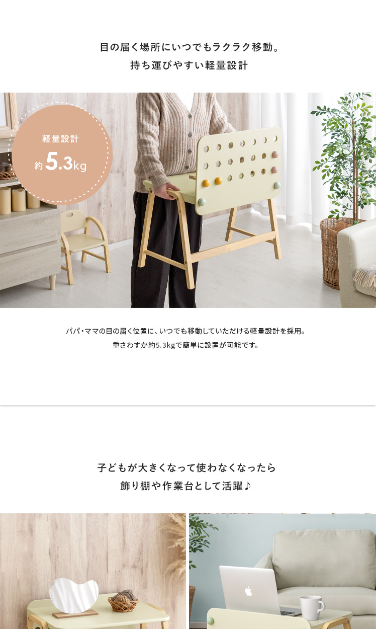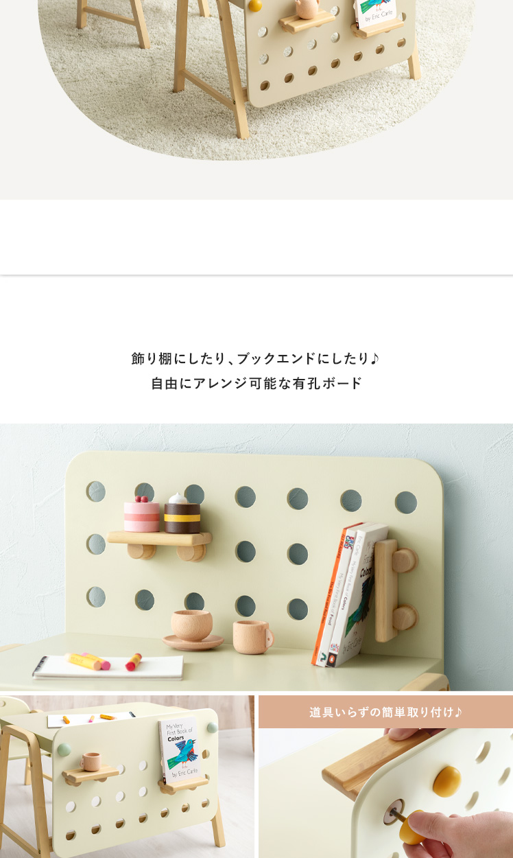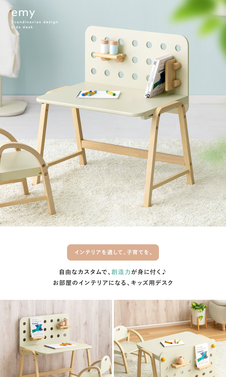 キッズデスク emy〔エミー〕/自由にカスタムできるから、お子様の創造力が自然と身に付く小さなキッズデスク♪淡いアイボリーカラーと、温もりある天然木の組み合わせがシンプルでありながらも可愛らしいデザインに。広々とした天板と、自由にカスタムできるボードが、お絵描きもお勉強も、おもいっきり楽しめる環境をつくります。インテリアを通して、お子様の自発心を育み、「やりたい」を自然に伸ばすサポートいたします。