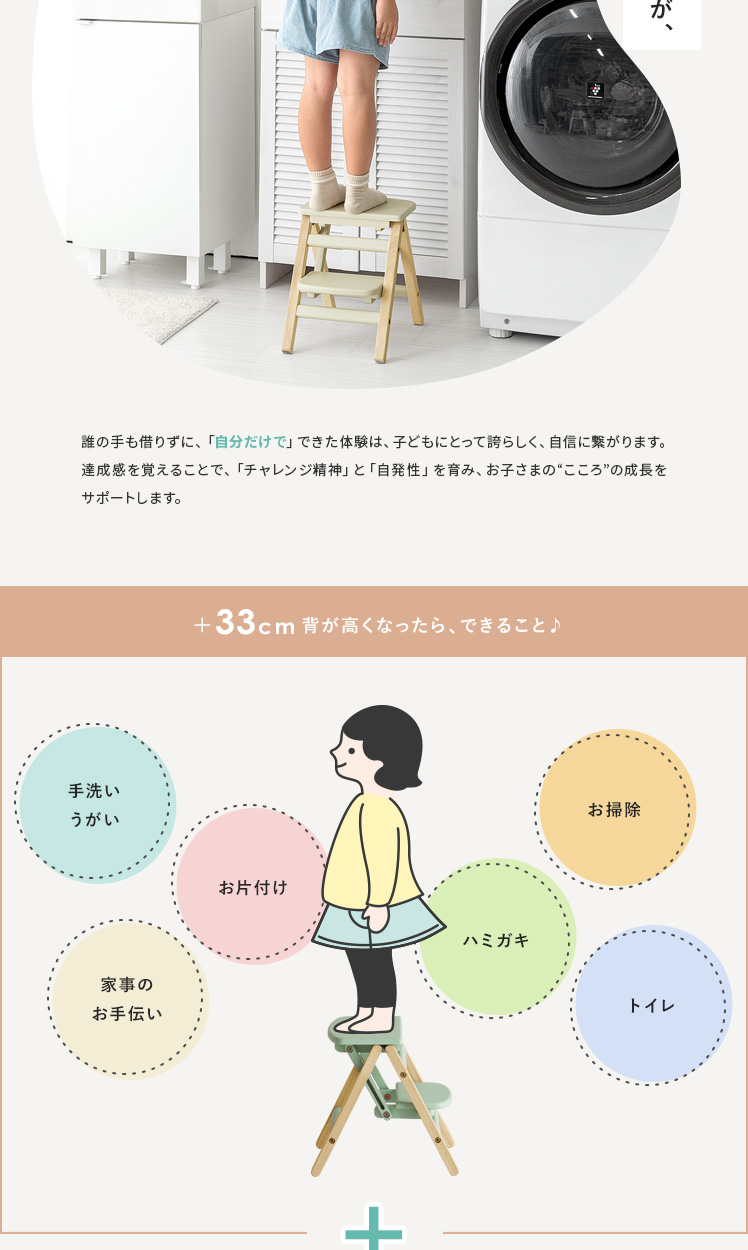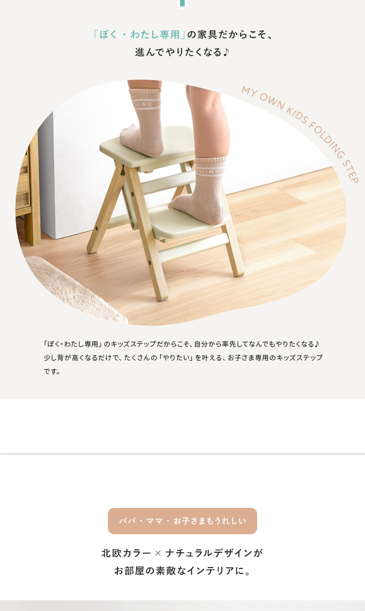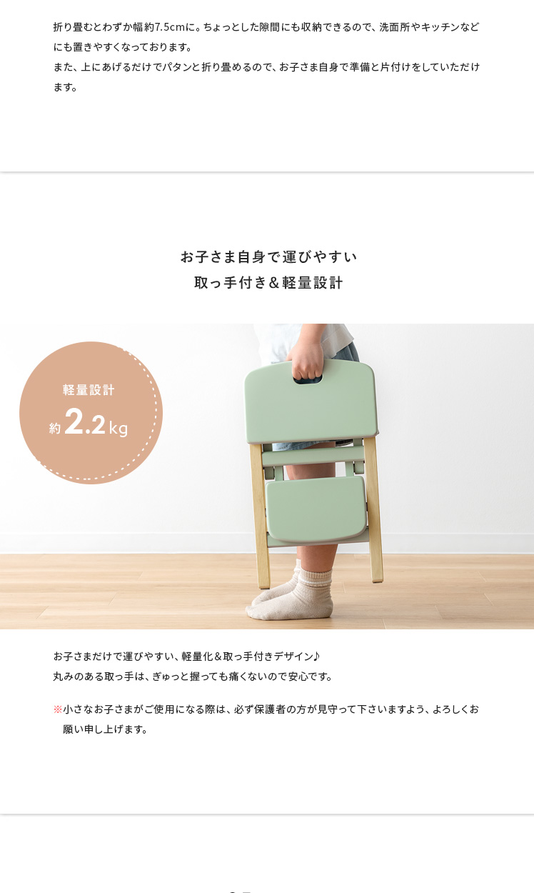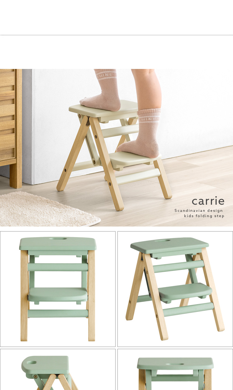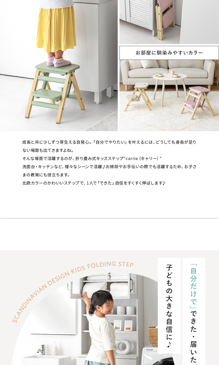 折り畳み式キッズステップ carrie〔キャリー〕/成長と共に少しずつ芽生える自発心。「自分でやりたい」を叶えるには、どうしても身長が足りない場面も出てきますよね。そんな場面で活躍するのが、折り畳み式キッズステップ“carrie(キャリー)”洗面台・キッチンなど、様々なシーンで活躍♪お掃除やお手伝いの際でも活躍するため、お子さまの教育にも役立ちます。北欧カラーのかわいいステップで、1人で「できた」自信をすくすく伸ばします♪