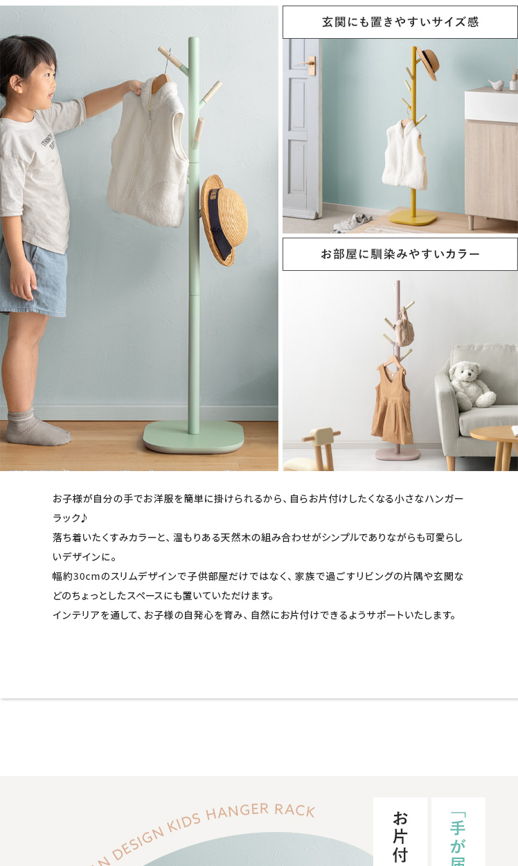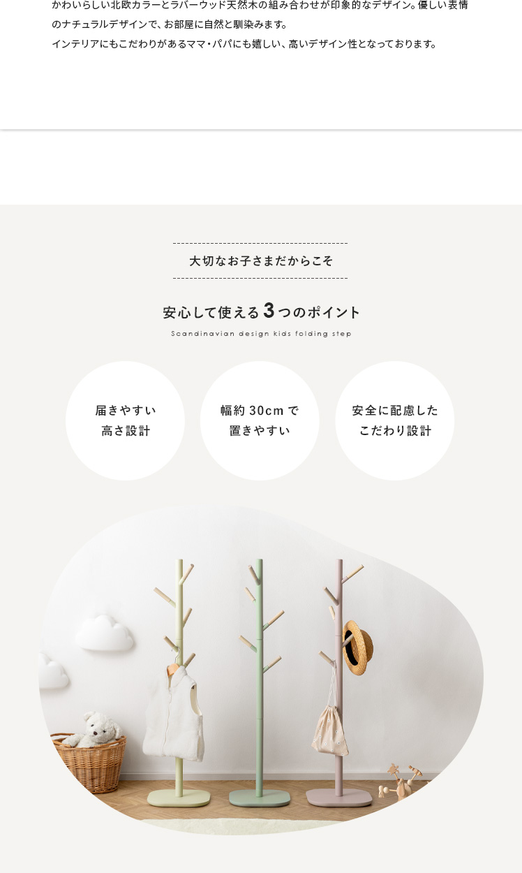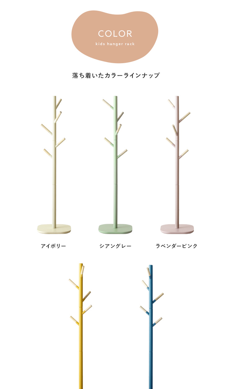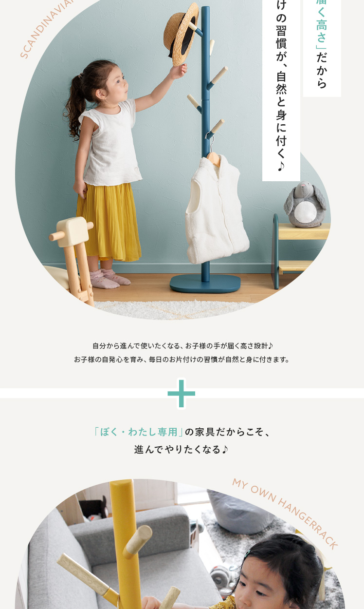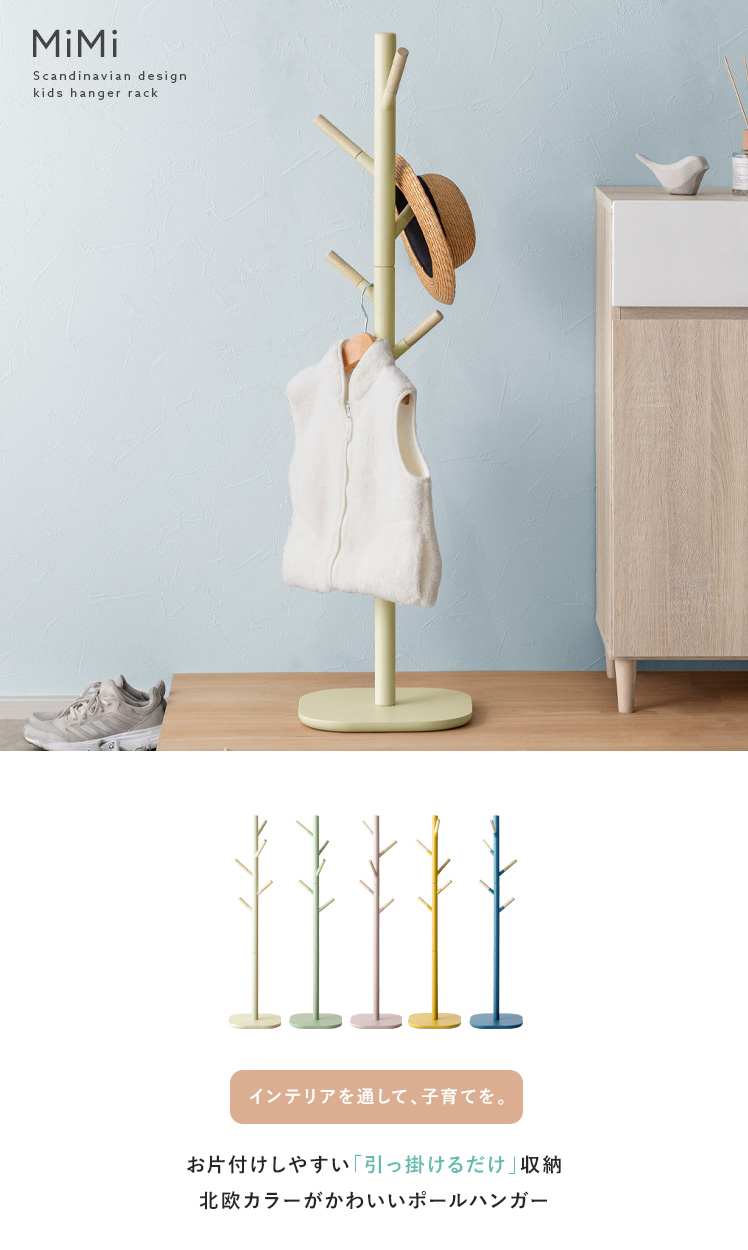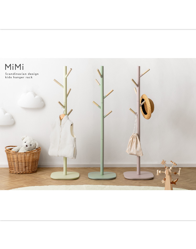 キッズポールハンガー mimi〔ミミ〕/お子様が自分の手でお洋服を簡単に掛けられるから、自らお片付けしたくなる小さなハンガーラック♪落ち着いたくすみカラーと、温もりある天然木の組み合わせがシンプルでありながらも可愛らしいデザインに。幅約30cmのスリムデザインで子供部屋だけではなく、家族で過ごすリビングの片隅や玄関などのちょっとしたスペースにも置いていただけます。インテリアを通して、お子様の自発心を育み、自然にお片付けできるようサポートいたします。