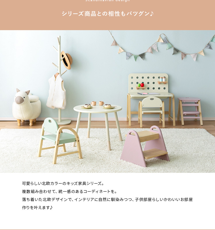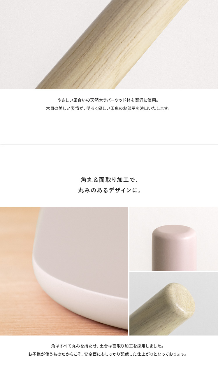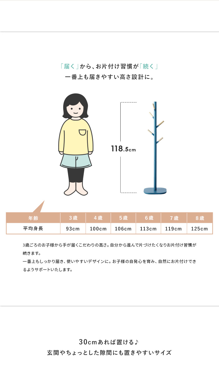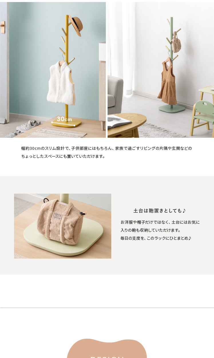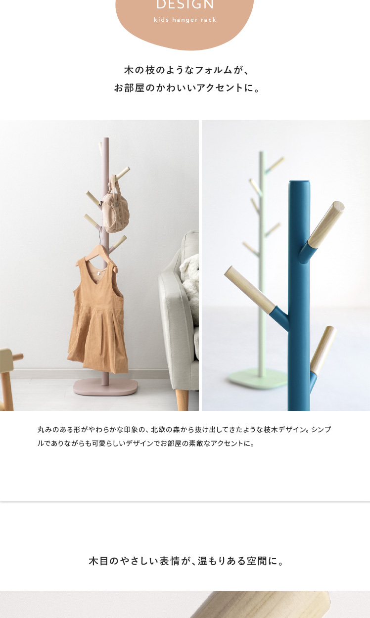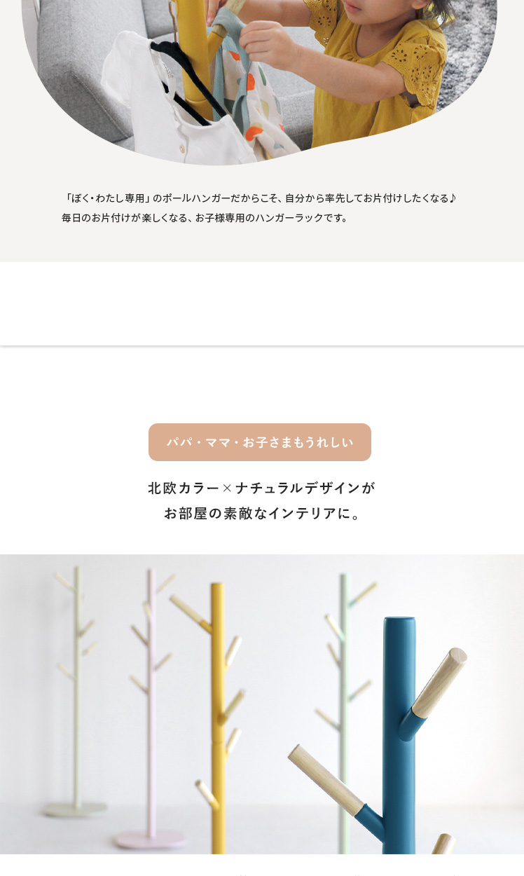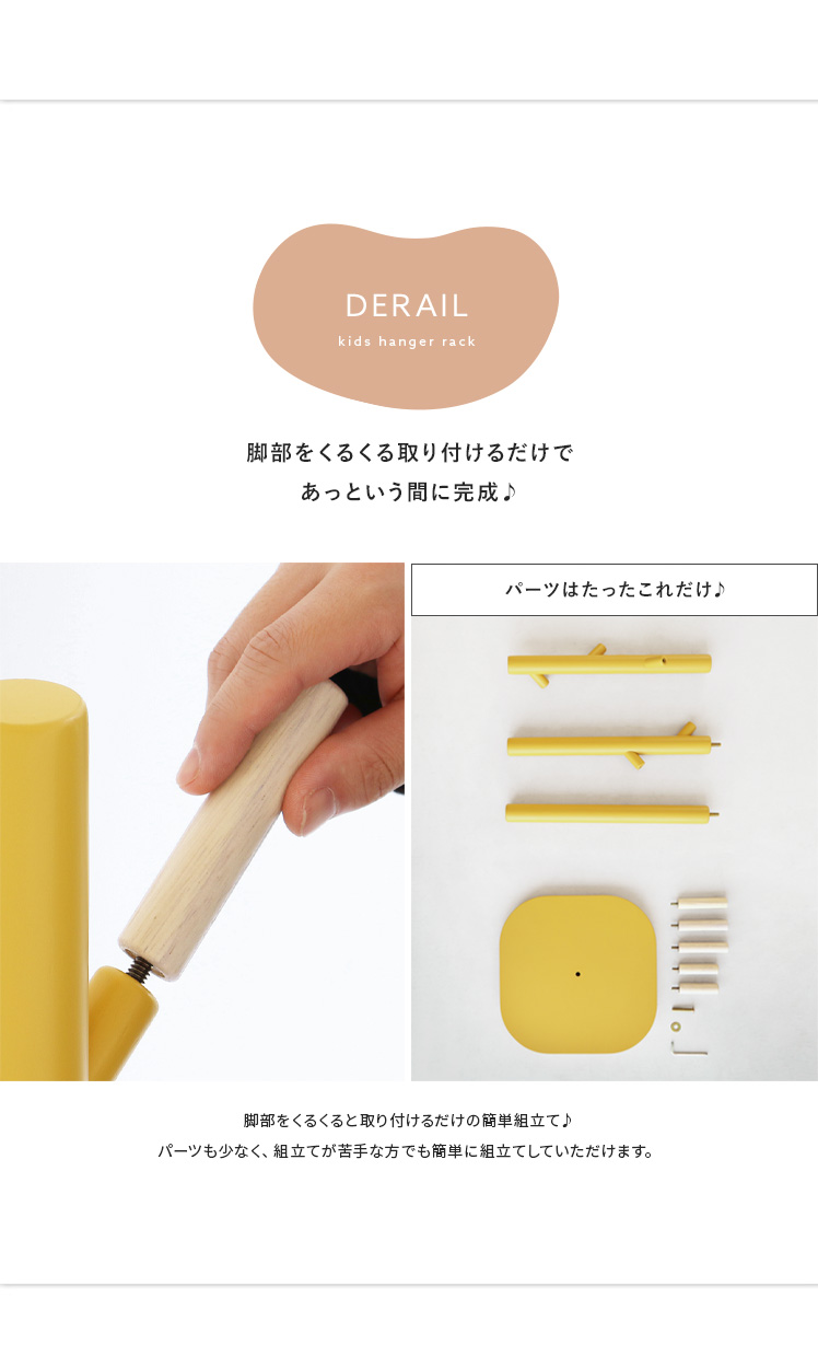 キッズポールハンガー mimi〔ミミ〕/お子様が自分の手でお洋服を簡単に掛けられるから、自らお片付けしたくなる小さなハンガーラック♪落ち着いたくすみカラーと、温もりある天然木の組み合わせがシンプルでありながらも可愛らしいデザインに。幅約30cmのスリムデザインで子供部屋だけではなく、家族で過ごすリビングの片隅や玄関などのちょっとしたスペースにも置いていただけます。インテリアを通して、お子様の自発心を育み、自然にお片付けできるようサポートいたします。