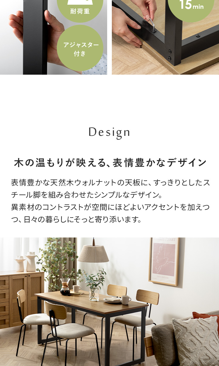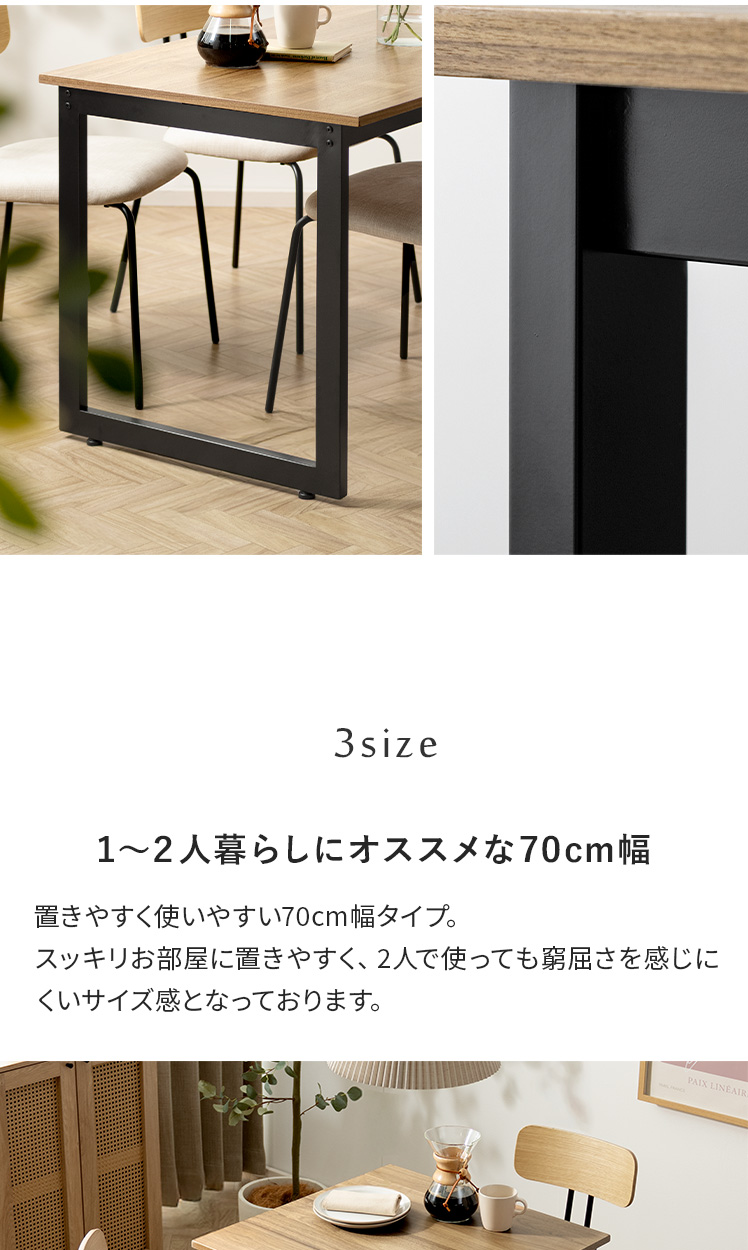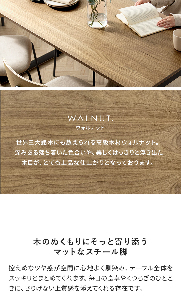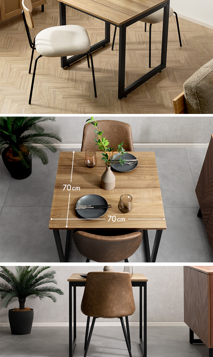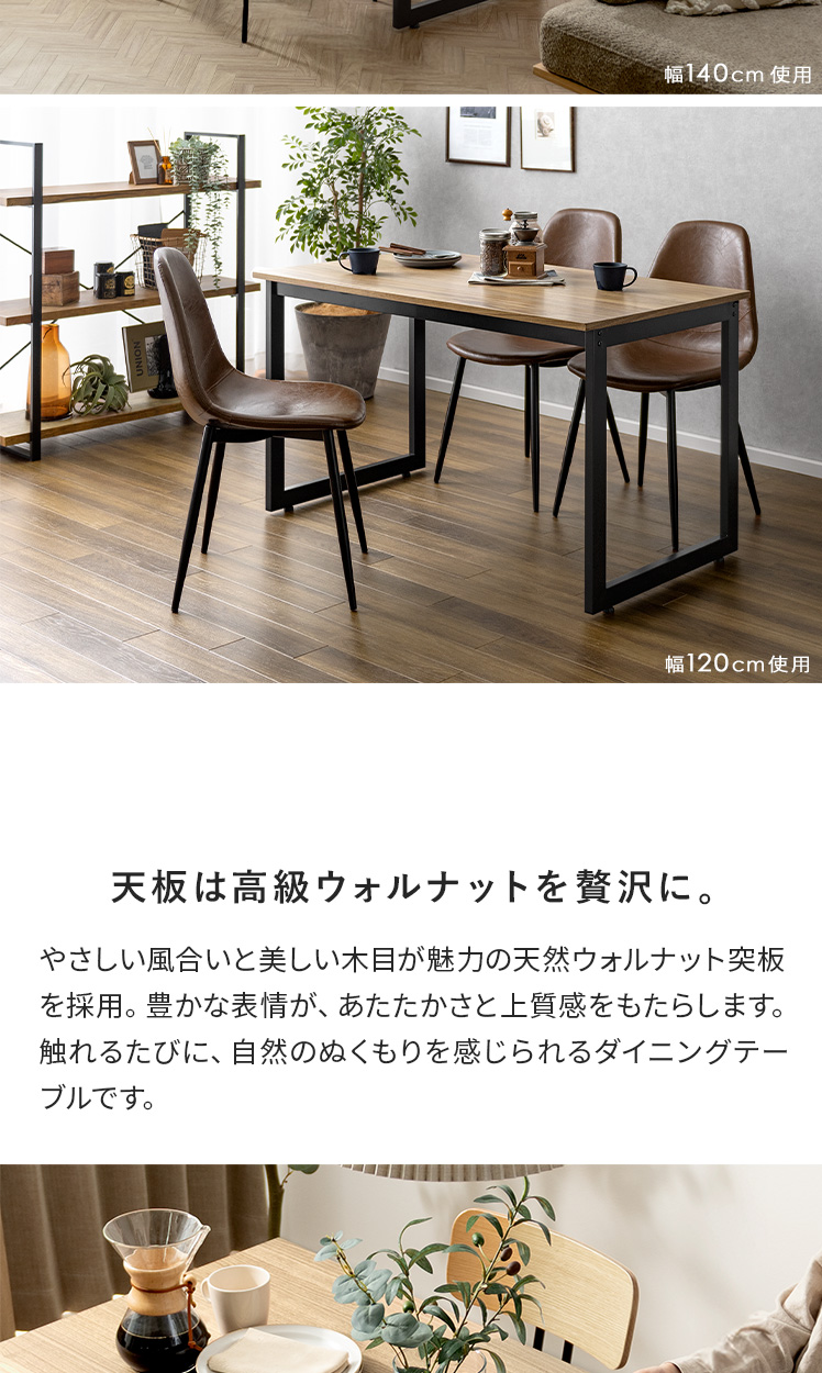 ダイニングテーブル Velde〔ヴェルデ〕 70cm幅テーブル単品販売/高級木材ウォルナットの突板を使用した天板と、スクエアデザインのスチールフレームが、インダストリアルな空間をつくるダイニングテーブル“Velde(ベルデ)”天然木ならではの温かみを感じる表情豊かな木目が、プリント紙では味わえない上質な空間を演出いたします。脚部には、ロの字型の厚みのあるスチール脚を使用し、インダストリアルで重厚な雰囲気をより一層引き立てるデザインに。無骨な印象のブラックスチールが全体を引き締め、落ち着きのある表情をつくり出します。