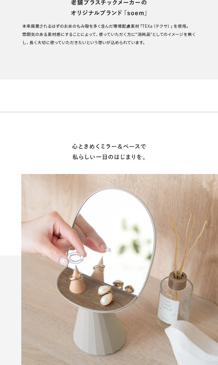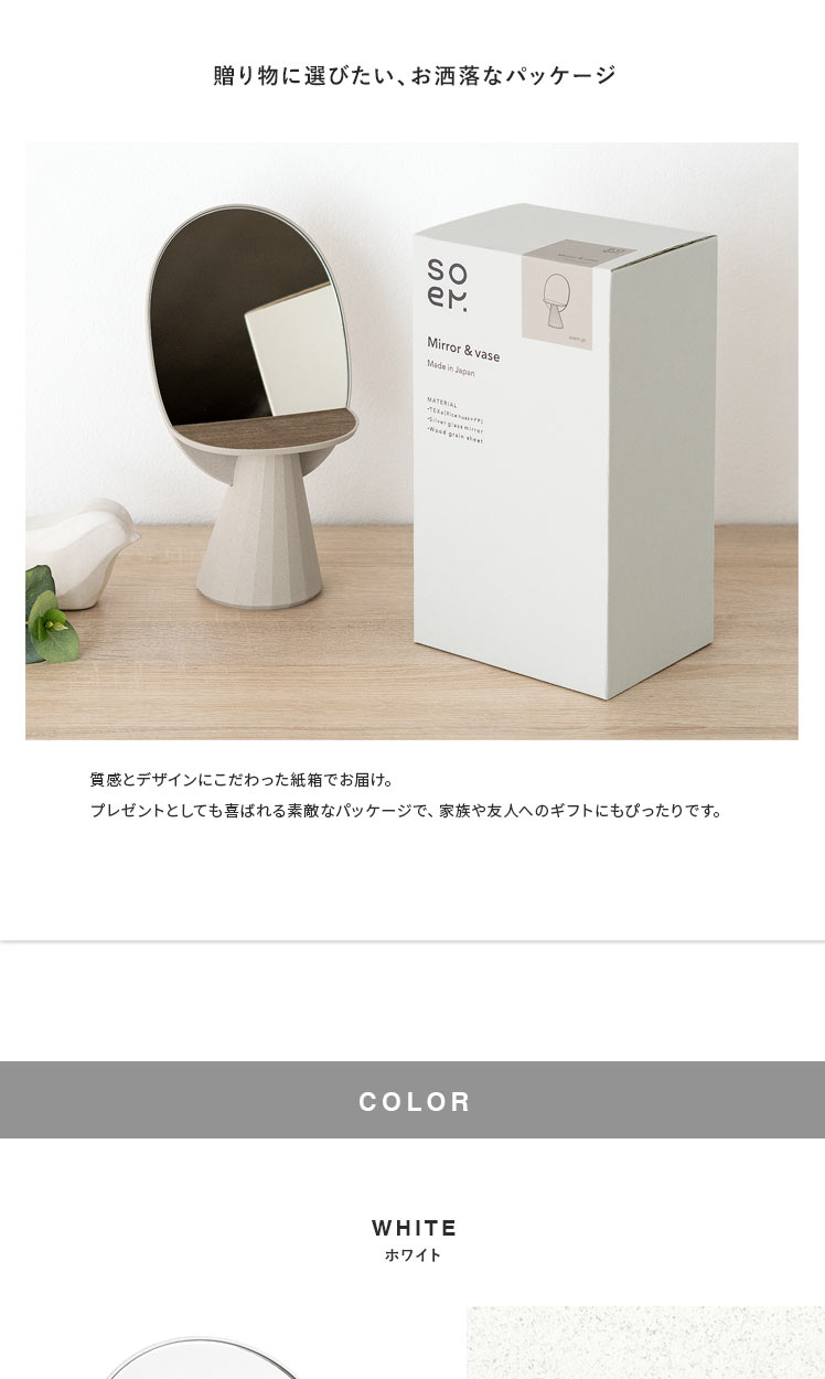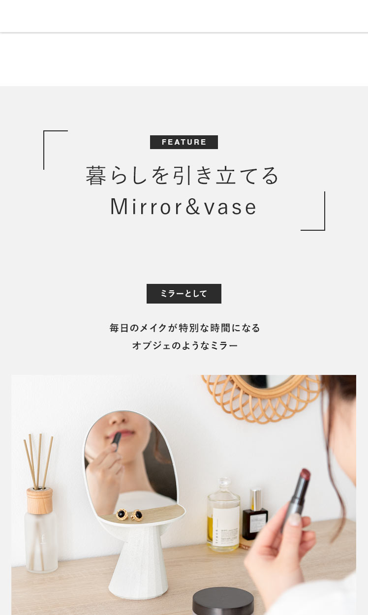 soem〔ソエム〕Mirror & vase/ミラーと一輪挿しの1台2役でお使いいただける“soem(ソエム)ミラー&ベース”目にふれるたび、ちょっぴり気分があがる。使わない時でも飾っておきたくなるオブジェのような佇まい。実用性はもちろん、インテリア性の高いデザインで、心ときめく空間を演出します。