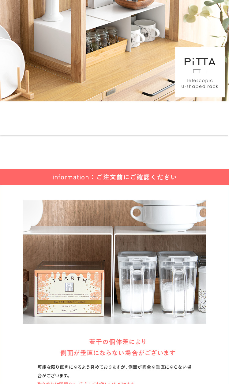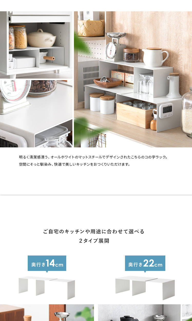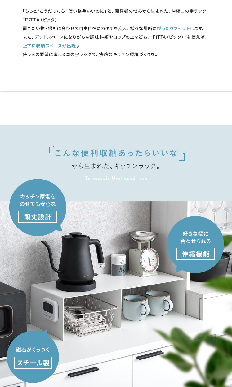 伸縮コの字ラック PiTTA[ピッタ] (奥行き22cmタイプ)/「もっと“こうだったら”使い勝手いいのに」と、開発者の悩みから生まれた、伸縮コの字ラック“PiTTA(ピッタ)”置きたい物・場所に合わせて自由自在にカタチを変え、様々な場所にぴったりフィットします。また、デッドスペースになりがちな調味料類やコップの上なども、“PiTTA(ピッタ)”を使えば、上下に収納スペースが出現♪使う人の要望に応えるコの字ラックで、快適なキッチン環境づくりを。