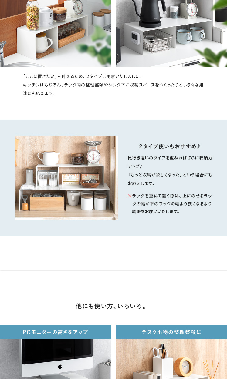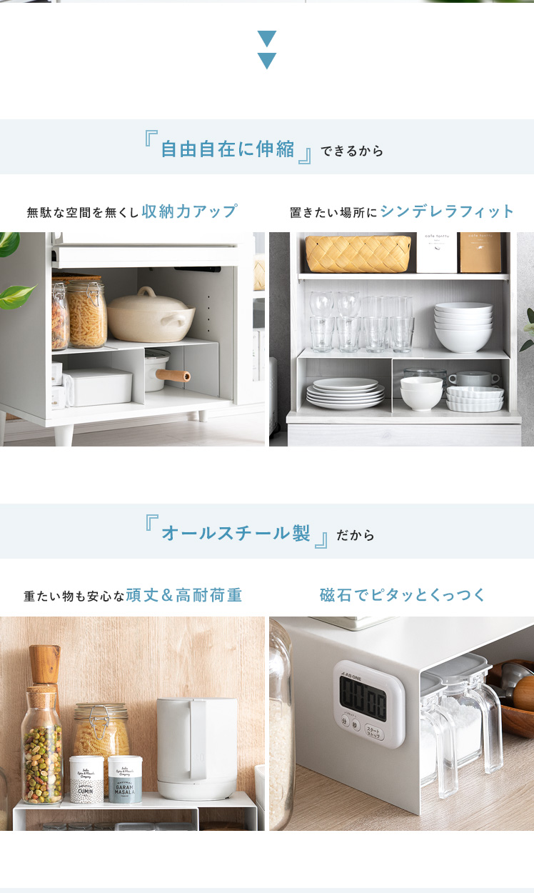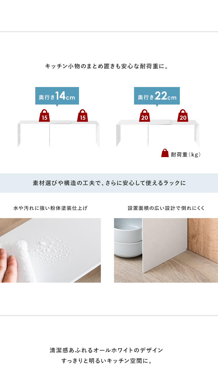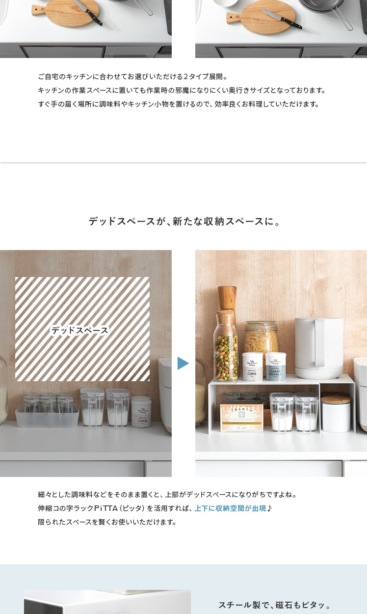 伸縮コの字ラック PiTTA[ピッタ] (奥行き22cmタイプ)/「もっと“こうだったら”使い勝手いいのに」と、開発者の悩みから生まれた、伸縮コの字ラック“PiTTA(ピッタ)”置きたい物・場所に合わせて自由自在にカタチを変え、様々な場所にぴったりフィットします。また、デッドスペースになりがちな調味料類やコップの上なども、“PiTTA(ピッタ)”を使えば、上下に収納スペースが出現♪使う人の要望に応えるコの字ラックで、快適なキッチン環境づくりを。