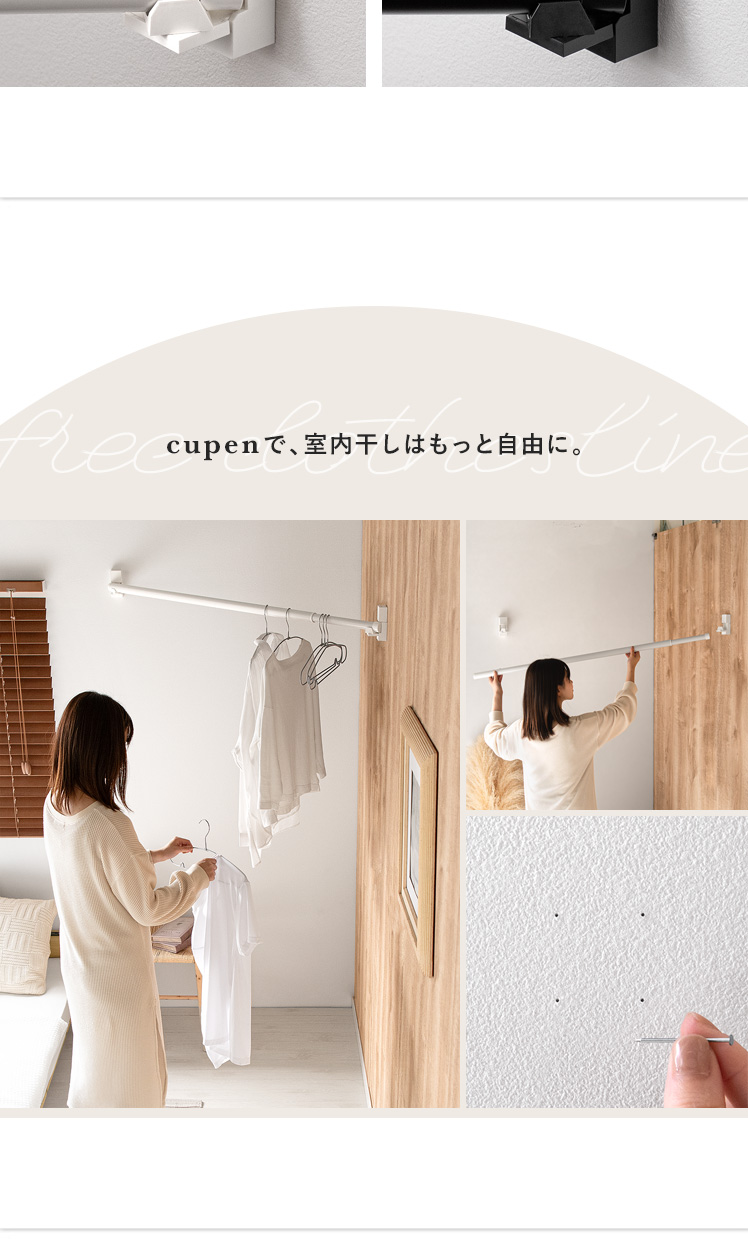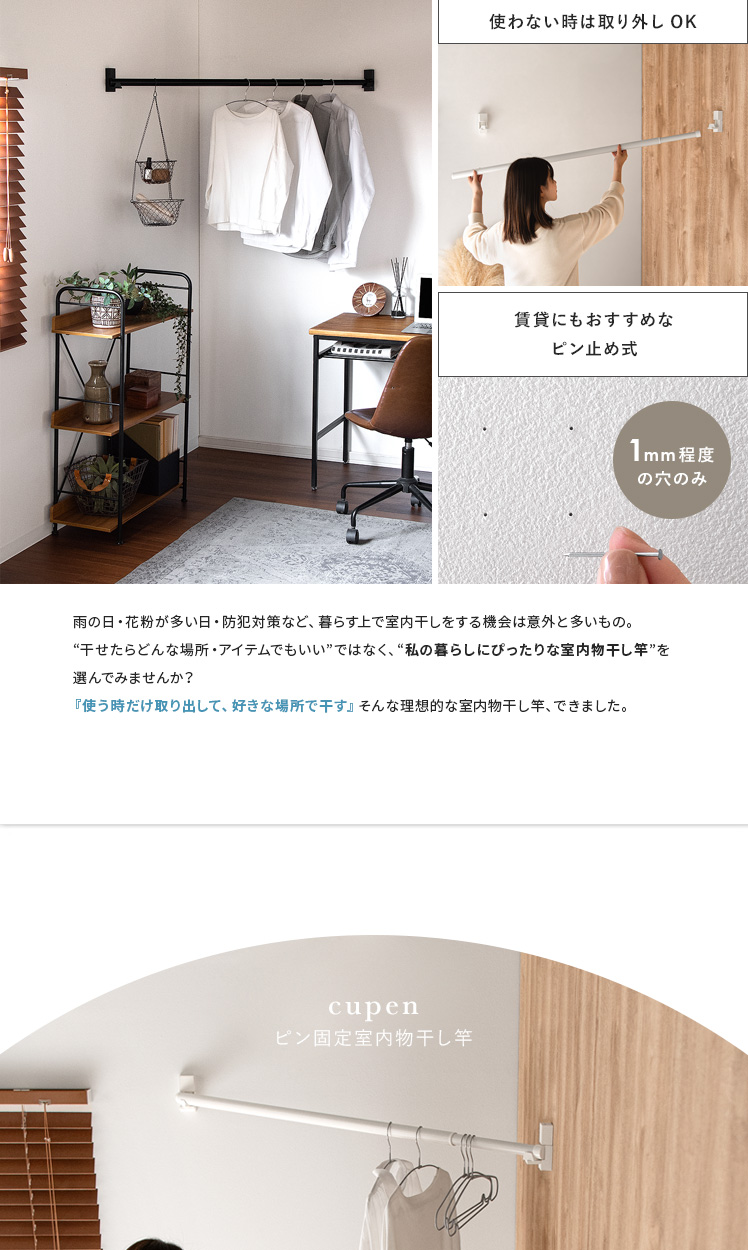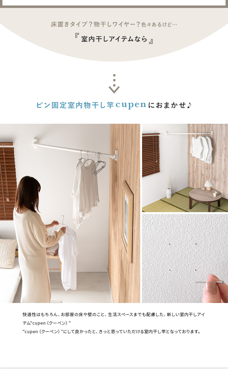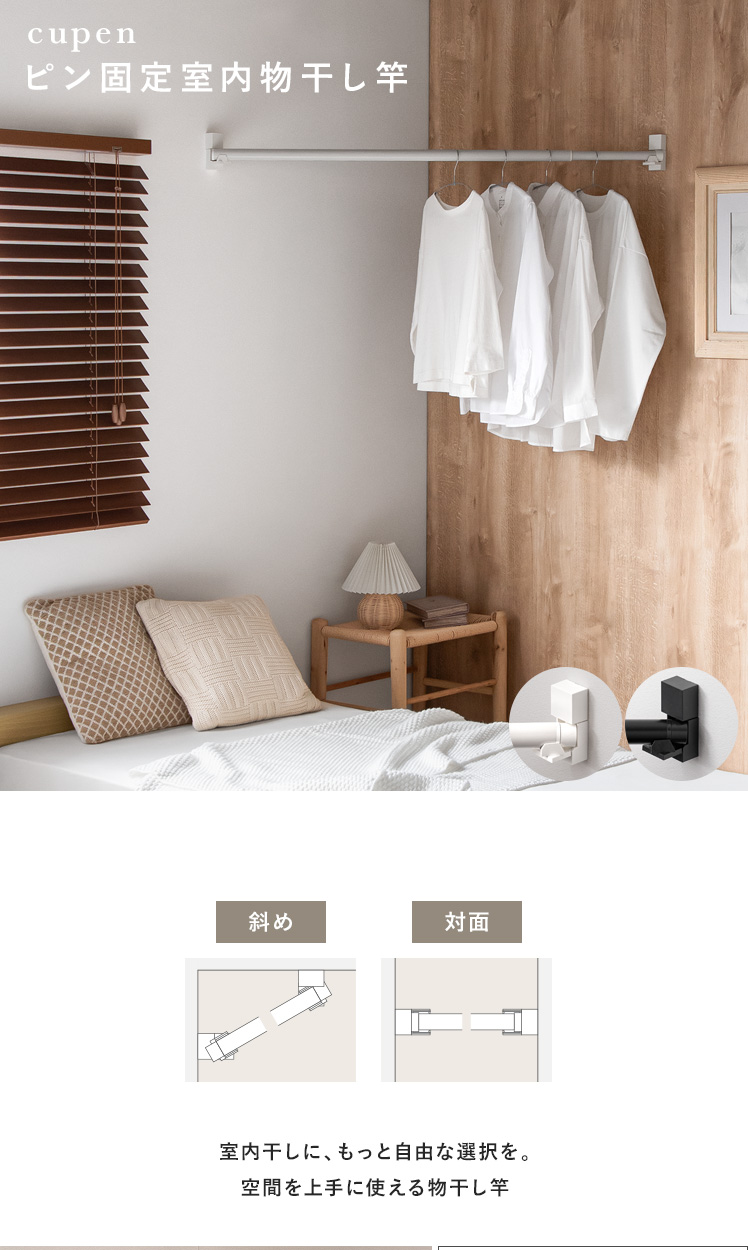 ピン固定室内物干し cupen〔クーペン〕/雨の日・花粉が多い日・防犯対策など、暮らす上で室内干しをする機会は意外と多いもの。“干せたらどんな場所・アイテムでもいい”ではなく、“私の暮らしにぴったりな室内物干し竿”を選んでみませんか?『使う時だけ取り出して、好きな場所で干す』そんな理想的な室内物干し竿、できました。