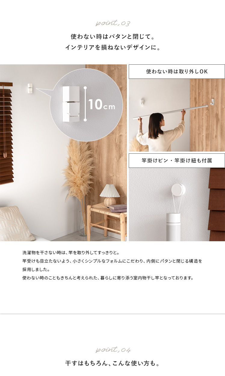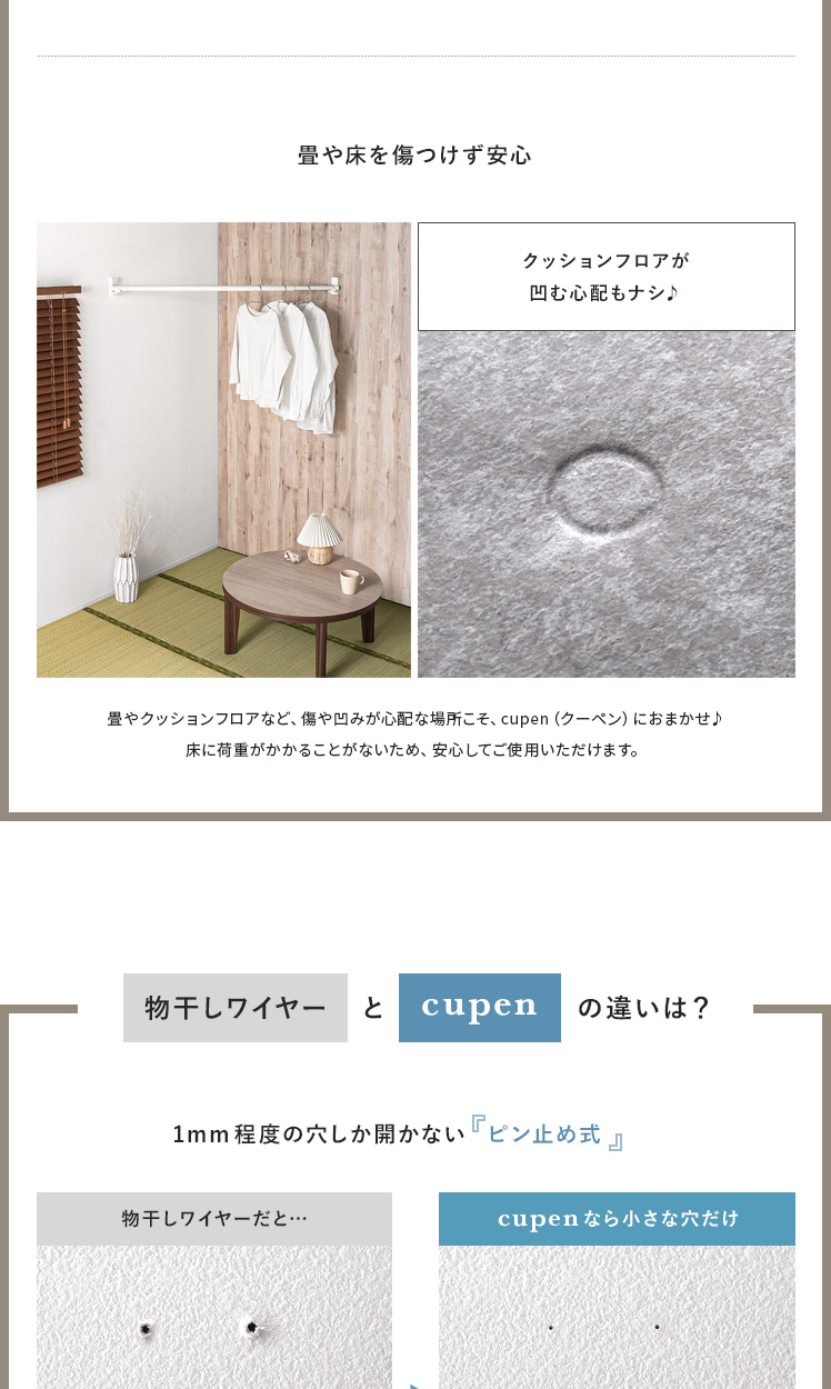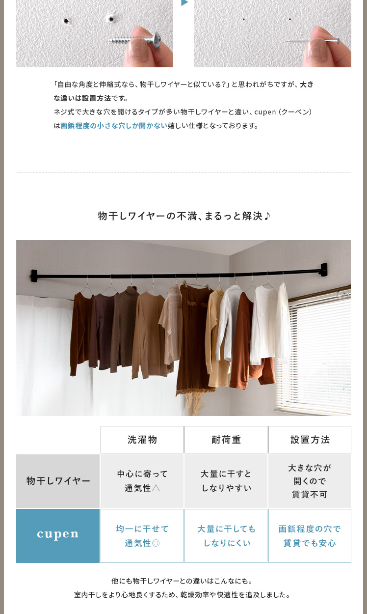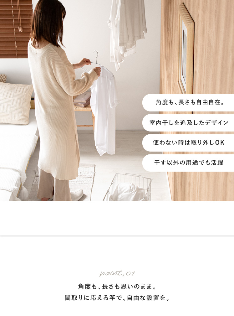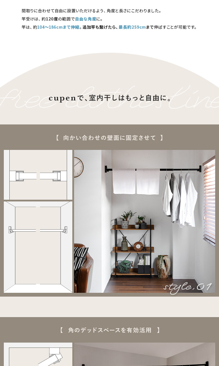 ピン固定室内物干し cupen〔クーペン〕/雨の日・花粉が多い日・防犯対策など、暮らす上で室内干しをする機会は意外と多いもの。“干せたらどんな場所・アイテムでもいい”ではなく、“私の暮らしにぴったりな室内物干し竿”を選んでみませんか?『使う時だけ取り出して、好きな場所で干す』そんな理想的な室内物干し竿、できました。