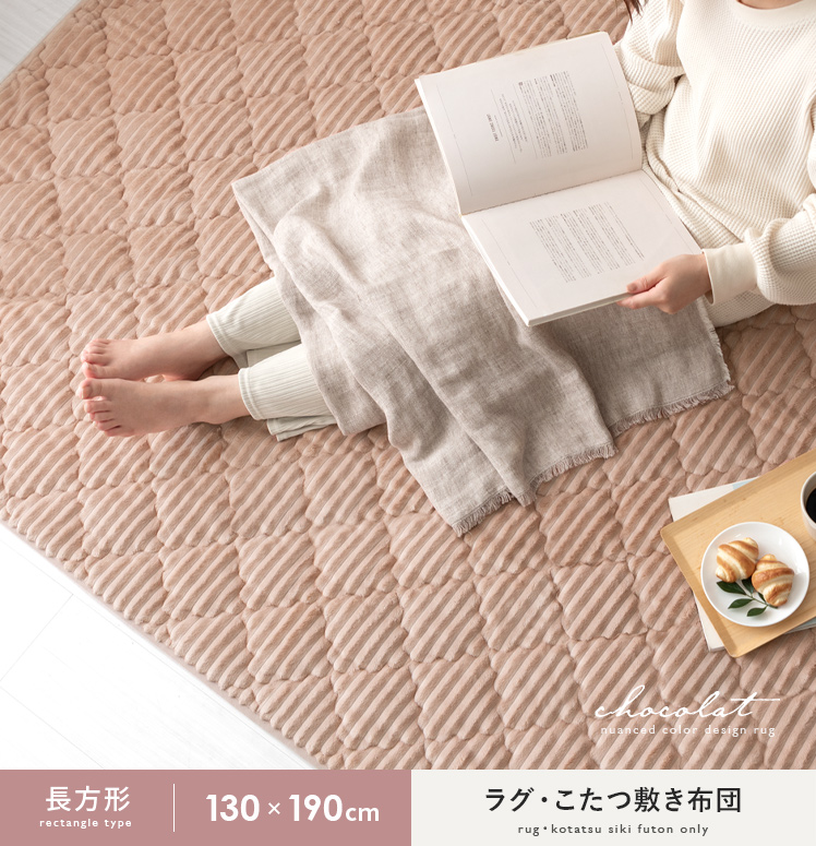 洗えるフランネルキルトラグ・こたつ敷き布団 130×190cm 長方形/とろける肌ざわりのフランネル生地を採用した、心地よいラグ“chocolat(ショコラ)”コーデュロイ調のデザインにキルティング加工を施すことで表情豊かな印象に。ふかふか中綿とウレタンフォームの2層クッションで、寝転んでも座っても気持ちのいいボリューム感となっております。また、落ち着いたくすみカラーで、大人かわいいお部屋に。思わずうとうとしてしまうほどの気持ちよさで、リビングに極上のくつろぎと温もりを。