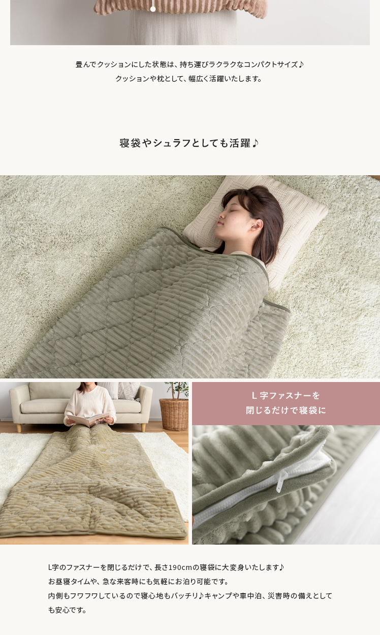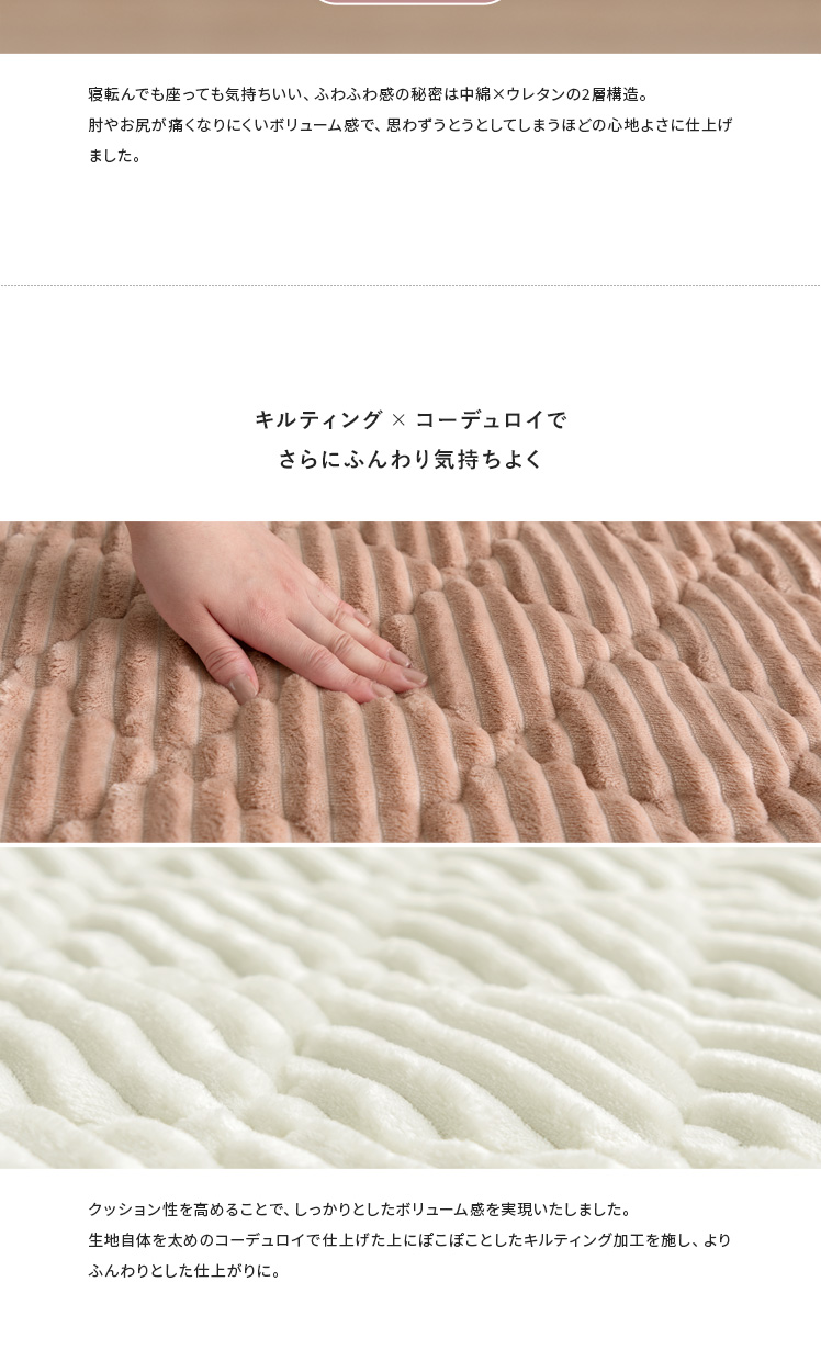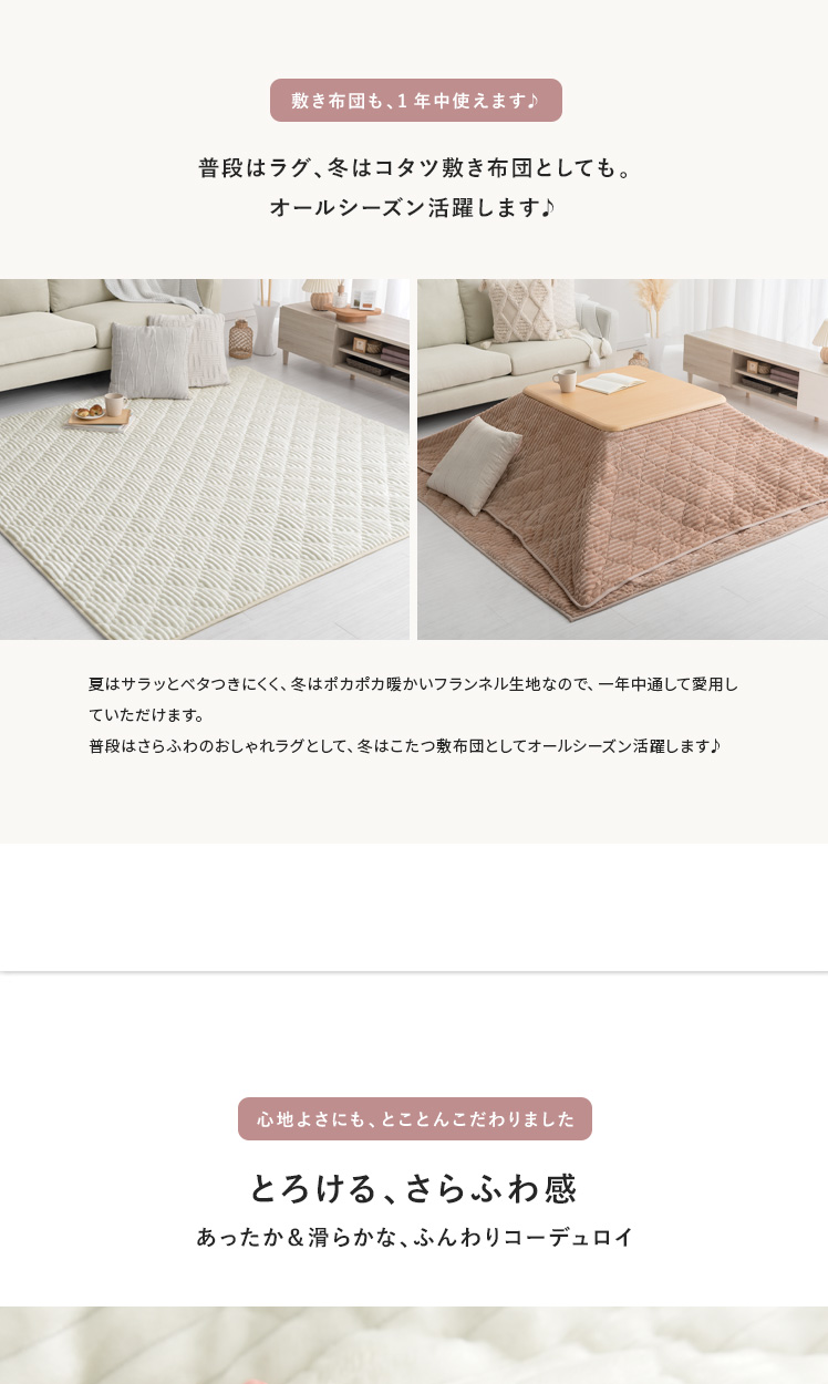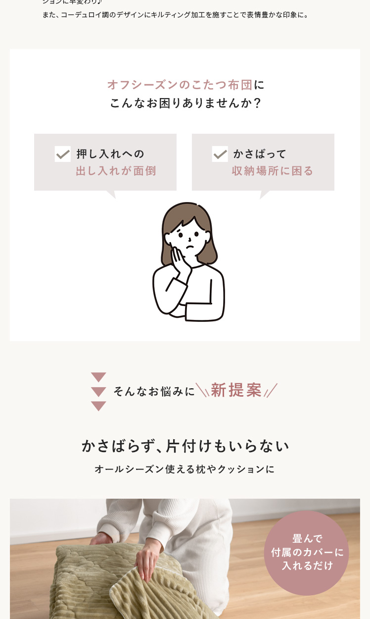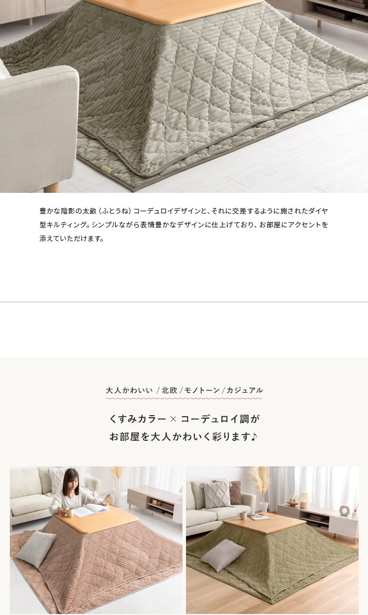 クッションになる薄掛けこたつ布団・敷き布団セット 190×190cm 正方形/冬はこたつ布団、オフシーズンはクッションとして年中活躍する2WAYこたつ布団。同じデザインで統一感のあるラグと、セットでお届けいたします♪畳んで付属のカバーに入れるだけで、収納場所に困りがちなこたつ布団が、可愛らしいクッションに早変わり♪また、コーデュロイ調のデザインにキルティング加工を施すことで表情豊かな印象に。