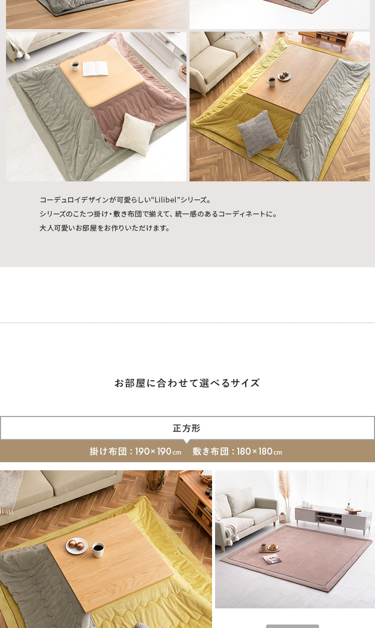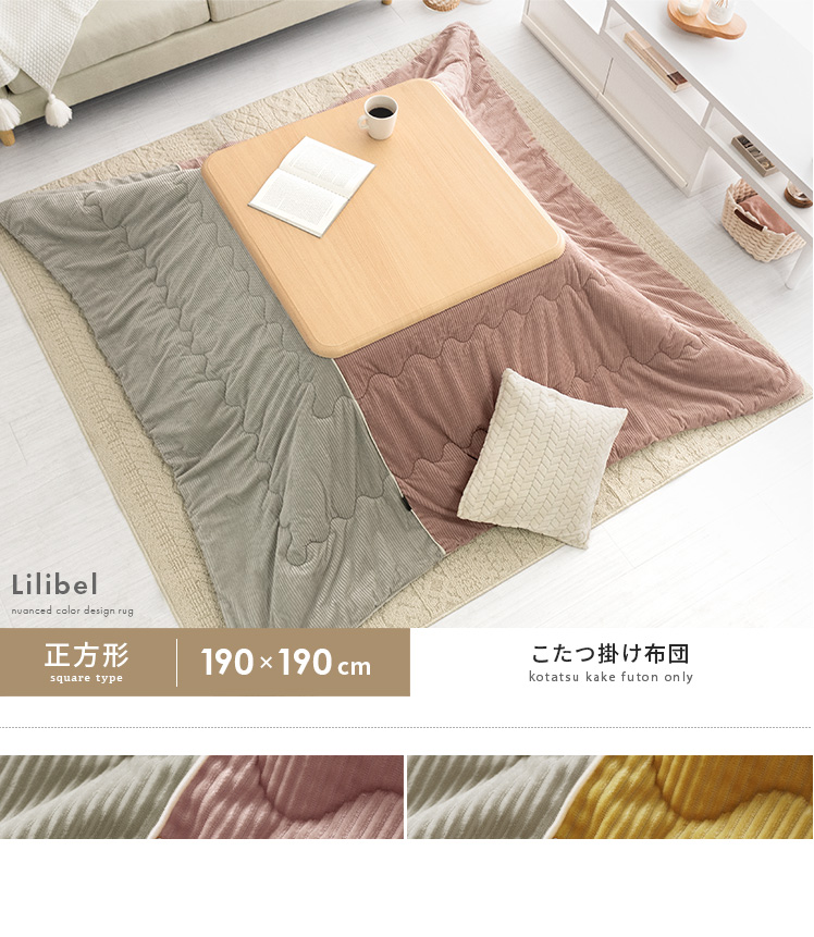 薄掛けこたつ布団 Lilibel〔リリベル〕 190×190cm 正方形タイプ/うっとり幸せな触り心地のフランネル素材を使用したコーデュロイ柄の薄掛けこたつ布団。くすみカラーを合わせた大人可愛いデザインで、落ち着きと遊び心のある空間をお作りいただけます。軽量&乾きやすい設計で、ご自宅でのお洗濯を手軽に♪毛足が短く髪の毛やゴミが奥に詰まりにくいため、日々のお手入れも楽に行っていただけます。大人可愛いデザインのふんわり気持ちの良い薄掛けこたつ布団で、至福のくつろぎ時間をお過ごしください。