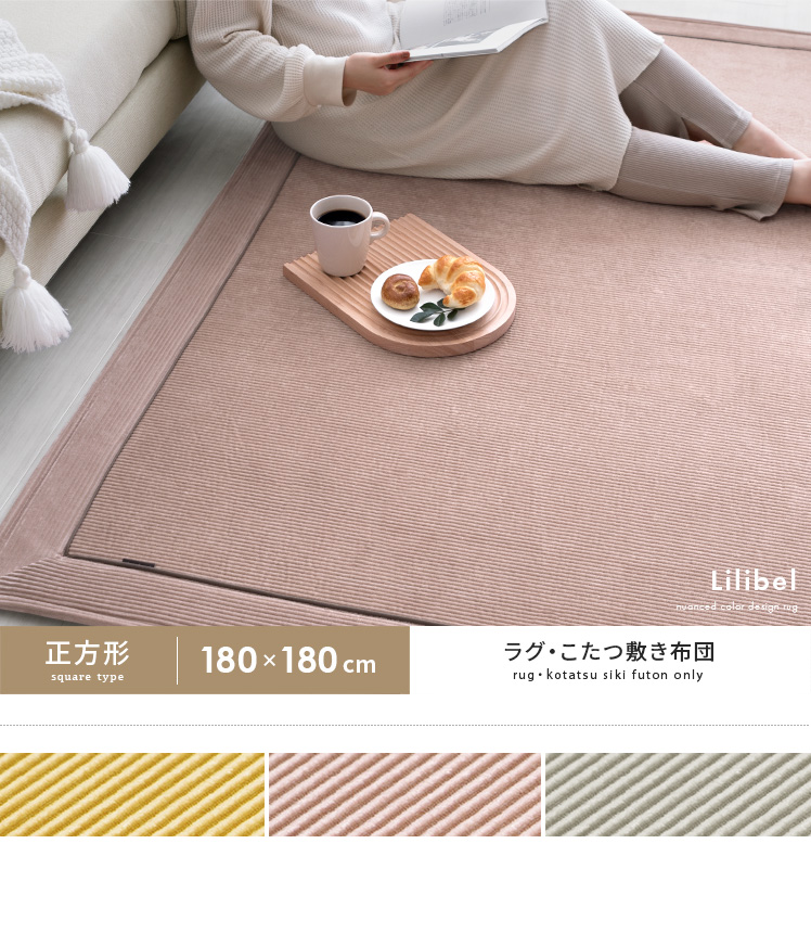 ラグ・こたつ敷き布団 Lilibel〔リリベル〕 180×180cm 正方形タイプ/うっとり幸せな触り心地のフランネル素材を使用したコーデュロイ柄のラグ・こたつ敷き布団。くすみカラーを合わせた大人可愛いデザインで、落ち着きと遊び心のある空間をお作りいただけます。軽量&乾きやすい設計で、ご自宅でのお洗濯を手軽に♪毛足が短く髪の毛やゴミが奥に詰まりにくいため、日々のお手入れも楽に行っていただけます。大人可愛いデザインのふんわり気持ちの良いラグ・こたつ敷き布団で、至福のくつろぎ時間をお過ごしください。