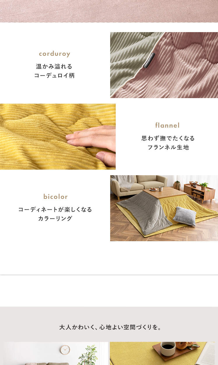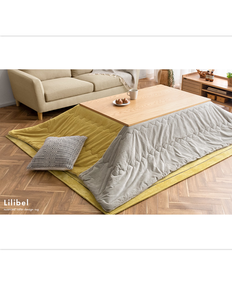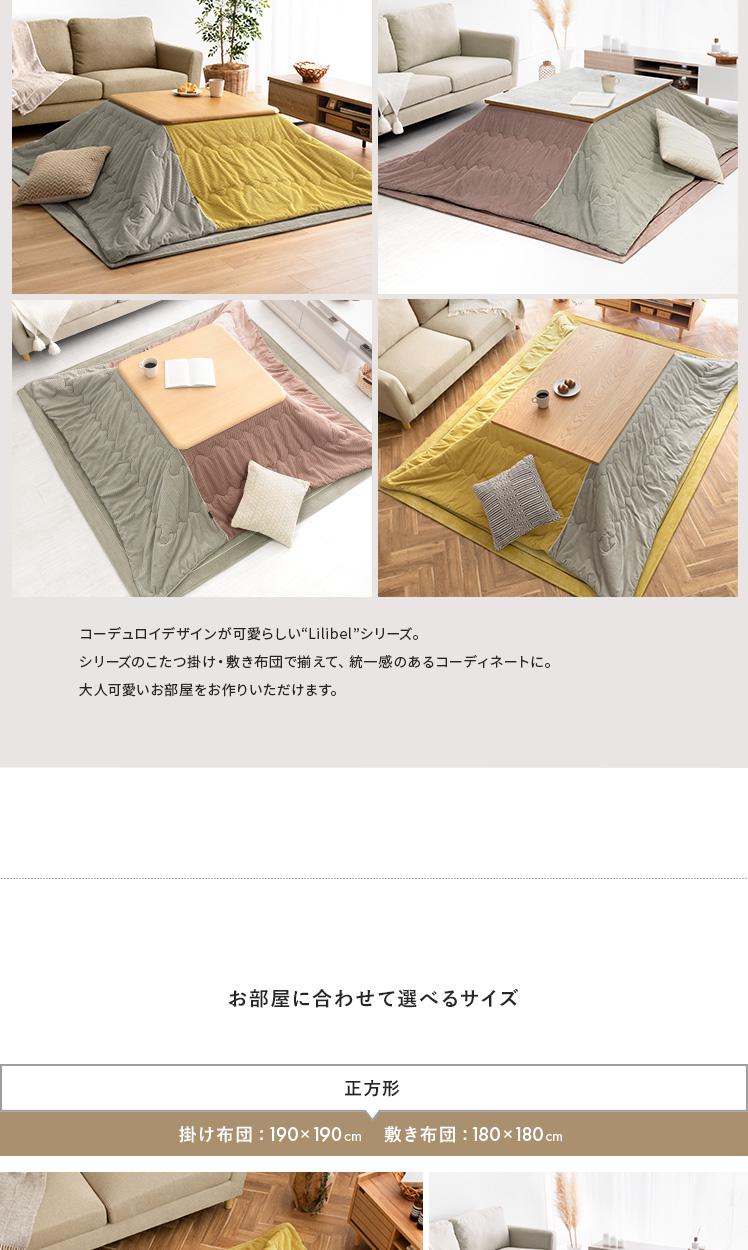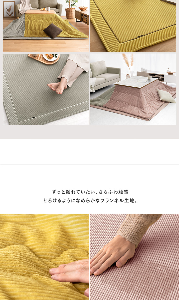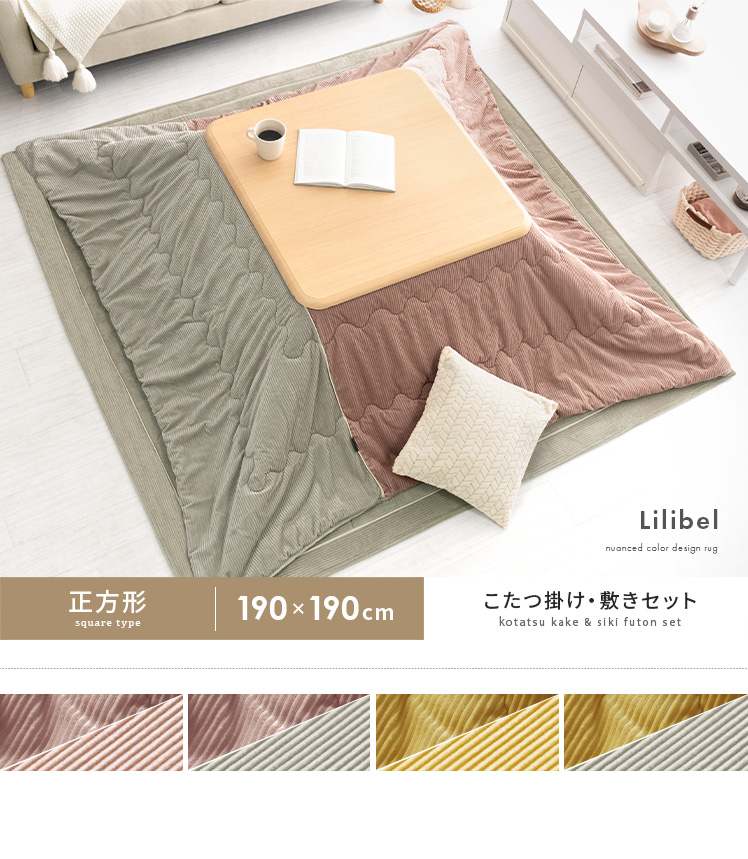 薄掛けこたつ布団 ・敷き布団セット Lilibel〔リリベル〕 190×190cm 正方形タイプ/うっとり幸せな触り心地のフランネル素材を使用したコーデュロイ柄の薄掛けこたつ布団・敷き布団セット。くすみカラーを合わせた大人可愛いデザインで、落ち着きと遊び心のある空間をお作りいただけます。軽量&乾きやすい設計で、ご自宅でのお洗濯を手軽に♪毛足が短く髪の毛やゴミが奥に詰まりにくいため、日々のお手入れも楽に行っていただけます。大人可愛いデザインのふんわり気持ちの良い薄掛けこたつ布団・敷き布団セットで、至福のくつろぎ時間をお過ごしください。
