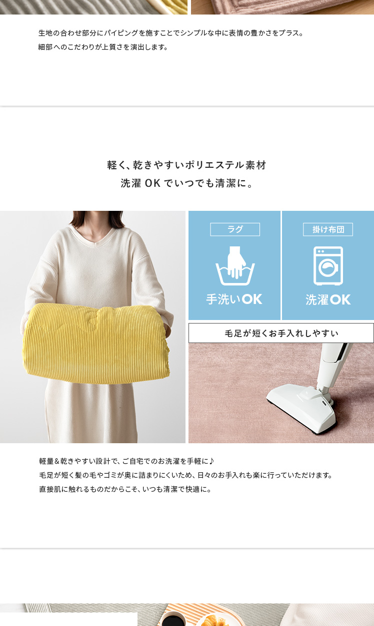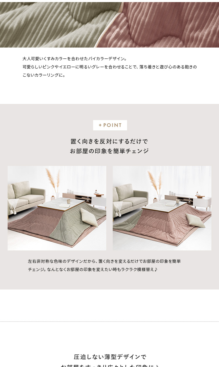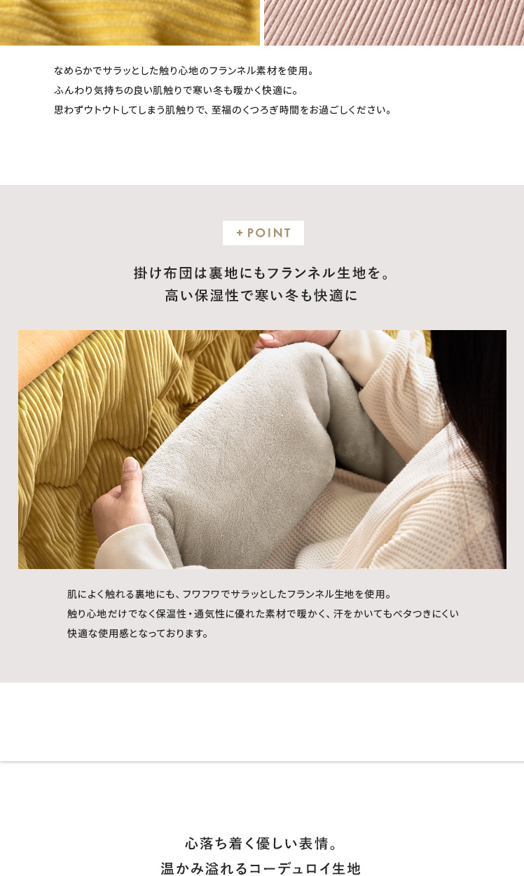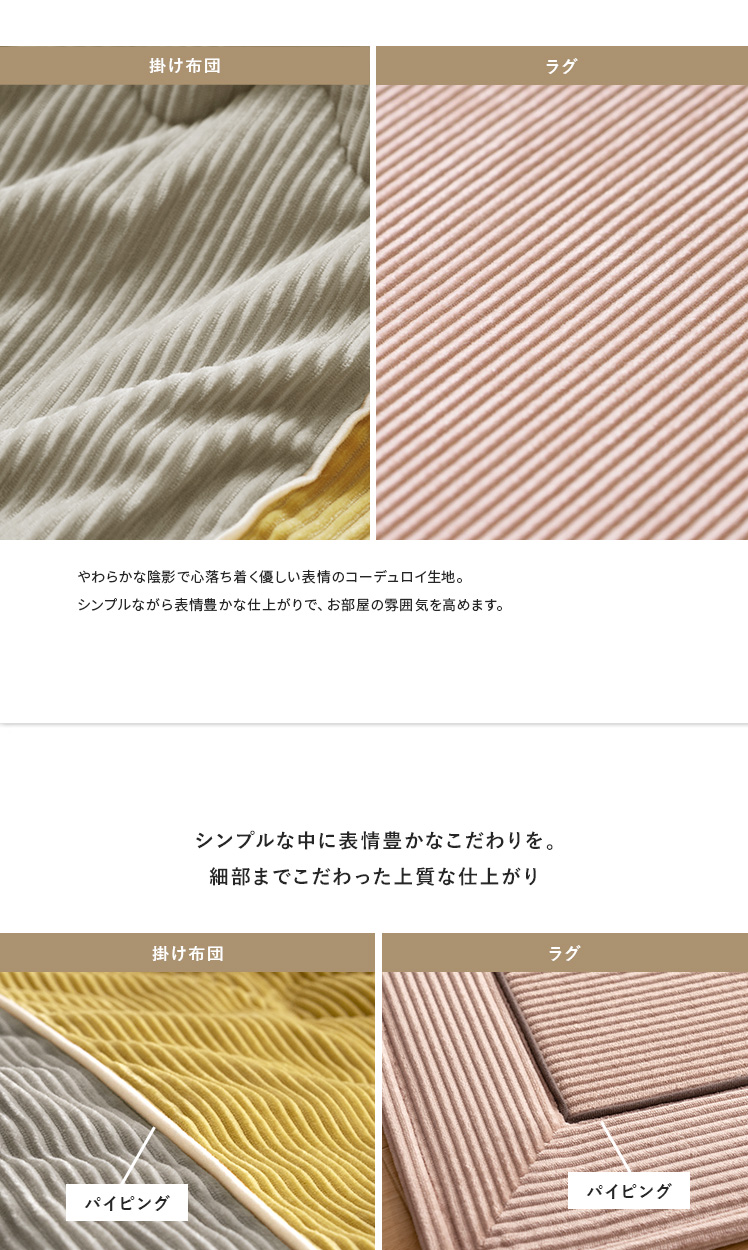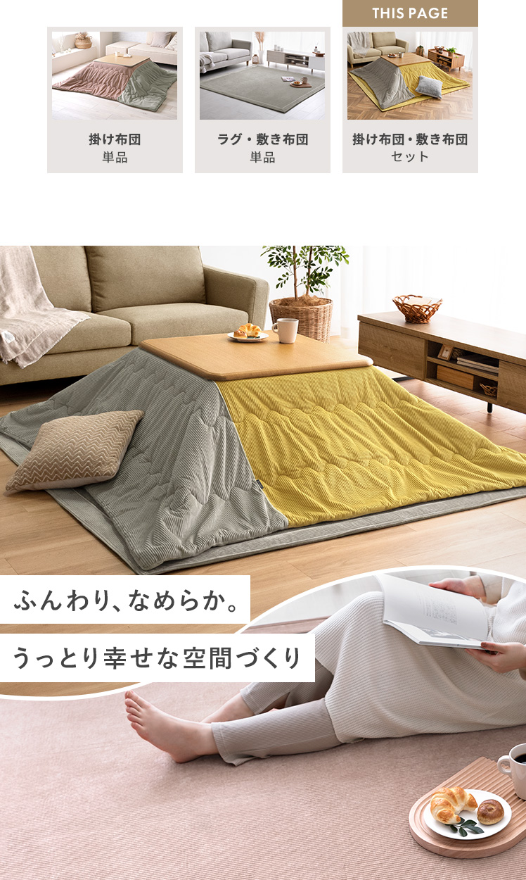 薄掛けこたつ布団 ・敷き布団セット Lilibel〔リリベル〕 190×190cm 正方形タイプ/うっとり幸せな触り心地のフランネル素材を使用したコーデュロイ柄の薄掛けこたつ布団・敷き布団セット。くすみカラーを合わせた大人可愛いデザインで、落ち着きと遊び心のある空間をお作りいただけます。軽量&乾きやすい設計で、ご自宅でのお洗濯を手軽に♪毛足が短く髪の毛やゴミが奥に詰まりにくいため、日々のお手入れも楽に行っていただけます。大人可愛いデザインのふんわり気持ちの良い薄掛けこたつ布団・敷き布団セットで、至福のくつろぎ時間をお過ごしください。