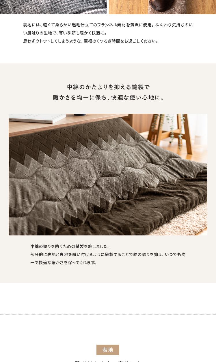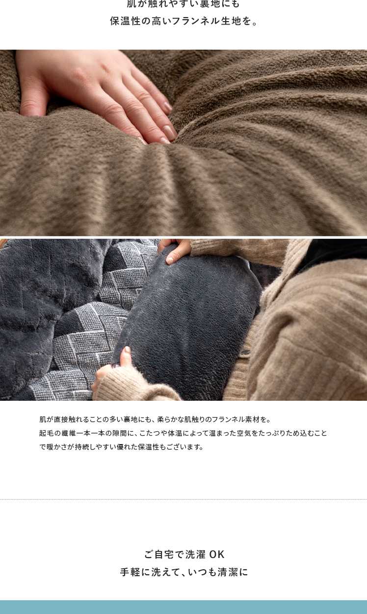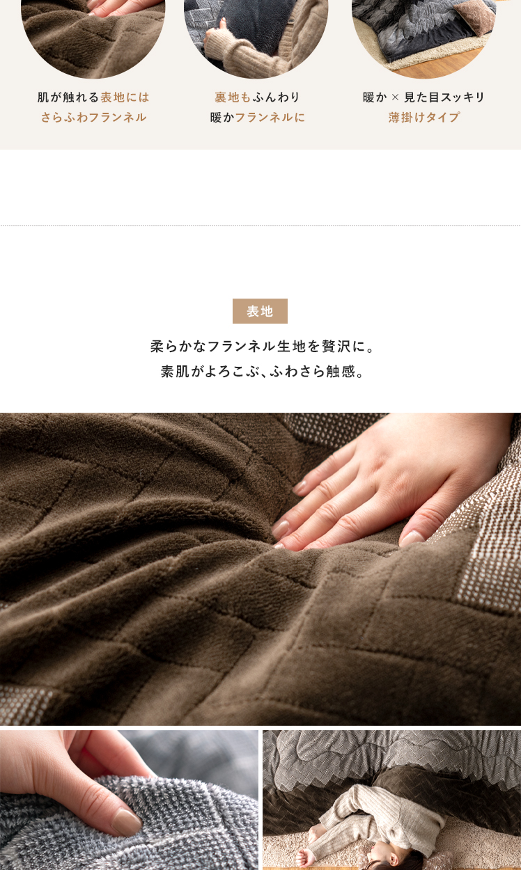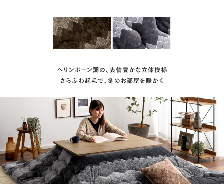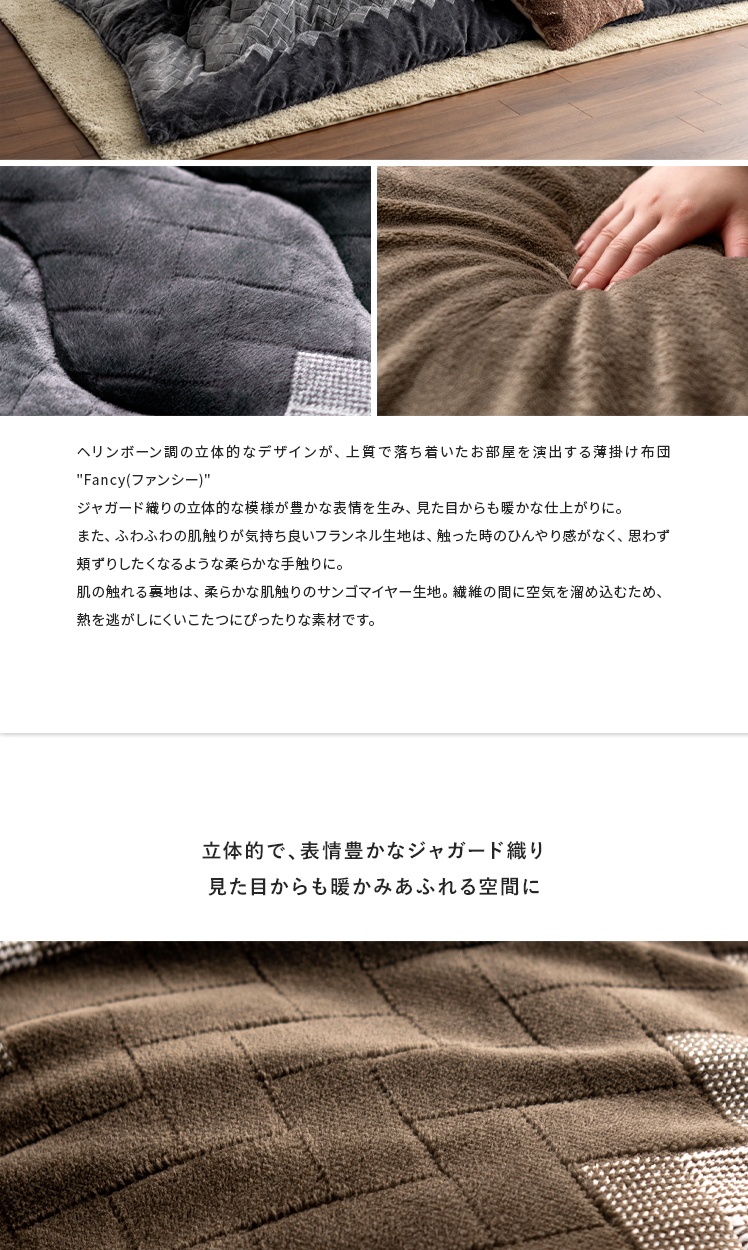 薄掛けこたつ布団 Fancy〔ファンシー〕 190×240cm 長方形タイプ/ヘリンボーン調の立体的なデザインが、上質で落ち着いたお部屋を演出する薄掛け布団"Fancy(ファンシー)"ジャガード織りの立体的な模様が豊かな表情を生み、見た目からも暖かな仕上がりに。また、ふわふわの肌触りが気持ち良いフランネル生地は、触った時のひんやり感がなく、思わず頬ずりしたくなるような柔らかな手触りに。肌の触れる裏地は、柔らかな肌触りのサンゴマイヤー生地。繊維の間に空気を溜め込むため、熱を逃がしにくいこたつにぴったりな素材です。