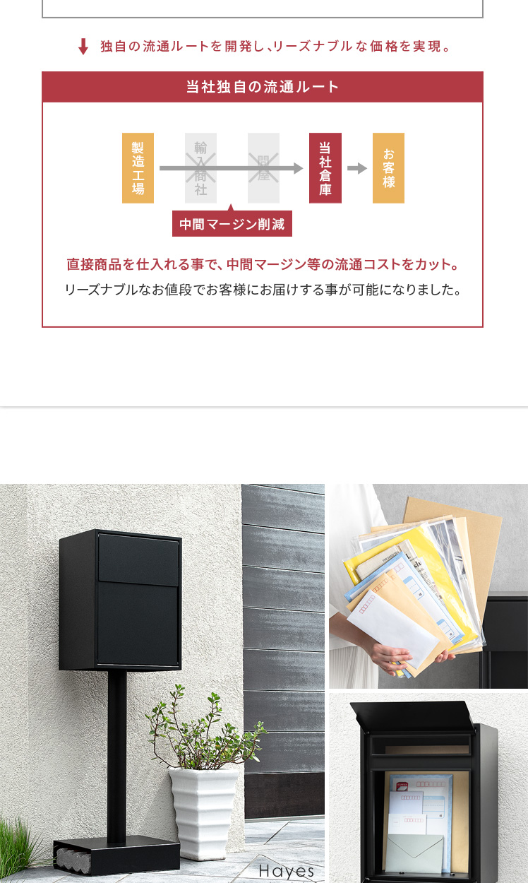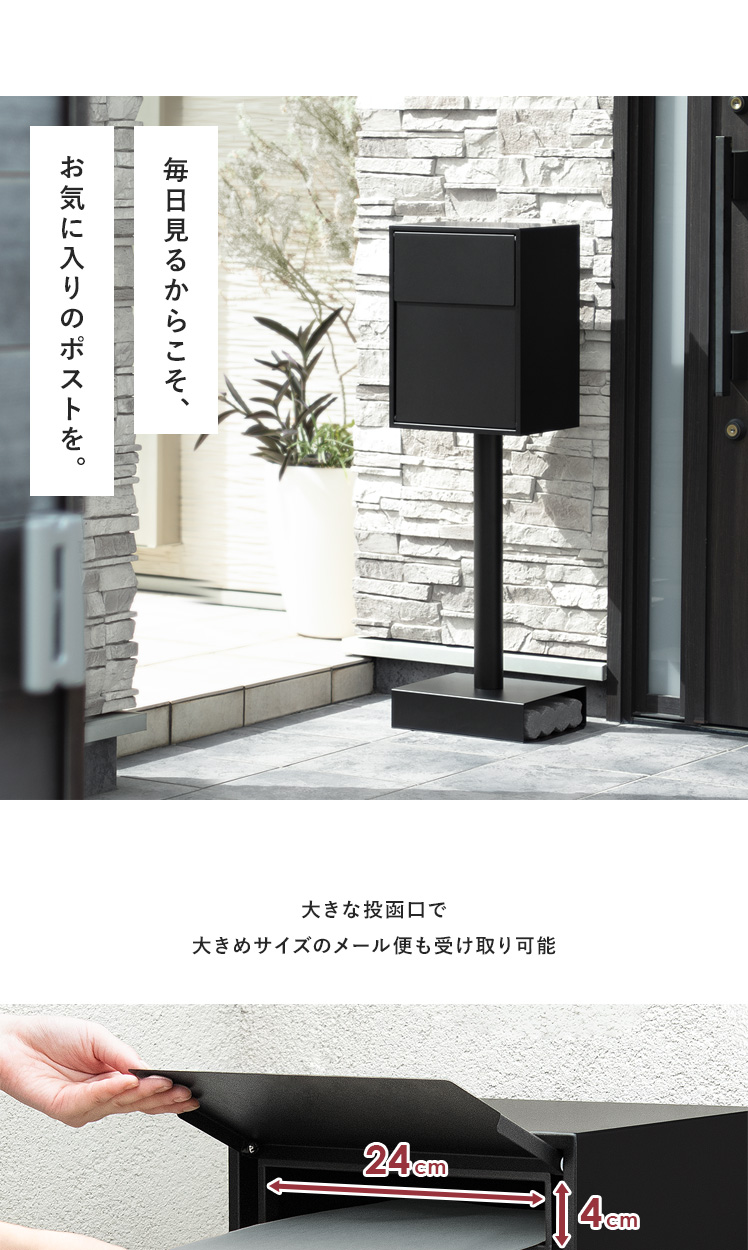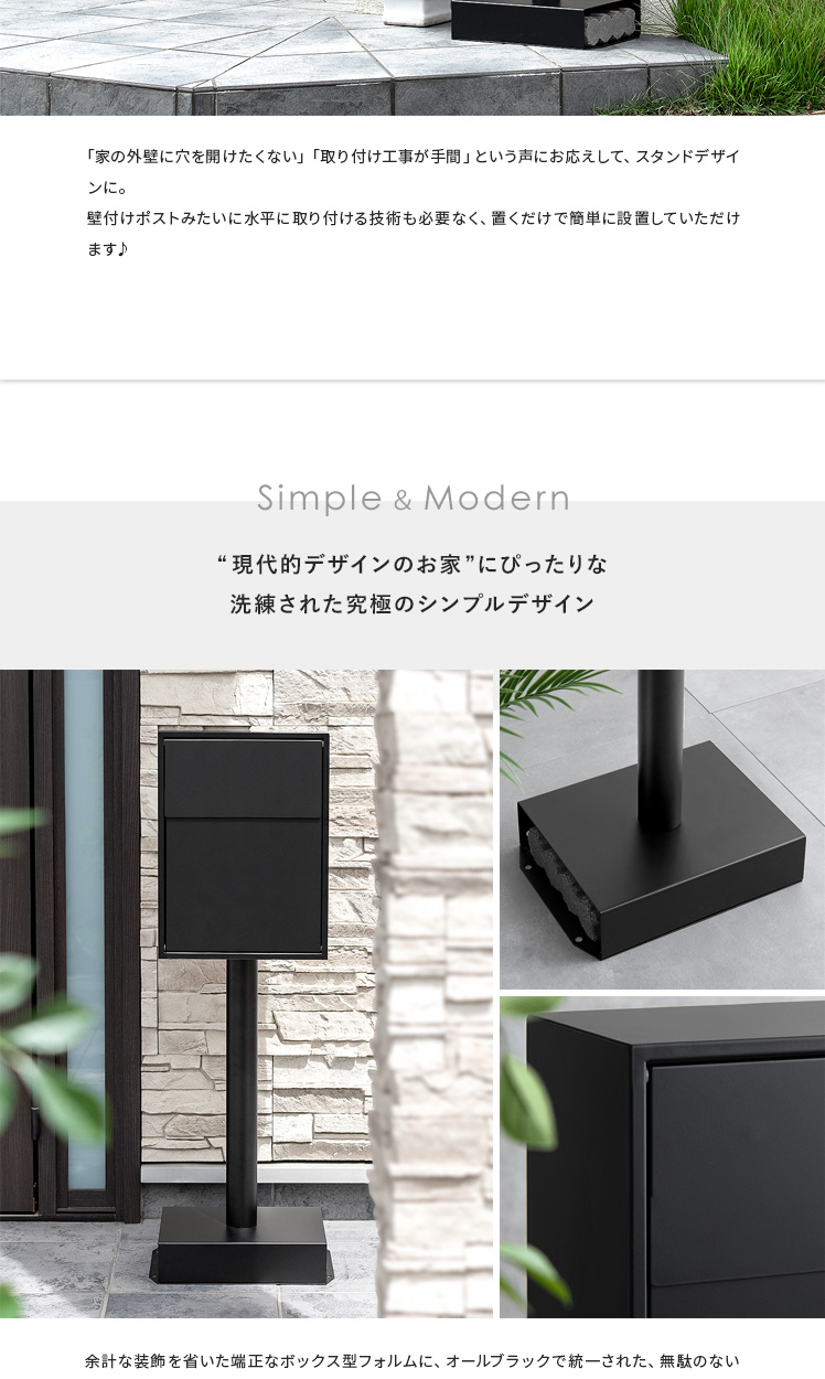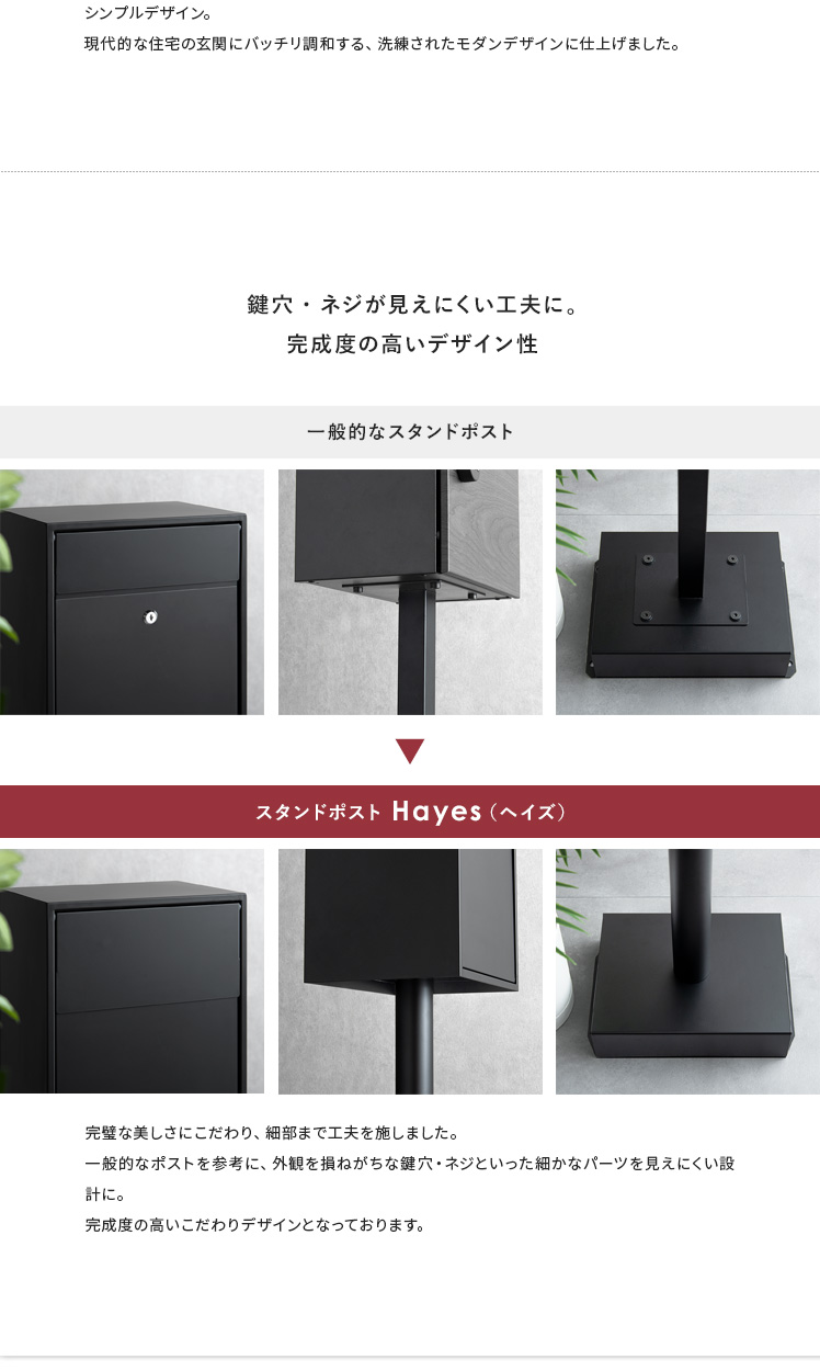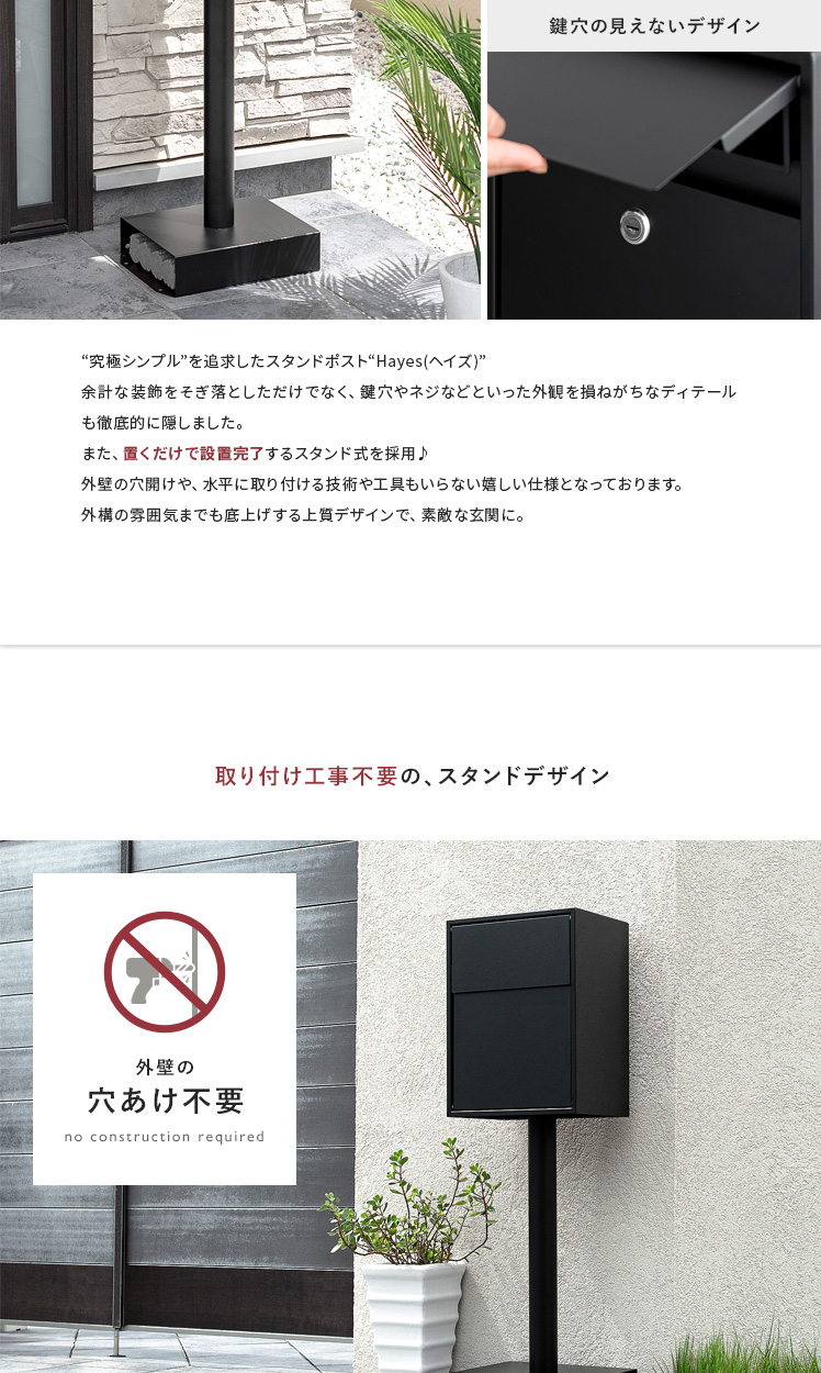 スタンドポスト Hayes〔ヘイズ〕/“究極シンプル”を追求したスタンドポスト“Hayes(ヘイズ)”余計な装飾をそぎ落としただけでなく、鍵穴やネジなどといった外観を損ねがちなディテールも徹底的に隠しました。また、置くだけで設置完了するスタンド式を採用♪外壁の穴開けや、水平に取り付ける技術や工具もいらない嬉しい仕様となっております。外構の雰囲気までも底上げする上質デザインで、素敵な玄関に。