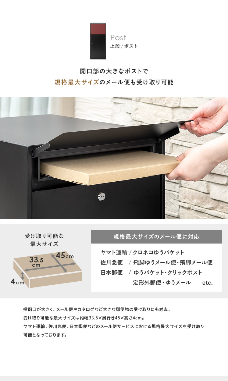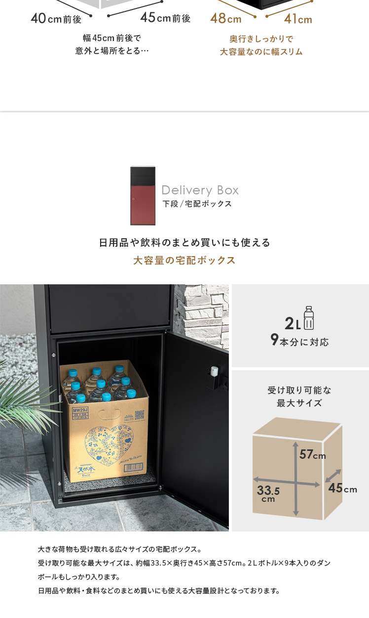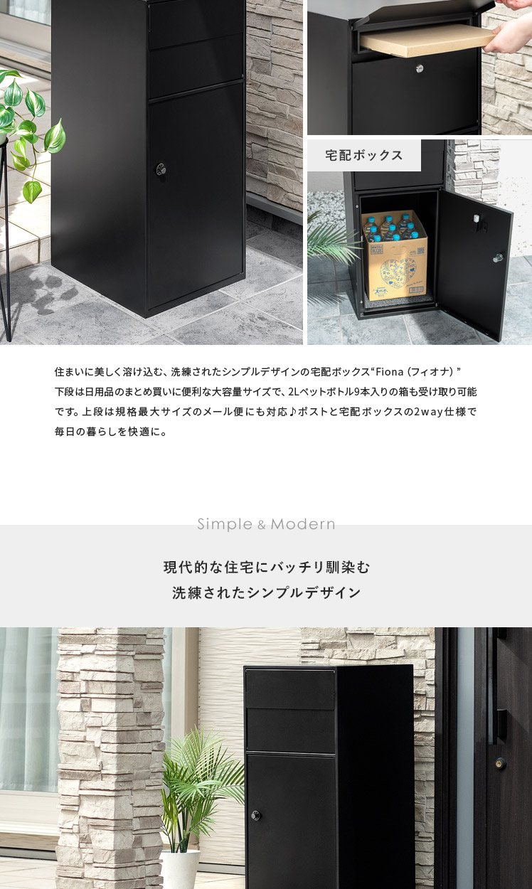 ポスト一体型宅配ボックス Fiona〔フィオナ〕/住まいに美しく溶け込む、洗練されたシンプルデザインの宅配ボックス“Fiona(フィオナ)”下段は日用品のまとめ買いに便利な大容量サイズで、2Lペットボトル9本入りの箱も受け取り可能です。上段は規格最大サイズのメール便にも対応♪ポストと宅配ボックスの2way仕様で毎日の暮らしを快適に。
