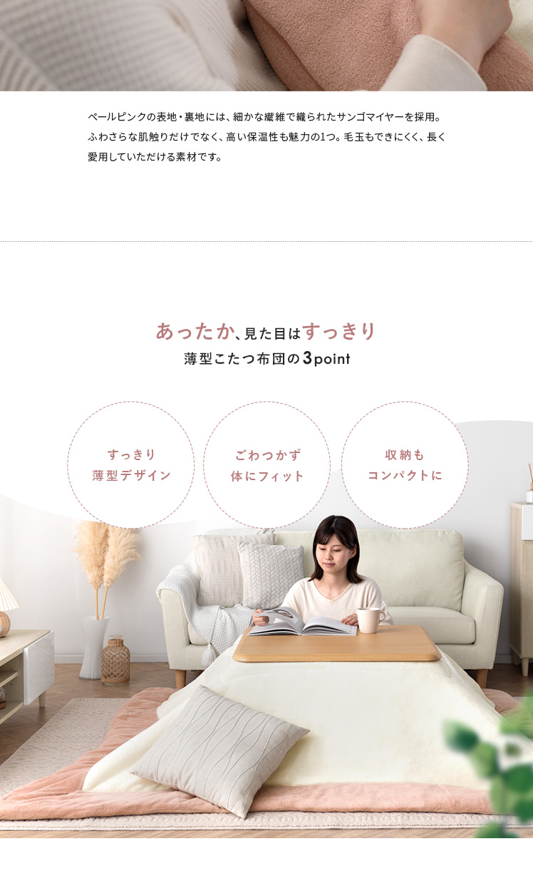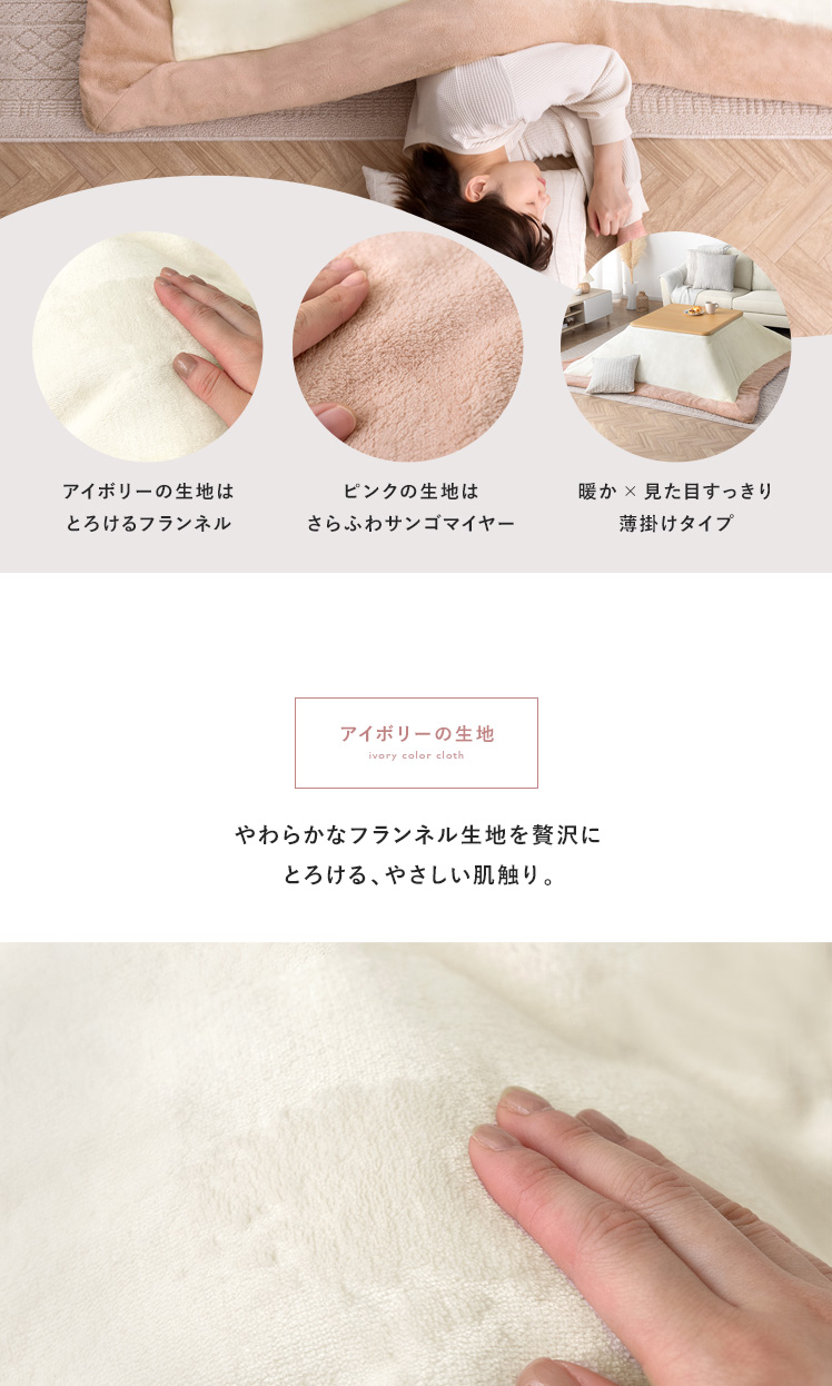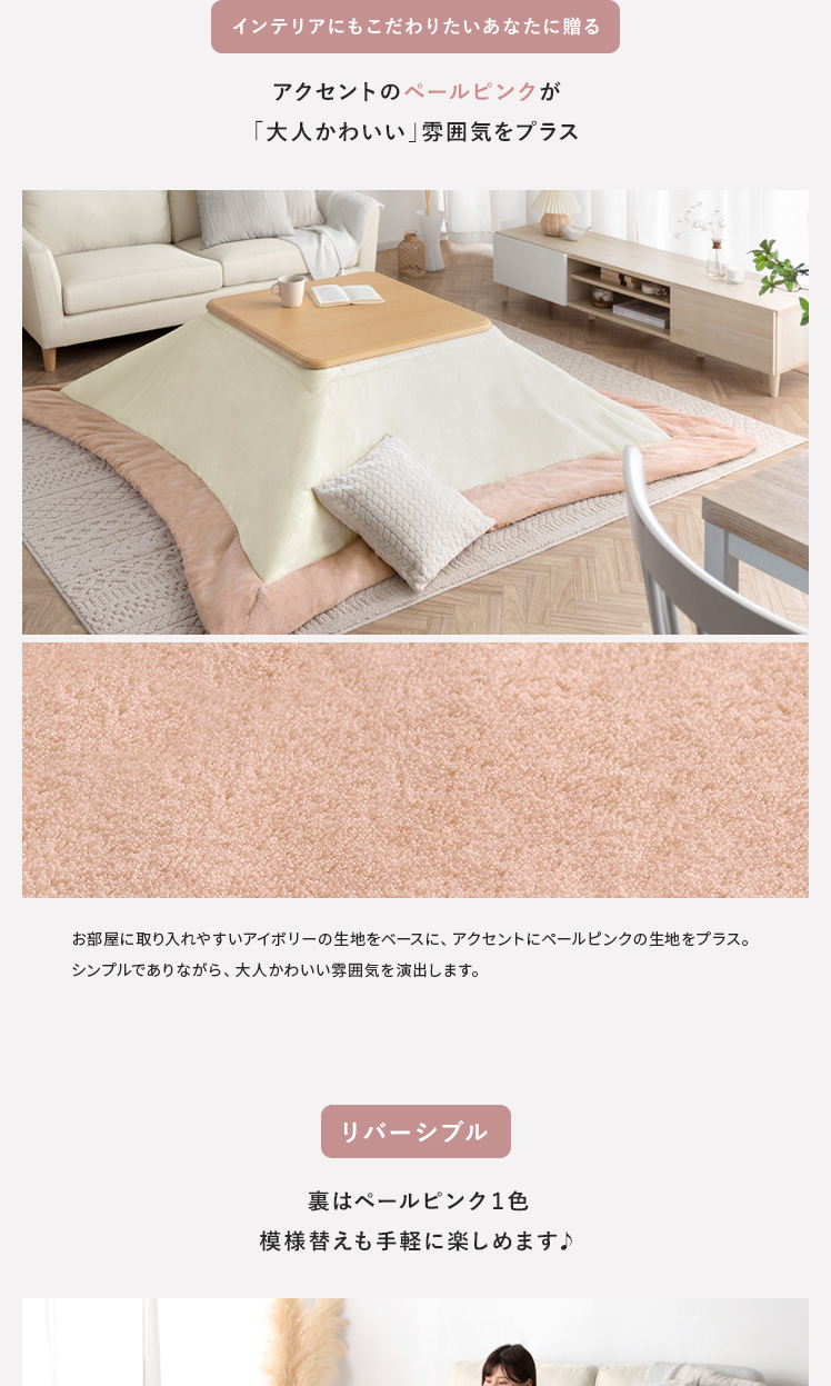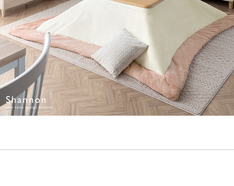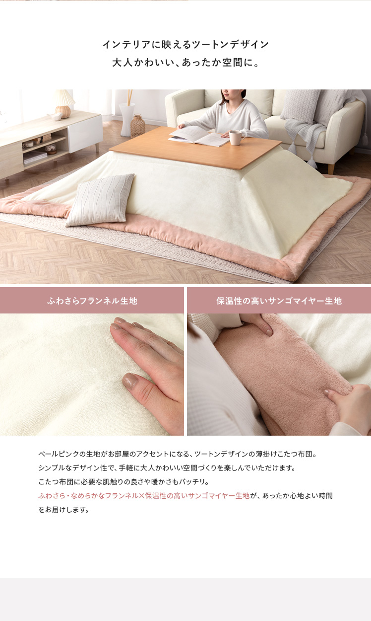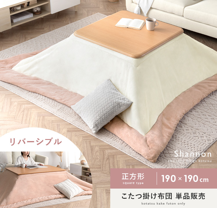 薄掛けこたつ布団 Shannon〔シャノン〕 190×190cm 正方形/ペールピンクの生地がお部屋のアクセントになる、ツートンデザインの薄掛けこたつ布団。シンプルなデザイン性で、手軽に大人かわいい空間づくりを楽しんでいただけます。こたつ布団に必要な肌触りの良さや暖かさもバッチリ。ふわさら・なめらかなフランネル×保温性の高いサンゴマイヤー生地が、あったか心地よい時間をお届けします。