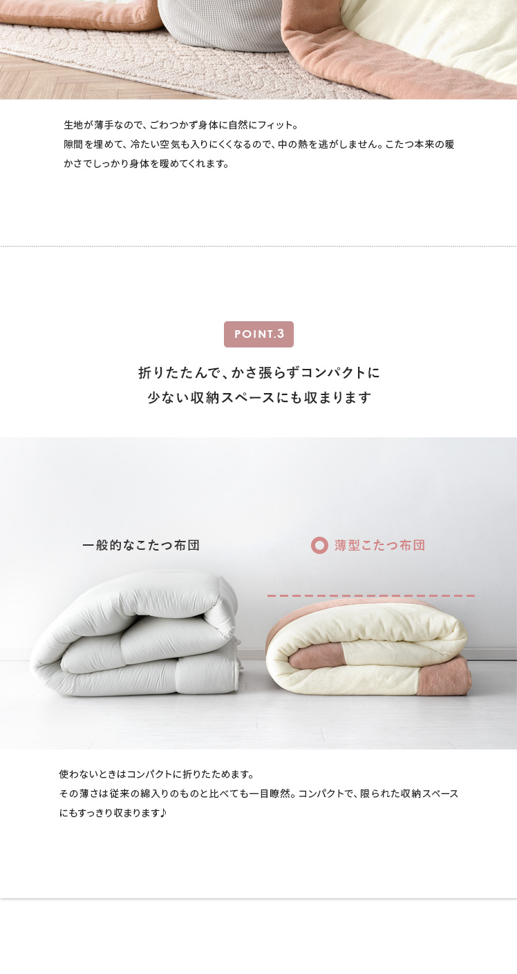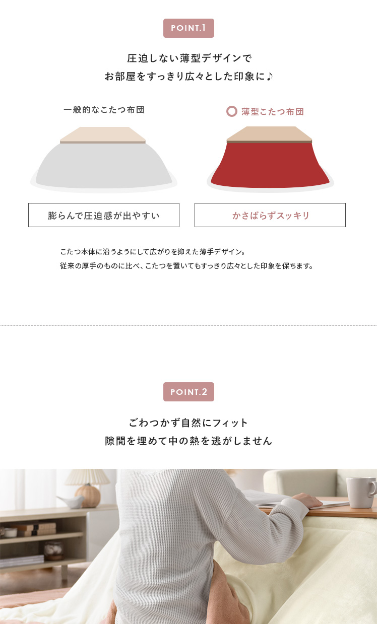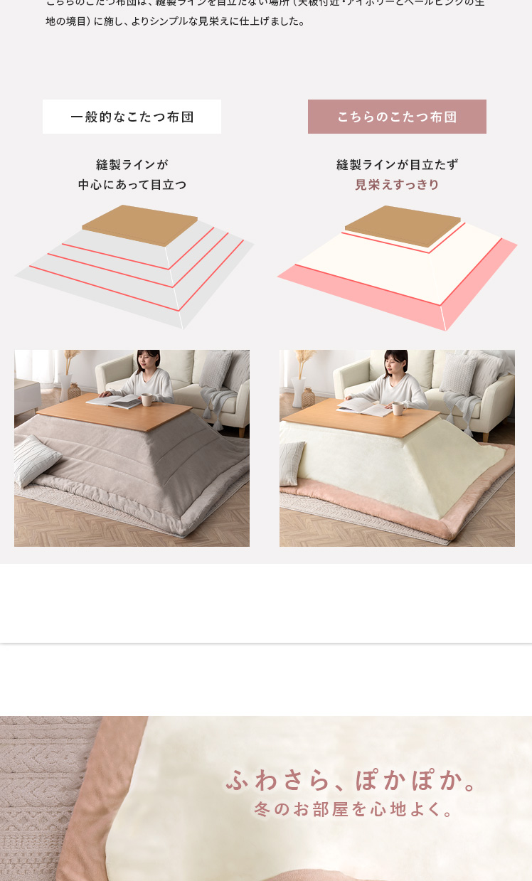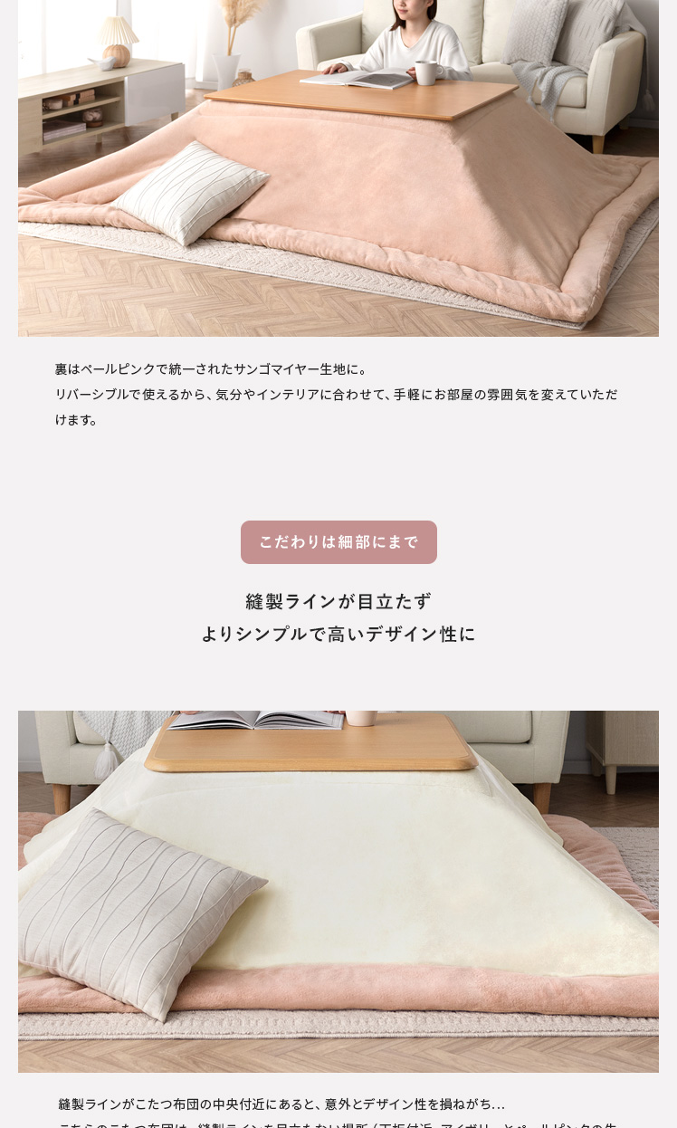 薄掛けこたつ布団 Shannon〔シャノン〕 190×190cm 正方形/ペールピンクの生地がお部屋のアクセントになる、ツートンデザインの薄掛けこたつ布団。シンプルなデザイン性で、手軽に大人かわいい空間づくりを楽しんでいただけます。こたつ布団に必要な肌触りの良さや暖かさもバッチリ。ふわさら・なめらかなフランネル×保温性の高いサンゴマイヤー生地が、あったか心地よい時間をお届けします。