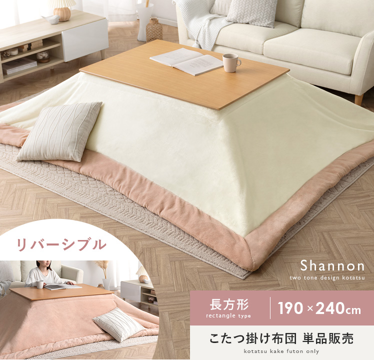 薄掛けこたつ布団 Shannon〔シャノン〕 190×240cm 長方形/ペールピンクの生地がお部屋のアクセントになる、ツートンデザインの薄掛けこたつ布団。シンプルなデザイン性で、手軽に大人かわいい空間づくりを楽しんでいただけます。こたつ布団に必要な肌触りの良さや暖かさもバッチリ。ふわさら・なめらかなフランネル×保温性の高いサンゴマイヤー生地が、あったか心地よい時間をお届けします。