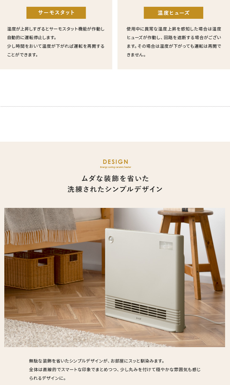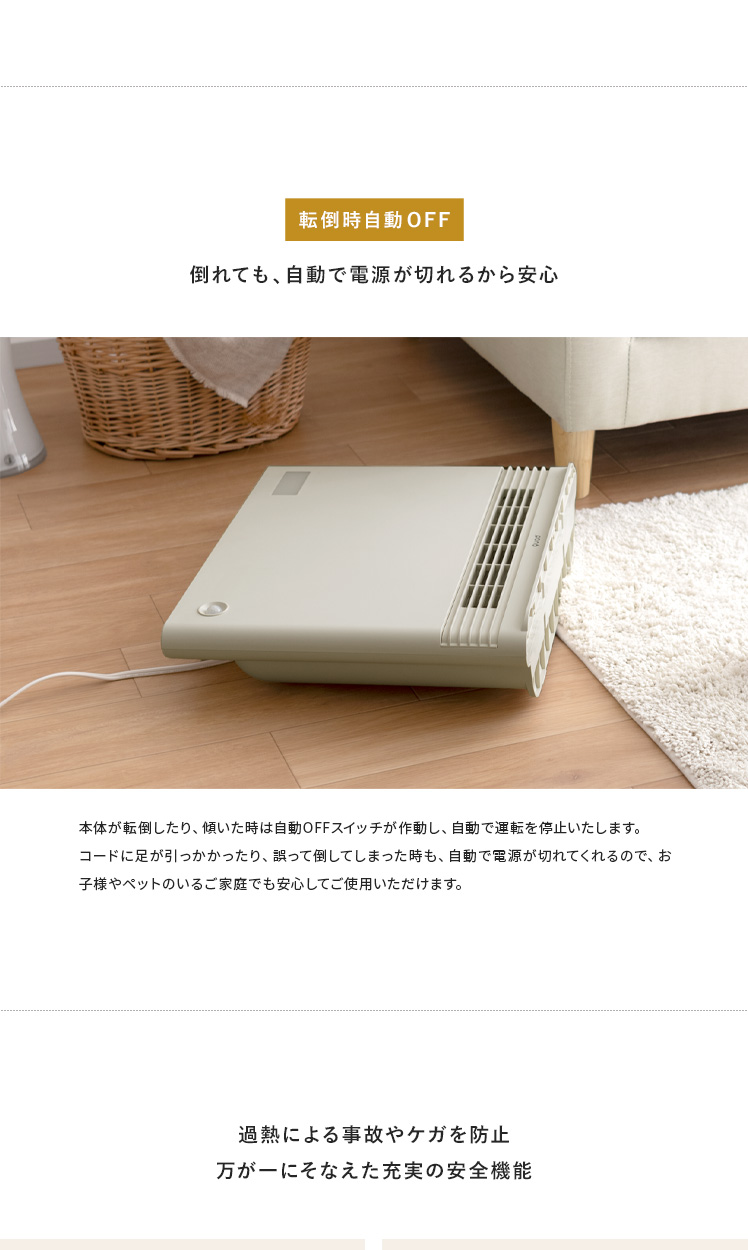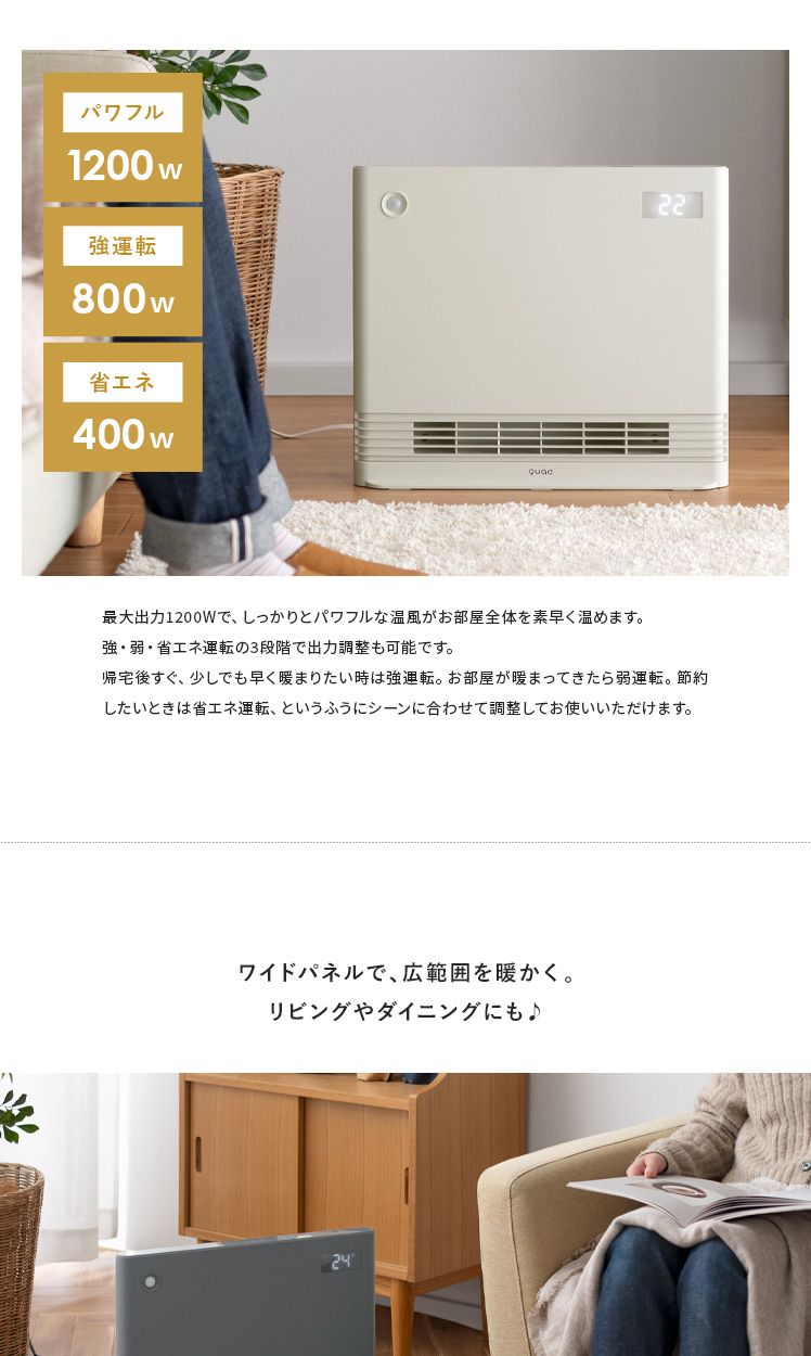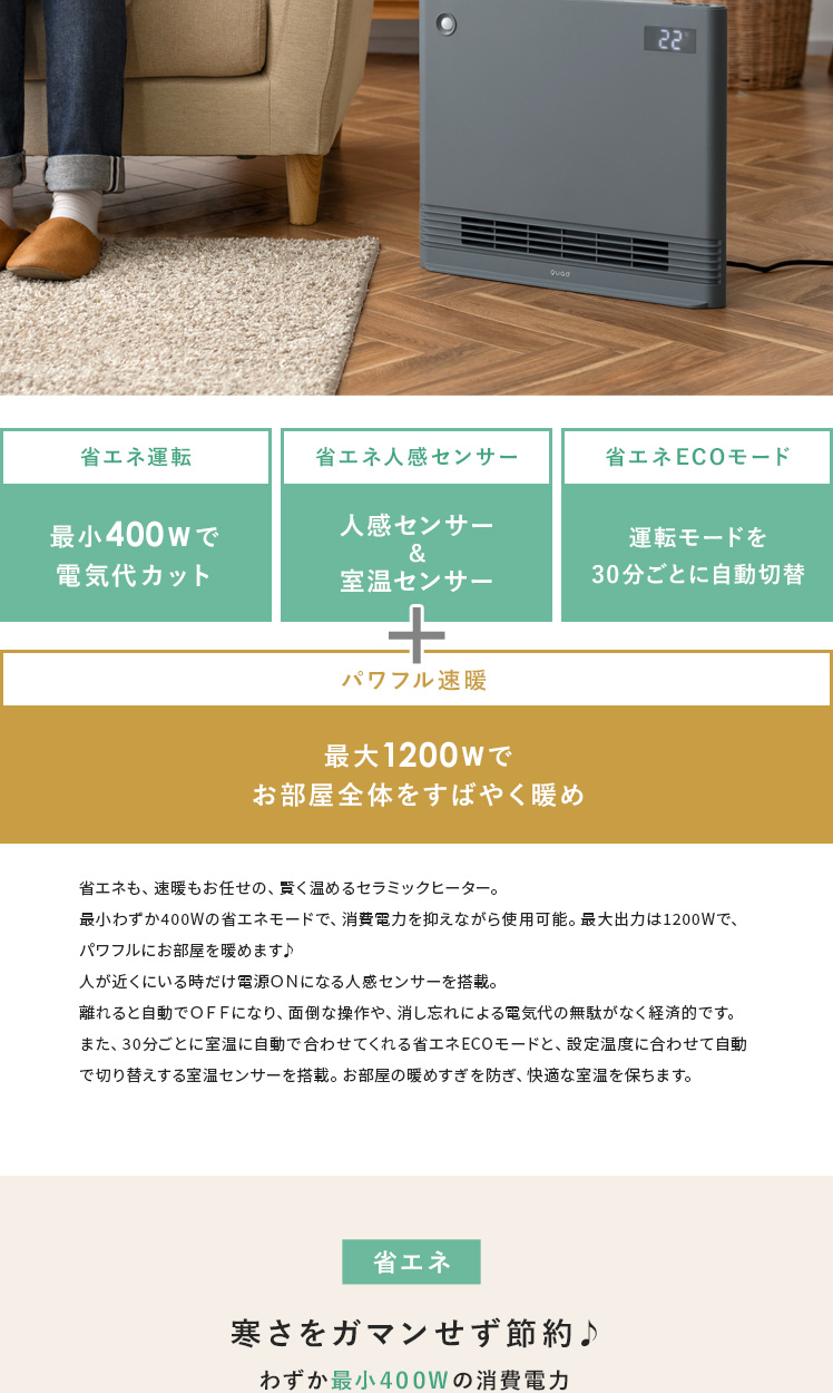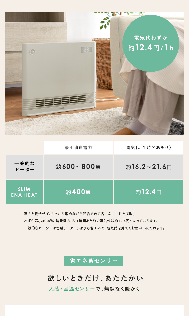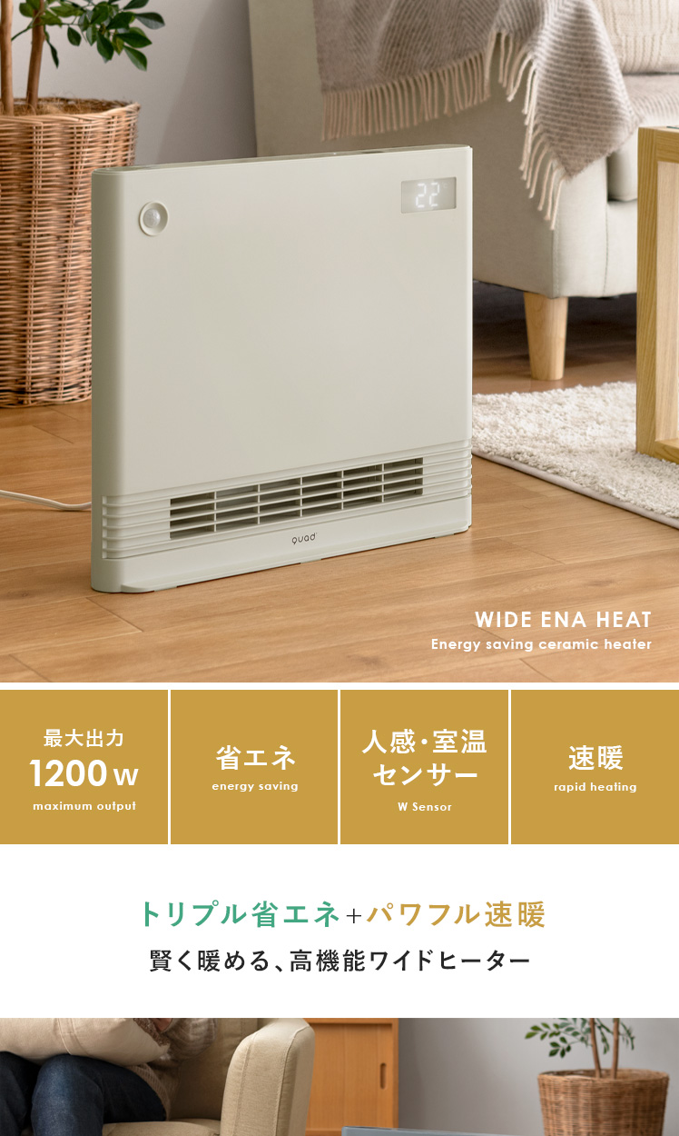 省エネセラミックヒーター WIDE ENA HEAT〔ワイドエナヒート〕/省エネも、速暖もお任せの、賢く温めるセラミックヒーター。最小わずか400Wの省エネモードで、消費電力を抑えながら使用可能。最大出力は1200Wで、パワフルにお部屋を暖めます♪人が近くにいる時だけ電源ONになる人感センサーを搭載。離れると自動でOFFになり、面倒な操作や、消し忘れによる電気代の無駄がなく経済的です。また、30分ごとに室温に自動で合わせてくれる省エネECOモードと、設定温度に合わせて自動で切り替えする室温センサーを搭載。お部屋の暖めすぎを防ぎ、快適な室温を保ちます。