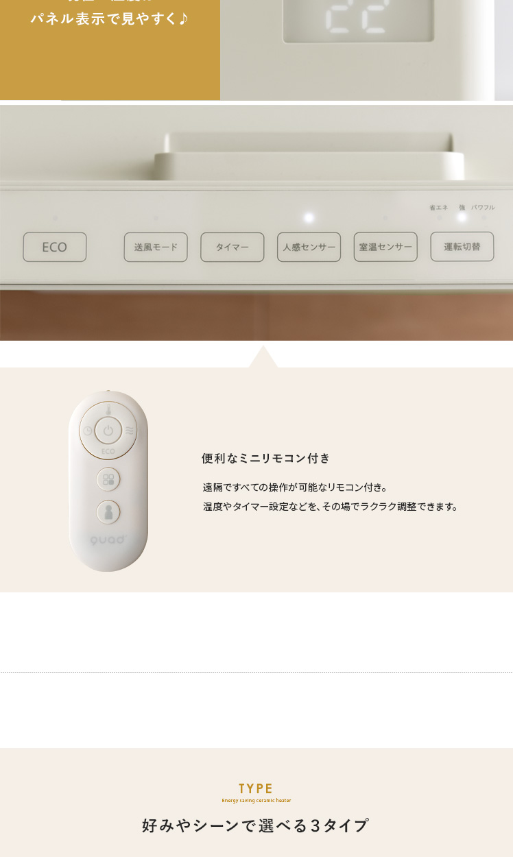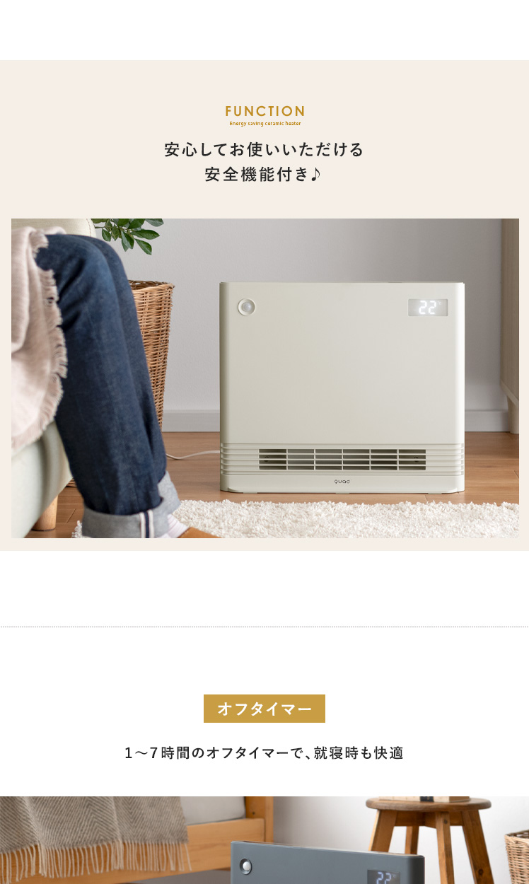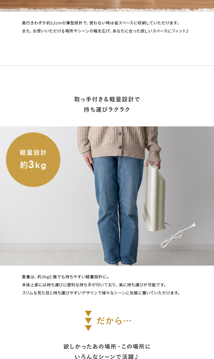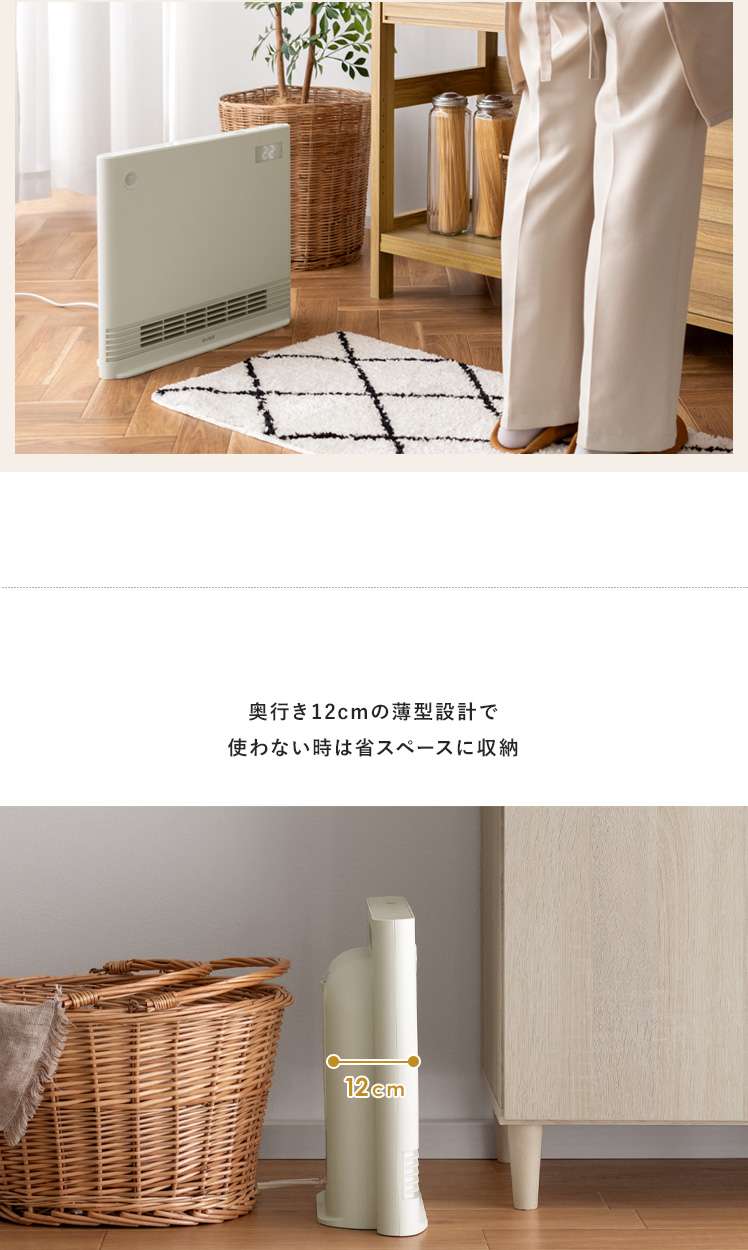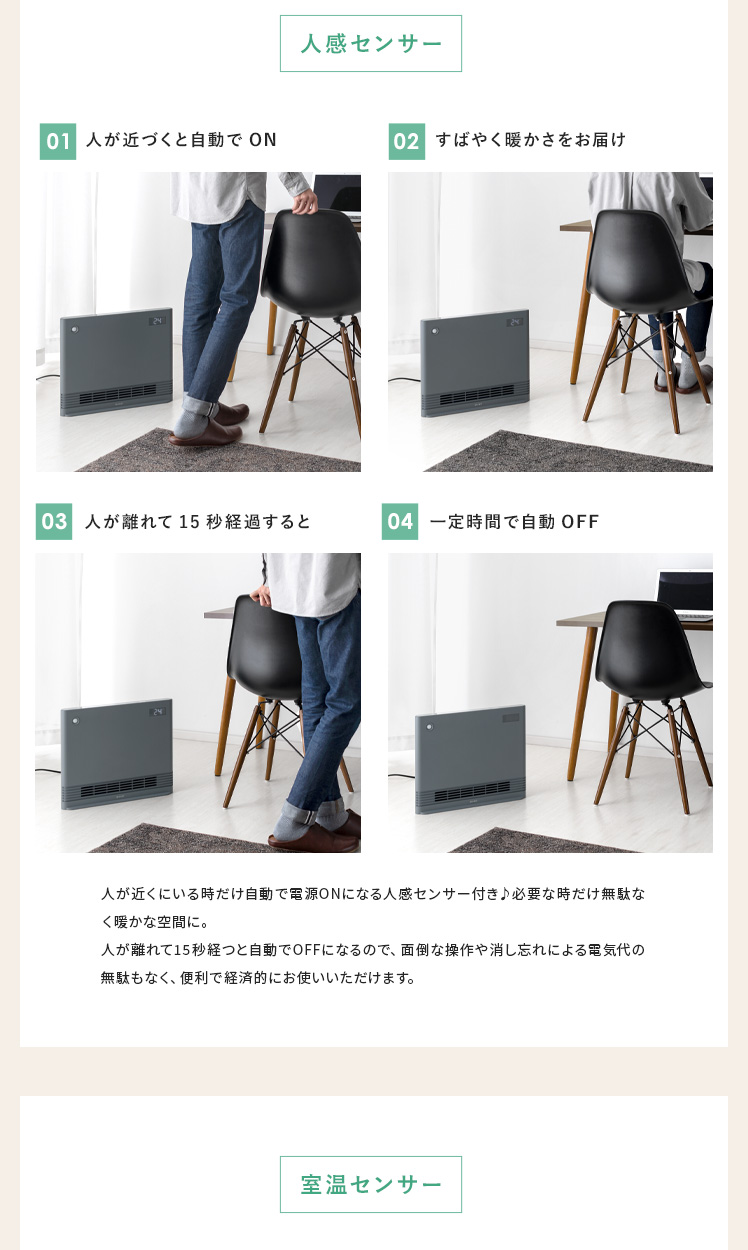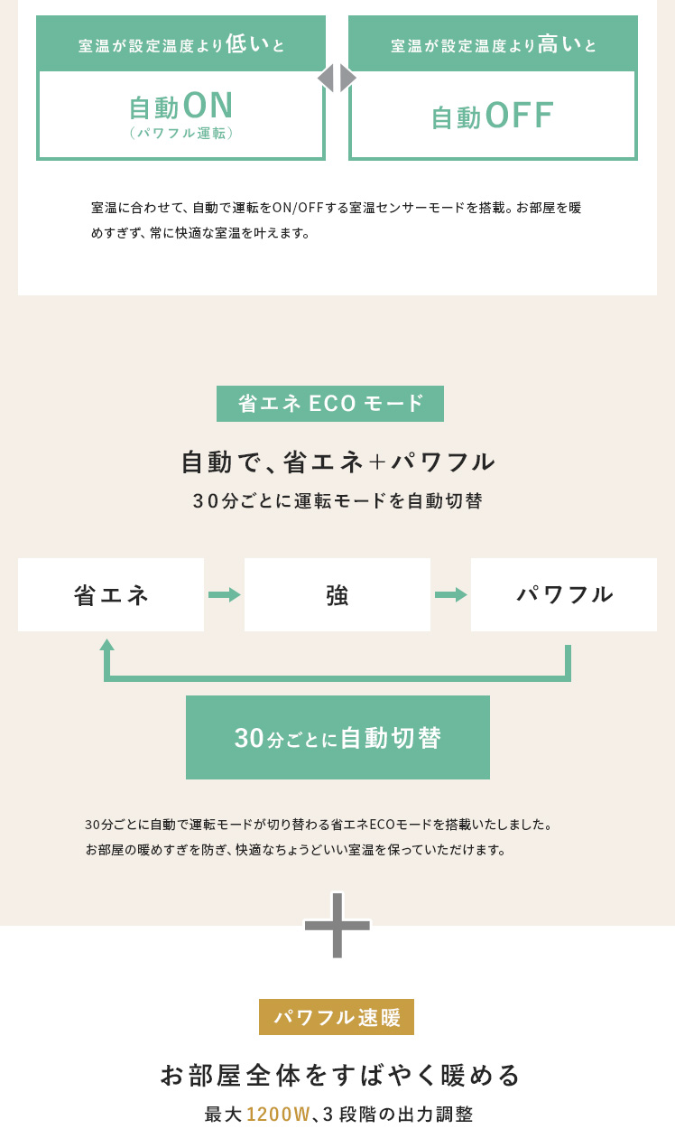 省エネセラミックヒーター WIDE ENA HEAT〔ワイドエナヒート〕/省エネも、速暖もお任せの、賢く温めるセラミックヒーター。最小わずか400Wの省エネモードで、消費電力を抑えながら使用可能。最大出力は1200Wで、パワフルにお部屋を暖めます♪人が近くにいる時だけ電源ONになる人感センサーを搭載。離れると自動でOFFになり、面倒な操作や、消し忘れによる電気代の無駄がなく経済的です。また、30分ごとに室温に自動で合わせてくれる省エネECOモードと、設定温度に合わせて自動で切り替えする室温センサーを搭載。お部屋の暖めすぎを防ぎ、快適な室温を保ちます。