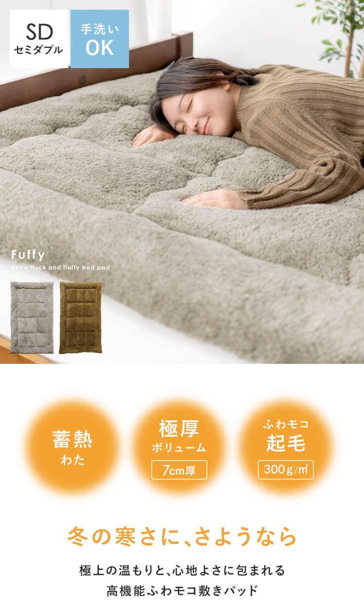 蓄熱機能付き冬用敷きパッド Fuffy〔ファフィー〕セミダブルサイズ/蓄熱×極厚×ふわモコ起毛。寒い冬の寝室を暖か快適に過ごすための機能を、ふんだんに詰め込んだ高性能冬用敷きパッド。熱を逃がさない蓄熱綿。体を包み込む約7cmの極厚ボリューム。ふわふわモコモコ、肌触りも心地よい長毛シープボア生地。薄っぺらい一般的な敷きパッドでは絶対に体験できない、極上の温もりと心地よさで、冬の寒さを忘れて至福の眠りを。