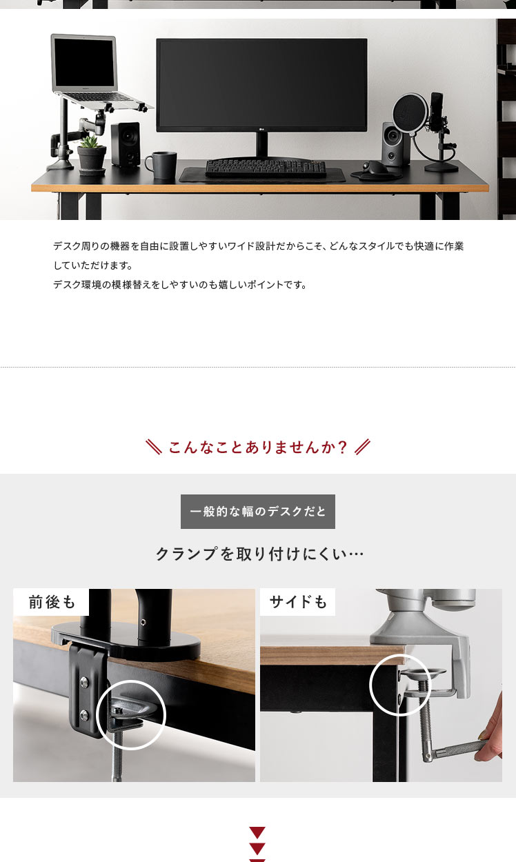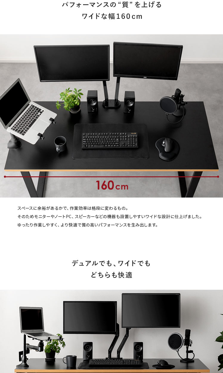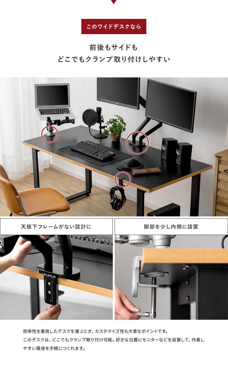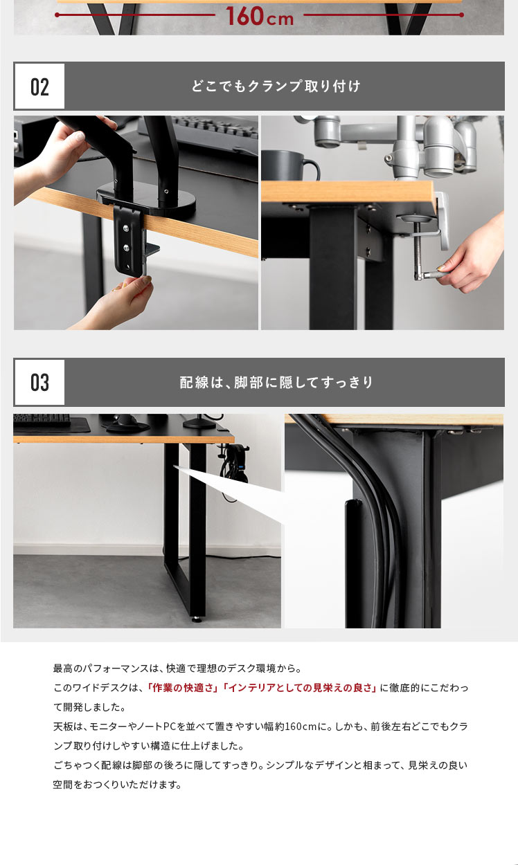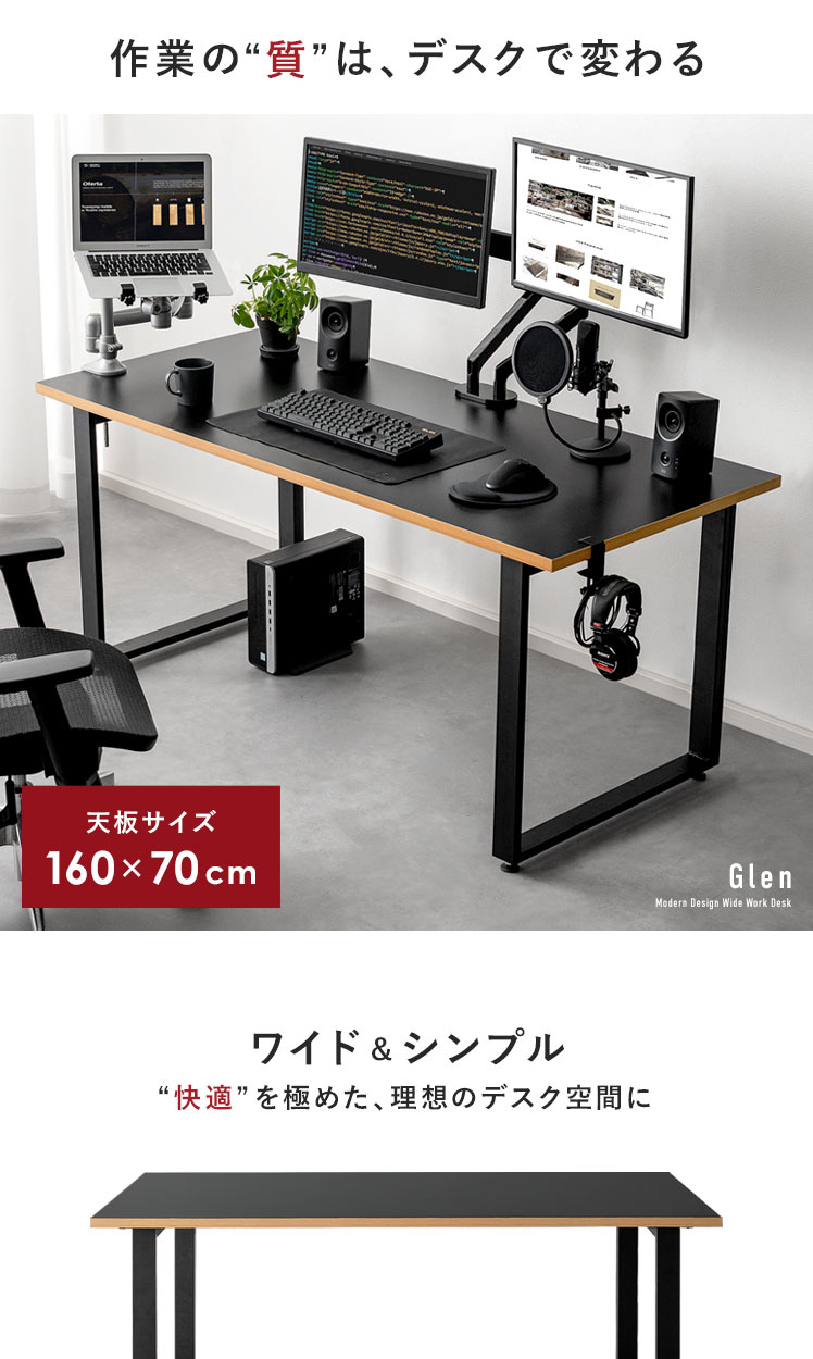 ワイドワークデスク Glen〔グレン〕/最高のパフォーマンスは、快適で理想のデスク環境から。このワイドデスクは、「作業の快適さ」「インテリアとしての見栄えの良さ」に徹底的にこだわって開発しました。天板は、モニターやノートPCを並べて置きやすい幅約160cmに。しかも、前後左右どこでもクランプ取り付けしやすい構造に仕上げました。ごちゃつく配線は脚部の後ろに隠してすっきり。シンプルなデザインと相まって、見栄えの良い空間をおつくりいただけます。