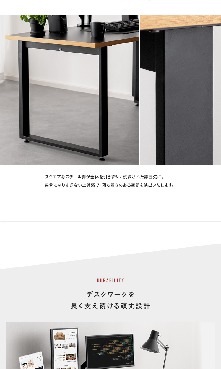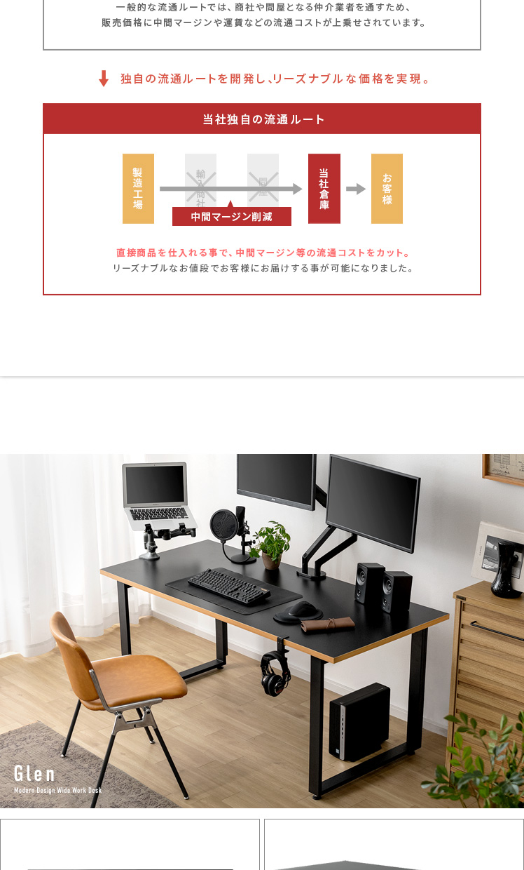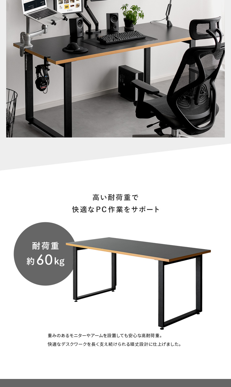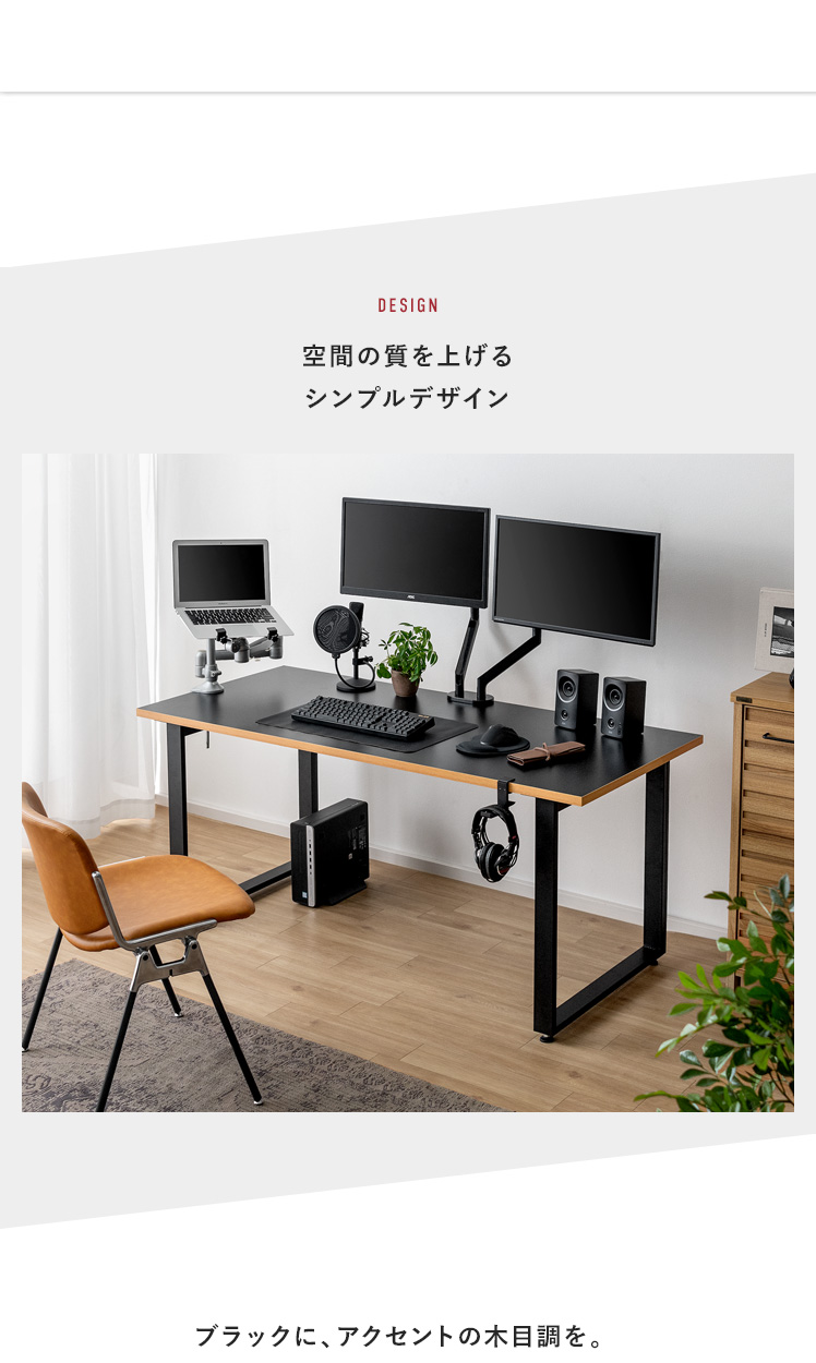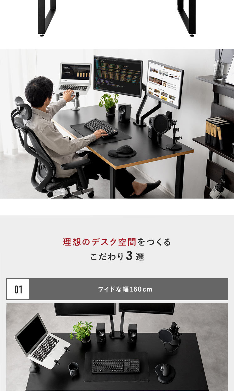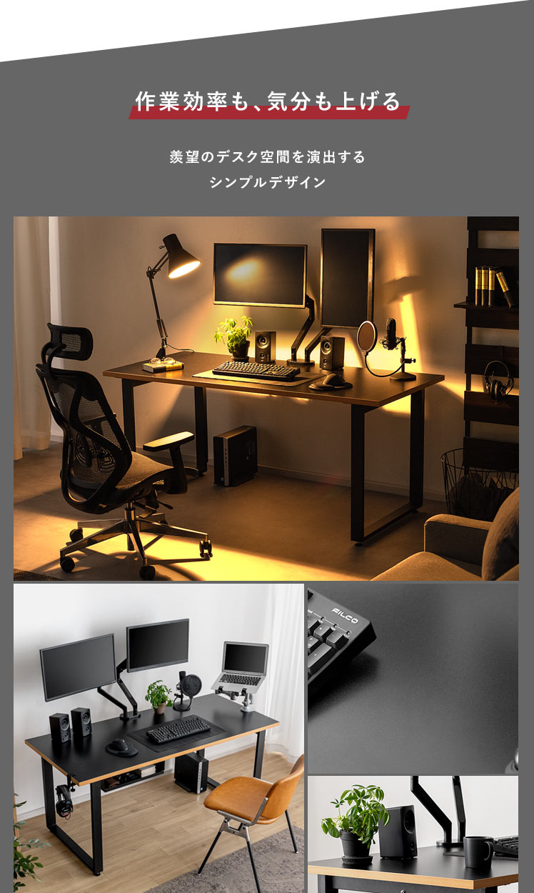 ワイドワークデスク Glen〔グレン〕/最高のパフォーマンスは、快適で理想のデスク環境から。このワイドデスクは、「作業の快適さ」「インテリアとしての見栄えの良さ」に徹底的にこだわって開発しました。天板は、モニターやノートPCを並べて置きやすい幅約160cmに。しかも、前後左右どこでもクランプ取り付けしやすい構造に仕上げました。ごちゃつく配線は脚部の後ろに隠してすっきり。シンプルなデザインと相まって、見栄えの良い空間をおつくりいただけます。