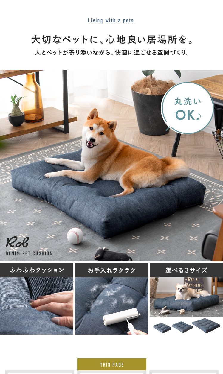 デニムデザイン ペットクッション Rob〔ロブ〕 Mサイズ/様々なインテリアに馴染むデニム風生地のペットクッション。ノンウォッシュデニムの落ち着いた風合いで、雰囲気ある空間づくりをしていただけます。また、デザイン性だけでなく、使用時の心地良さも追及しました。弾力性のあるウレタンをたっぷりの柔らかい中綿でサンドイッチしたことで、底付き感ゼロの贅沢な厚みを実現しております。お部屋のコーディネートに溶け込みつつ大切なペットにも快適な安らぎ空間を。