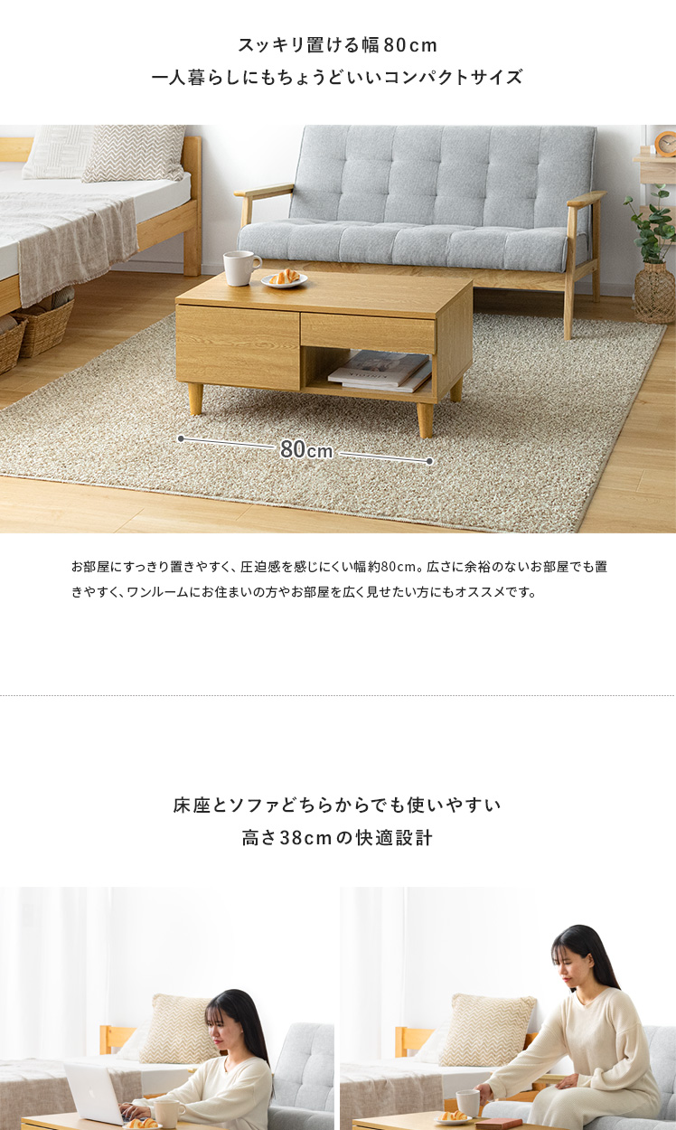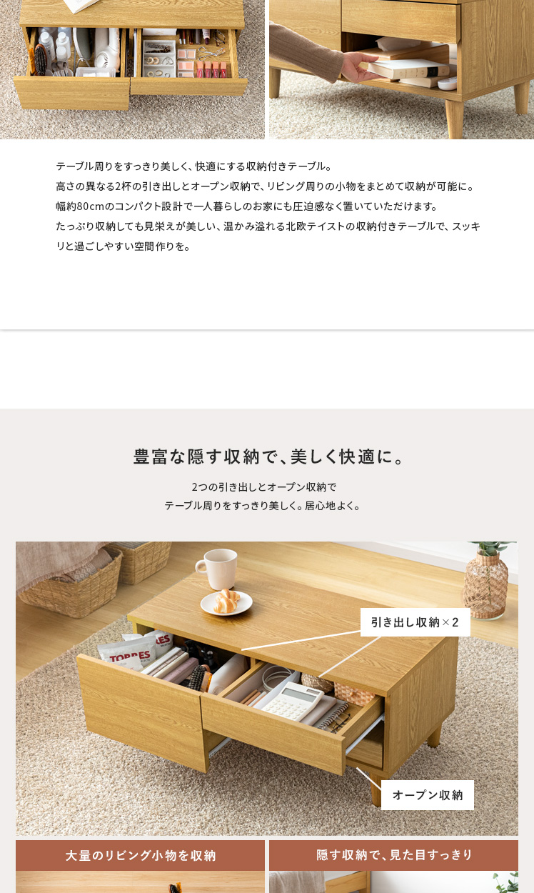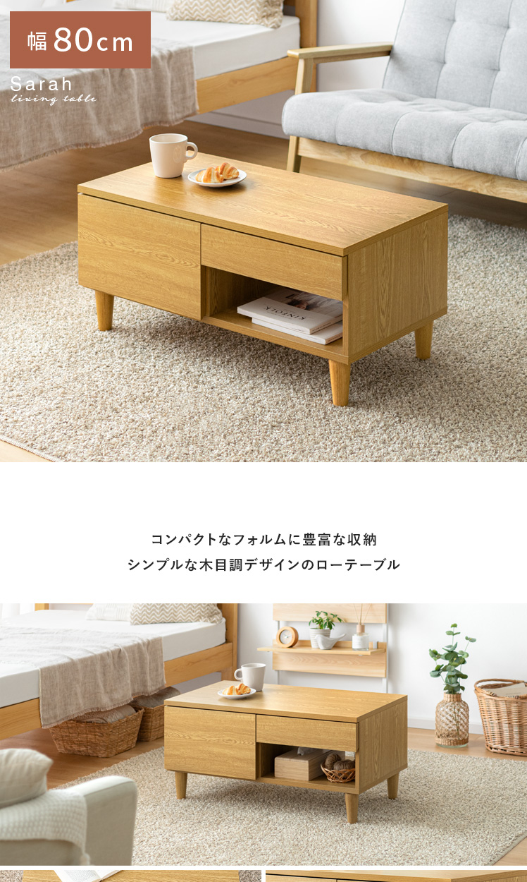 収納付きリビングテーブル Sarah〔サラ〕/テーブル周りをすっきり美しく、快適にする収納付きテーブル。高さの異なる2杯の引き出しとオープン収納で、リビング周りの小物をまとめて収納が可能に。幅約80cmのコンパクト設計で一人暮らしのお家にも圧迫感なく置いていただけます。たっぷり収納しても見栄えが美しい、温かみ溢れる北欧テイストの収納付きテーブルで、スッキリと過ごしやすい空間作りを。