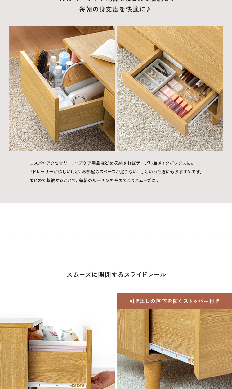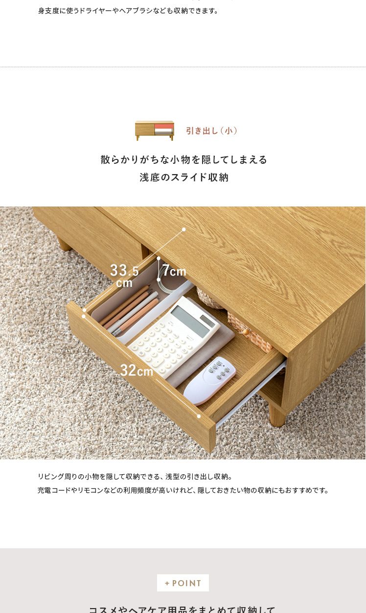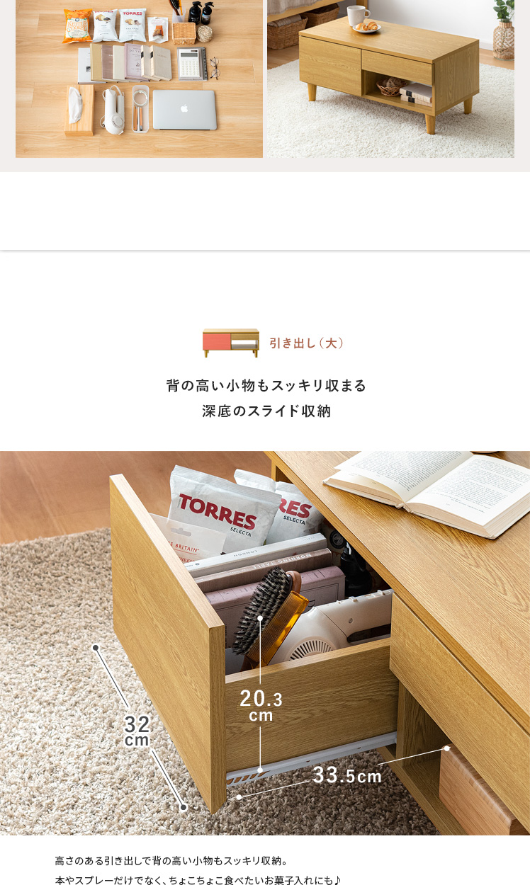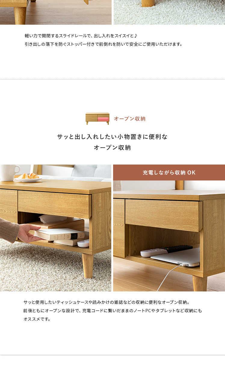 収納付きリビングテーブル Sarah〔サラ〕/テーブル周りをすっきり美しく、快適にする収納付きテーブル。高さの異なる2杯の引き出しとオープン収納で、リビング周りの小物をまとめて収納が可能に。幅約80cmのコンパクト設計で一人暮らしのお家にも圧迫感なく置いていただけます。たっぷり収納しても見栄えが美しい、温かみ溢れる北欧テイストの収納付きテーブルで、スッキリと過ごしやすい空間作りを。
