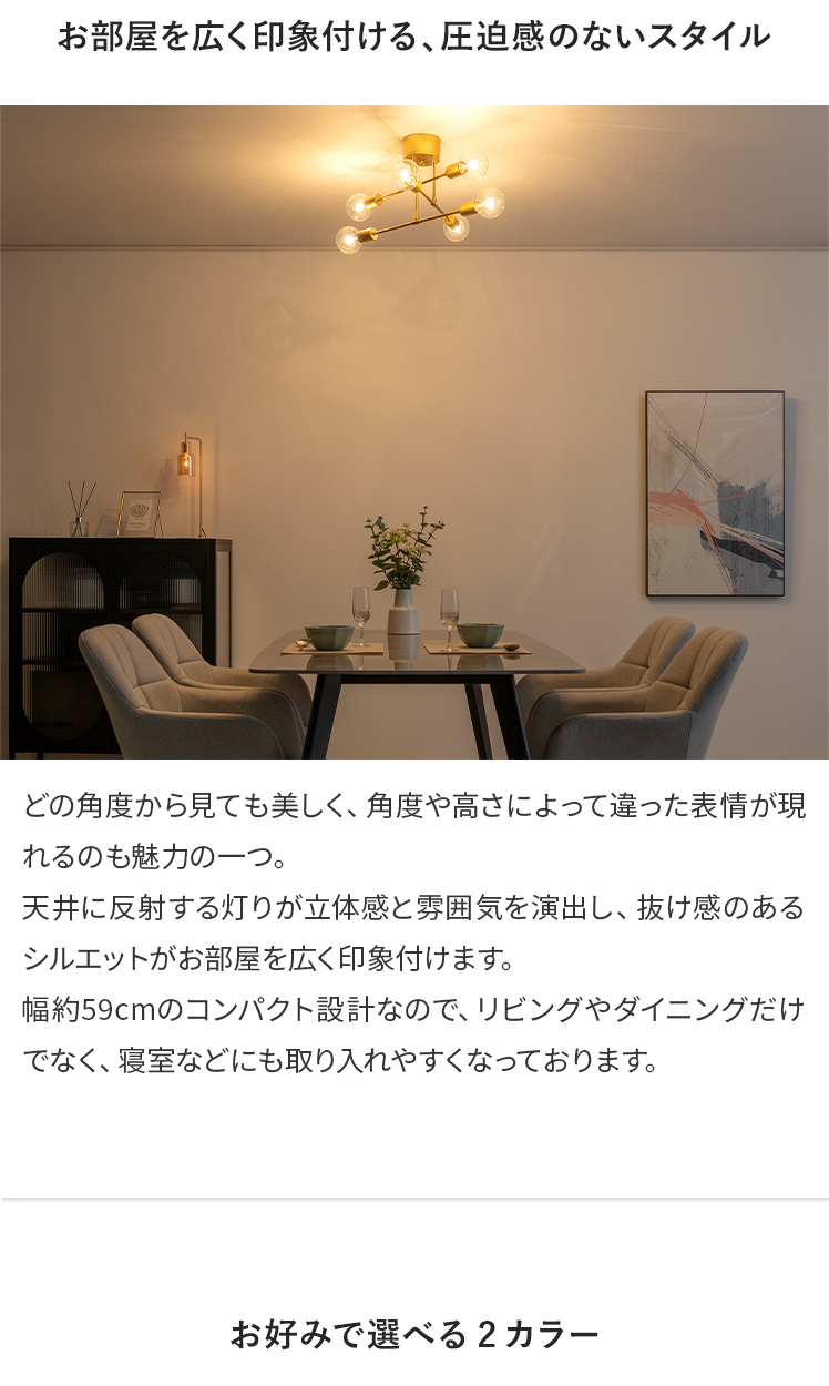 見る角度によって表情を変える存在感のあるフォルムが、オブジェのように空間を彩り、昼夜問わずいつも素敵なお部屋に。
