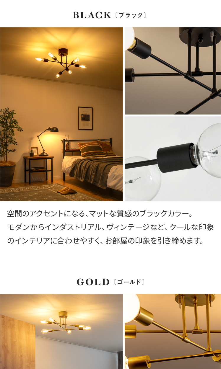 お部屋の雰囲気に合わせて、マットな質感のブラックと、艶を抑えた滑らかな質感のゴールドからお選びいただけます。