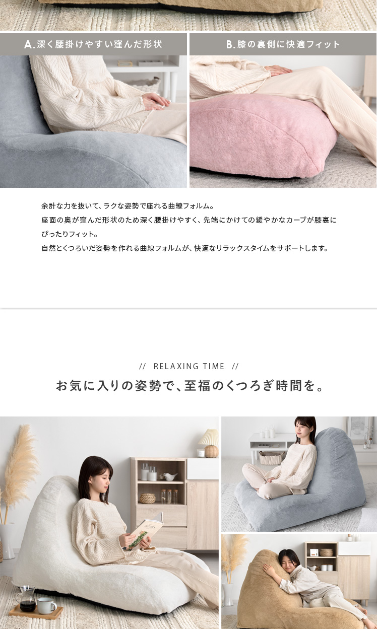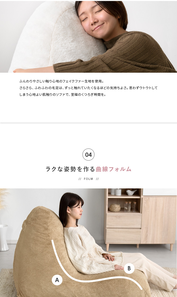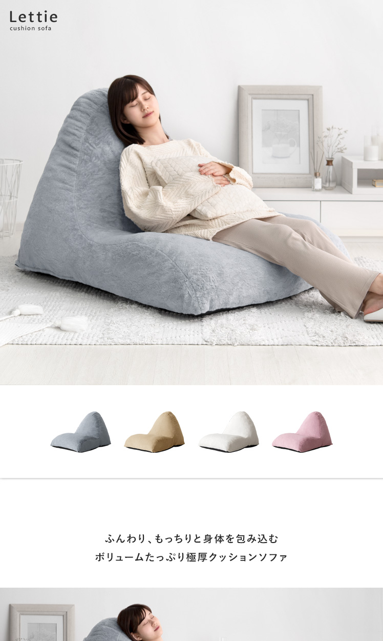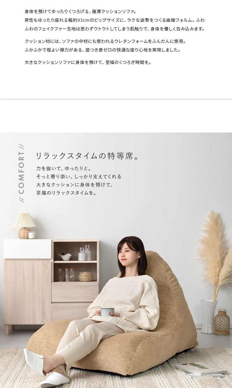 クッションソファ Lettie〔レティ〕/身体を預けてゆったりくつろげる、極厚クッションソファ。男性もゆったり座れる幅約93cmのビッグサイズに、ラクな姿勢をつくる曲線フォルム。ふわふわのフェイクファー生地は思わずウトウトしてしまう肌触りで、身体を優しく包み込みます。クッション材には、ソファの中材にも使われるウレタンフォームをふんだんに使用。ふかふかで程よい弾力がある、底つき感ゼロの快適な座り心地を実現しました。大きなクッションソファに身体を預けて、至福のくつろぎ時間を。