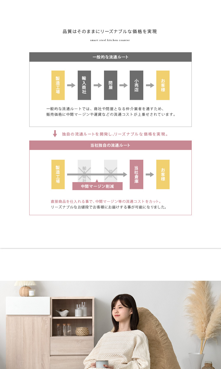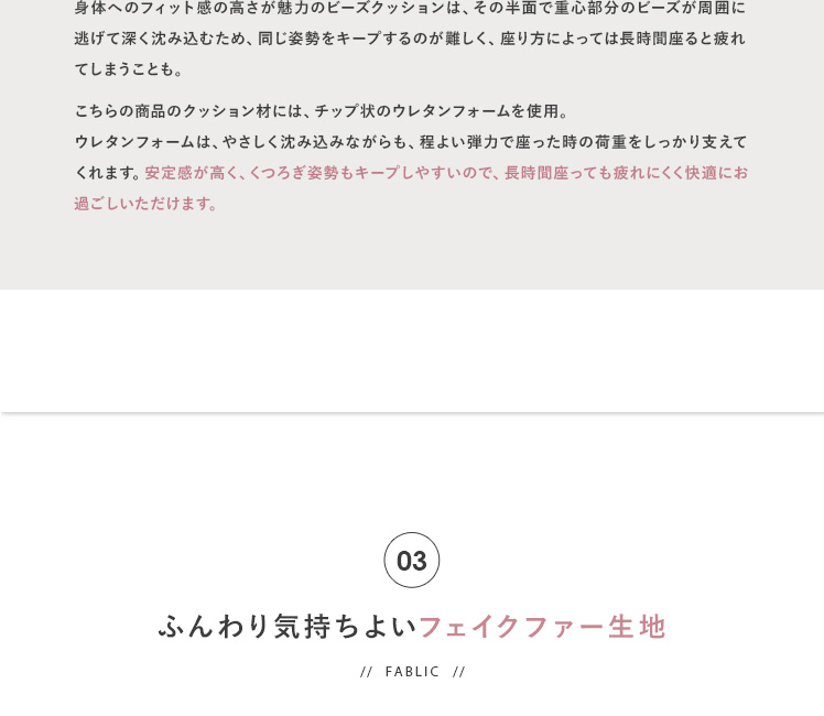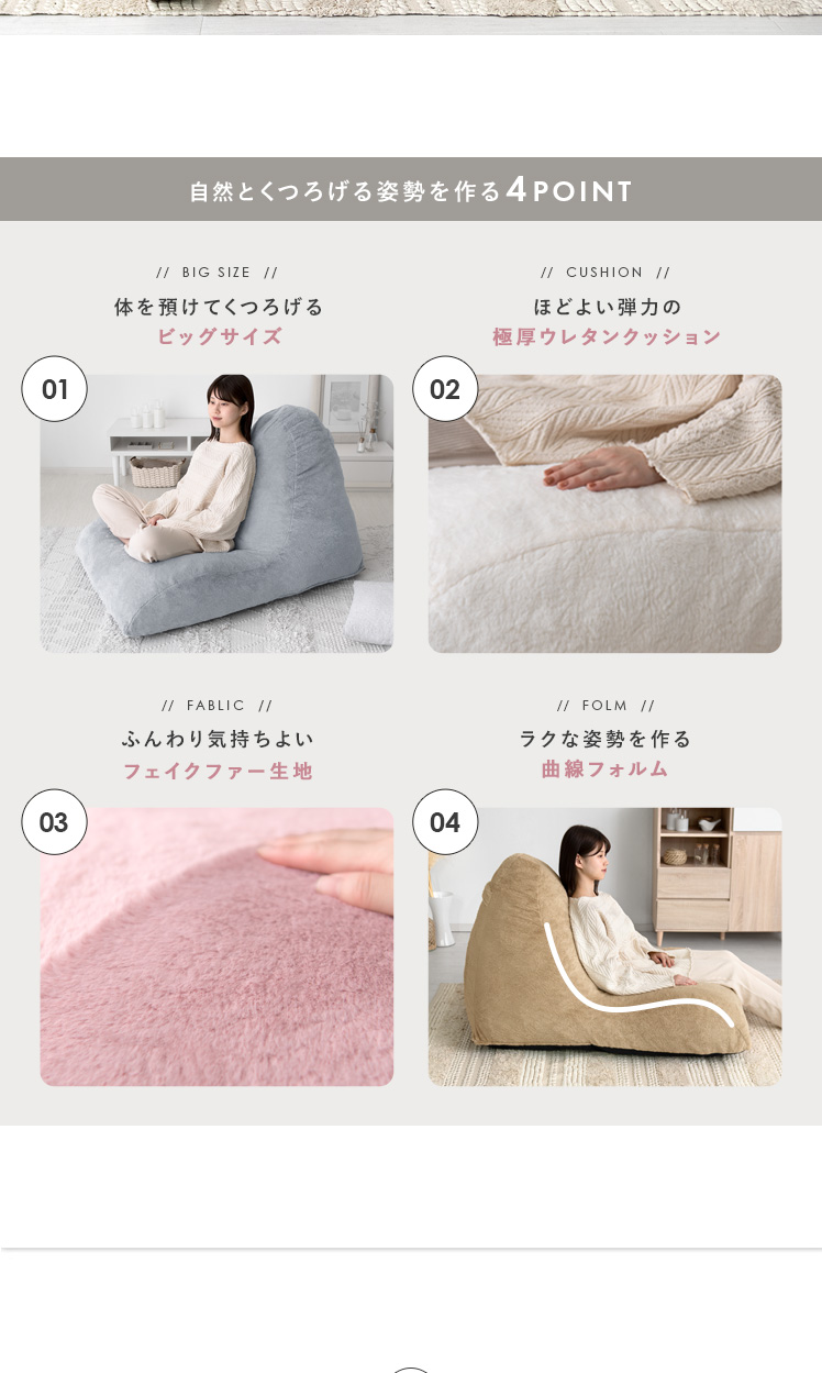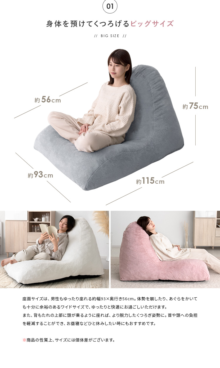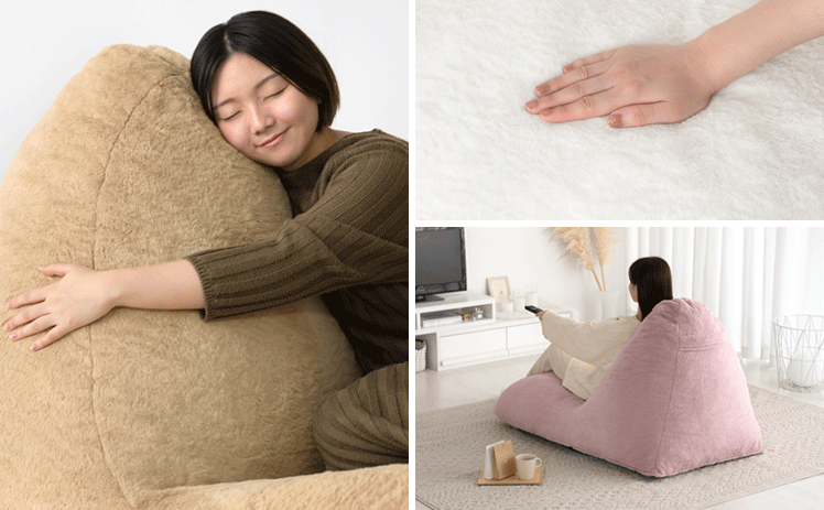 クッションソファ Lettie〔レティ〕/身体を預けてゆったりくつろげる、極厚クッションソファ。男性もゆったり座れる幅約93cmのビッグサイズに、ラクな姿勢をつくる曲線フォルム。ふわふわのフェイクファー生地は思わずウトウトしてしまう肌触りで、身体を優しく包み込みます。クッション材には、ソファの中材にも使われるウレタンフォームをふんだんに使用。ふかふかで程よい弾力がある、底つき感ゼロの快適な座り心地を実現しました。大きなクッションソファに身体を預けて、至福のくつろぎ時間を。
