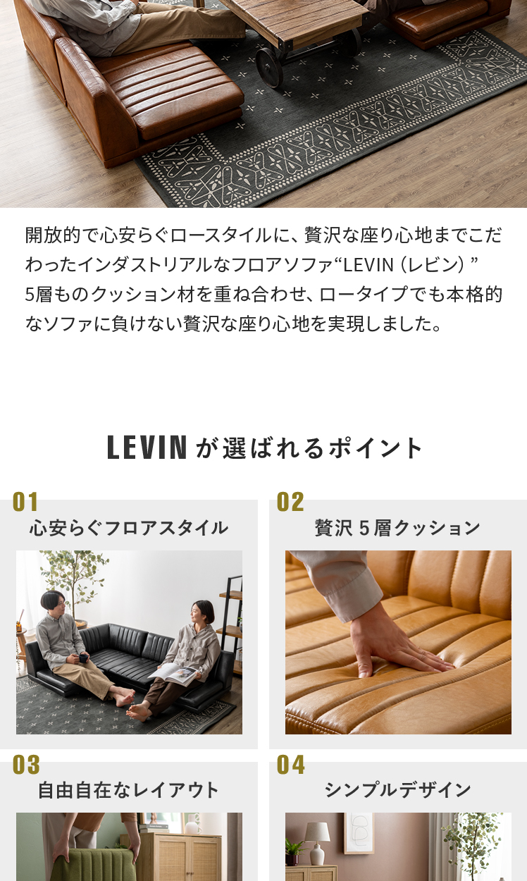 ヴィンテージデザイン ローソファ LEVIN〔レビン〕/開放的で心安らぐロースタイルに、贅沢な座り心地までこだわったフロアソファ。ウレタンフォームや鋼製バネを含む5層ものクッション材を重ね合わせ、ロータイプでも本格的なソファに負けない贅沢な座り心地を実現しております。また、ヴィンテージな雰囲気を感じられるPUレザーを合わせた高いデザイン性も兼ね備え、開放的なヴィンテージ空間を演出していただけます。